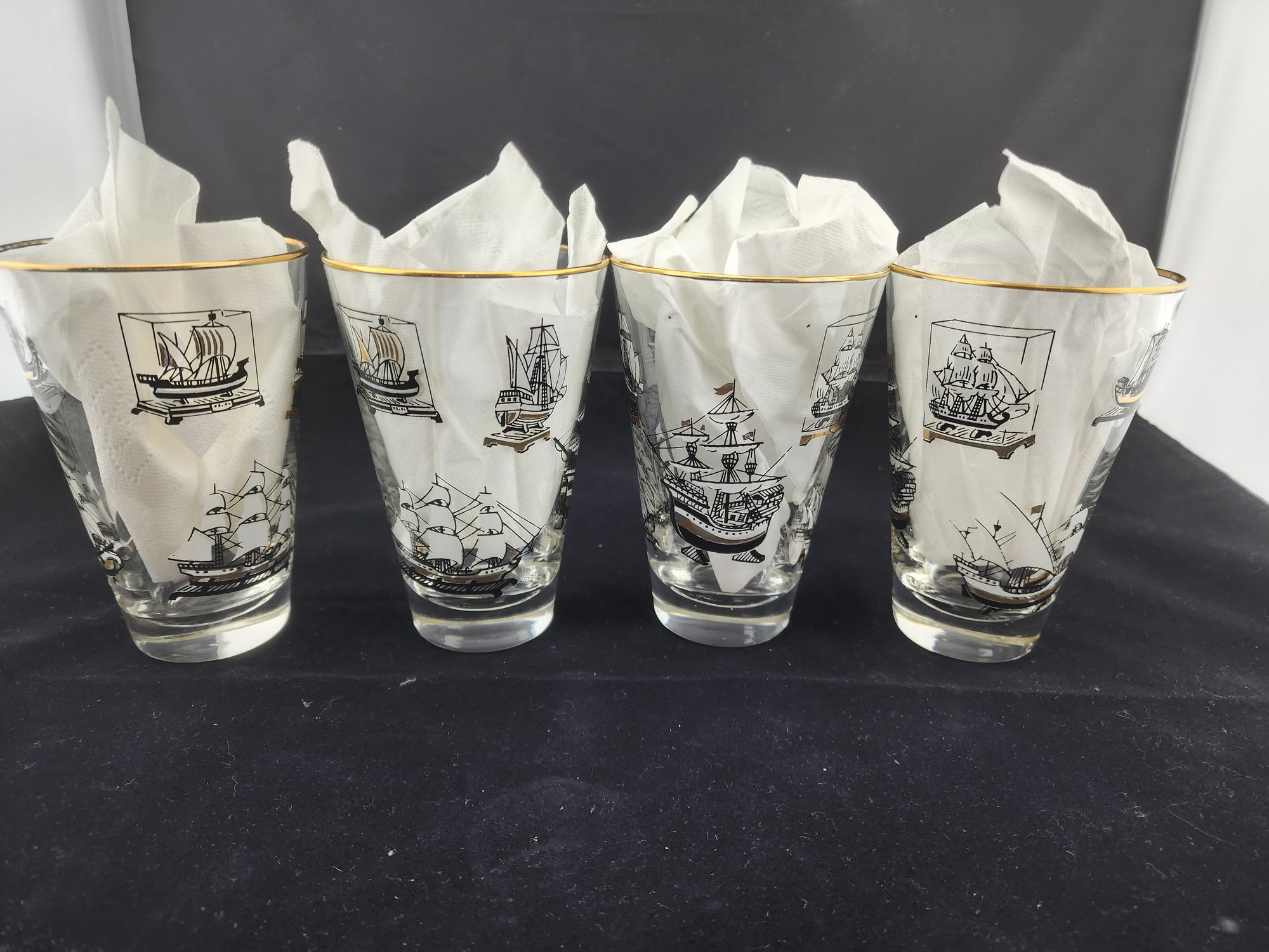Set of 4, gold rimmed Libbey pint glasses featuring a variety of sailing ships in gold, black and white.