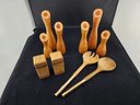 Salad serving set with brass handles, cubic salt and pepper set and 6 candle holders