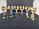 Six adorable Goebel classic Hummel figurines (made in W Germany) incorporated into glass etched wine glasses, with gold applied.