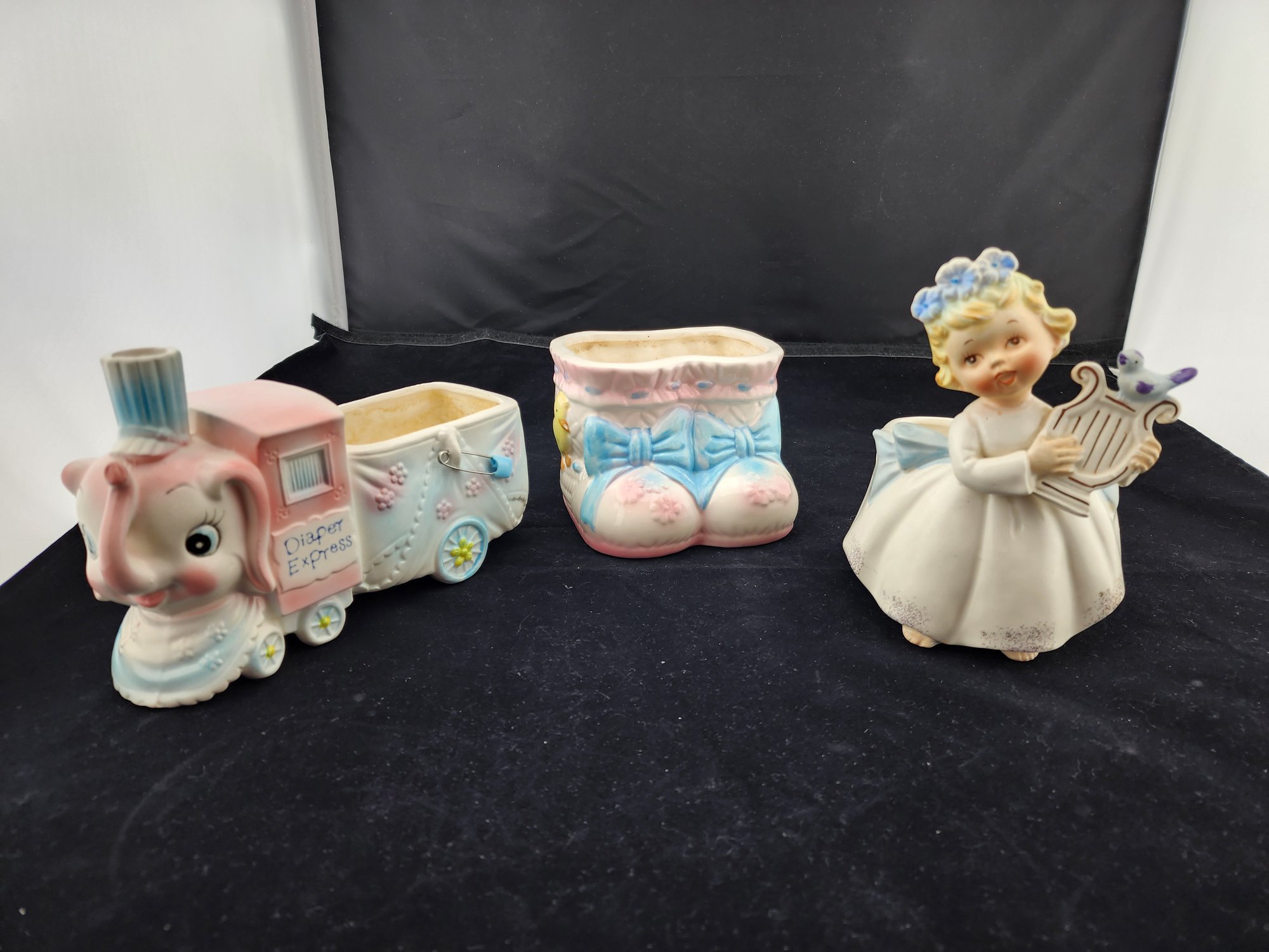 Three vintage planters, two are Napcoware baby-themed, and one Lefton's Angelica.