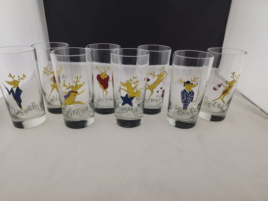 Adorable set of Rudolph's 8 reindeer buddies just in time for Christmas! This 2003 discontinued Pottery Barn 12 oz glass tumbler set features each reindeer in the group. Great condition