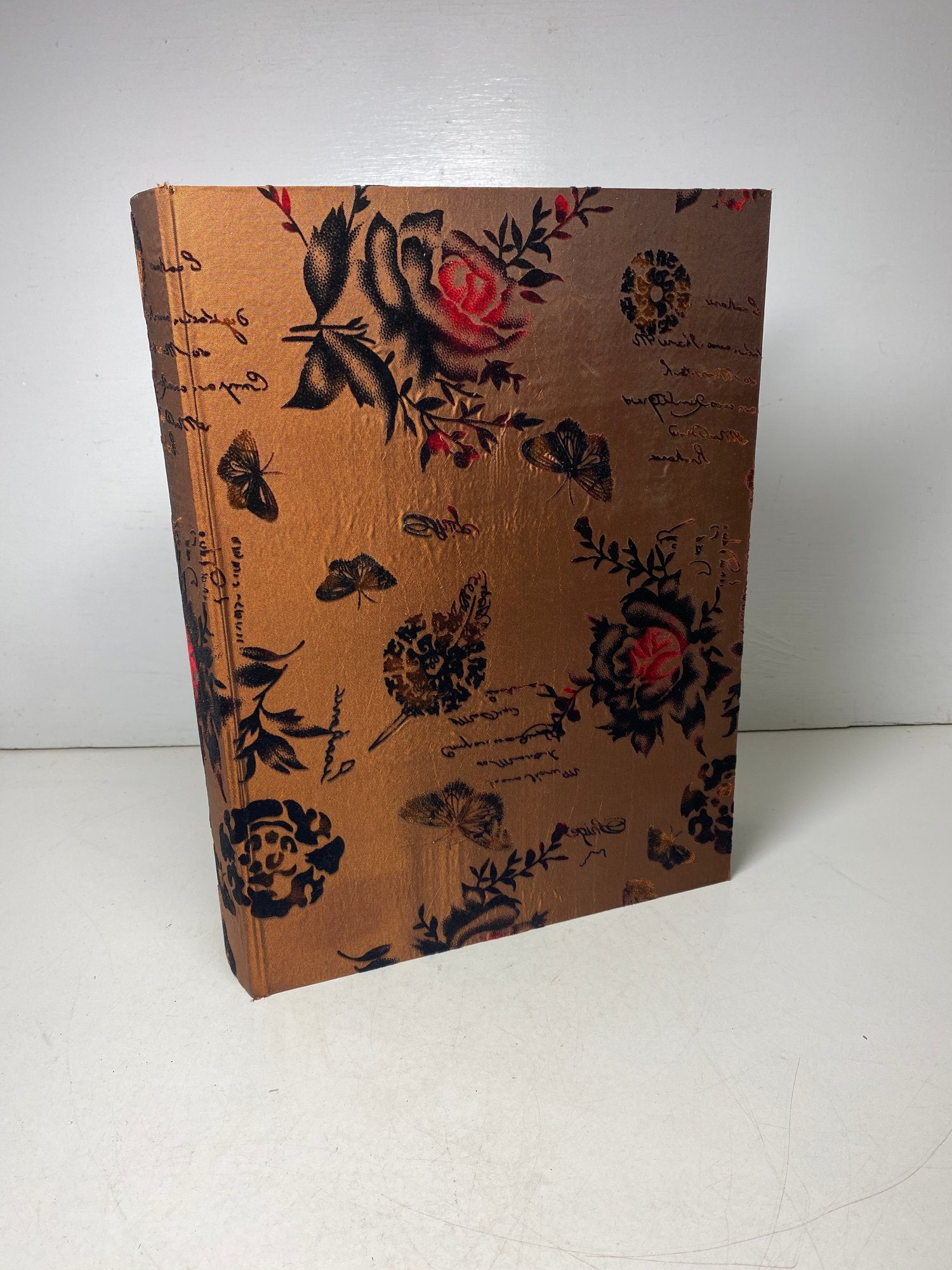 This beautiful box has a couple of tattered edges on the outside but it looks like new on the inside! It’s a very nice quality box and has a ton of life left in it! It measures 14.25” long,10.5” wide, and just over 3” deep.