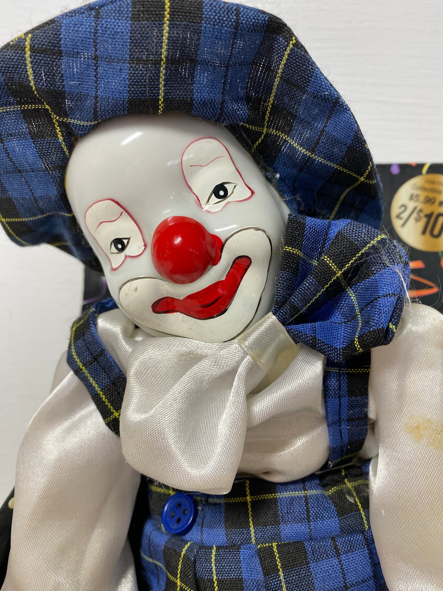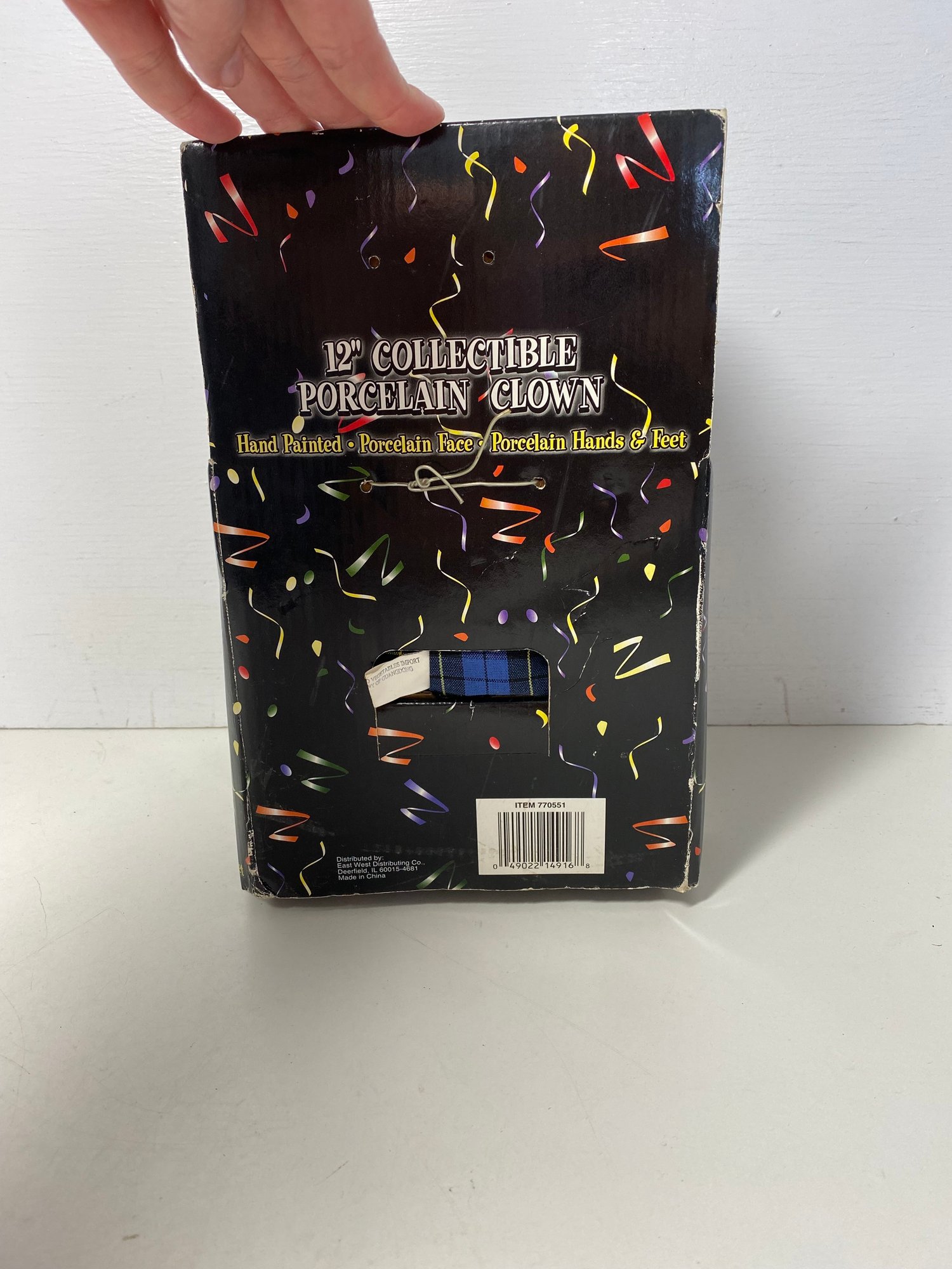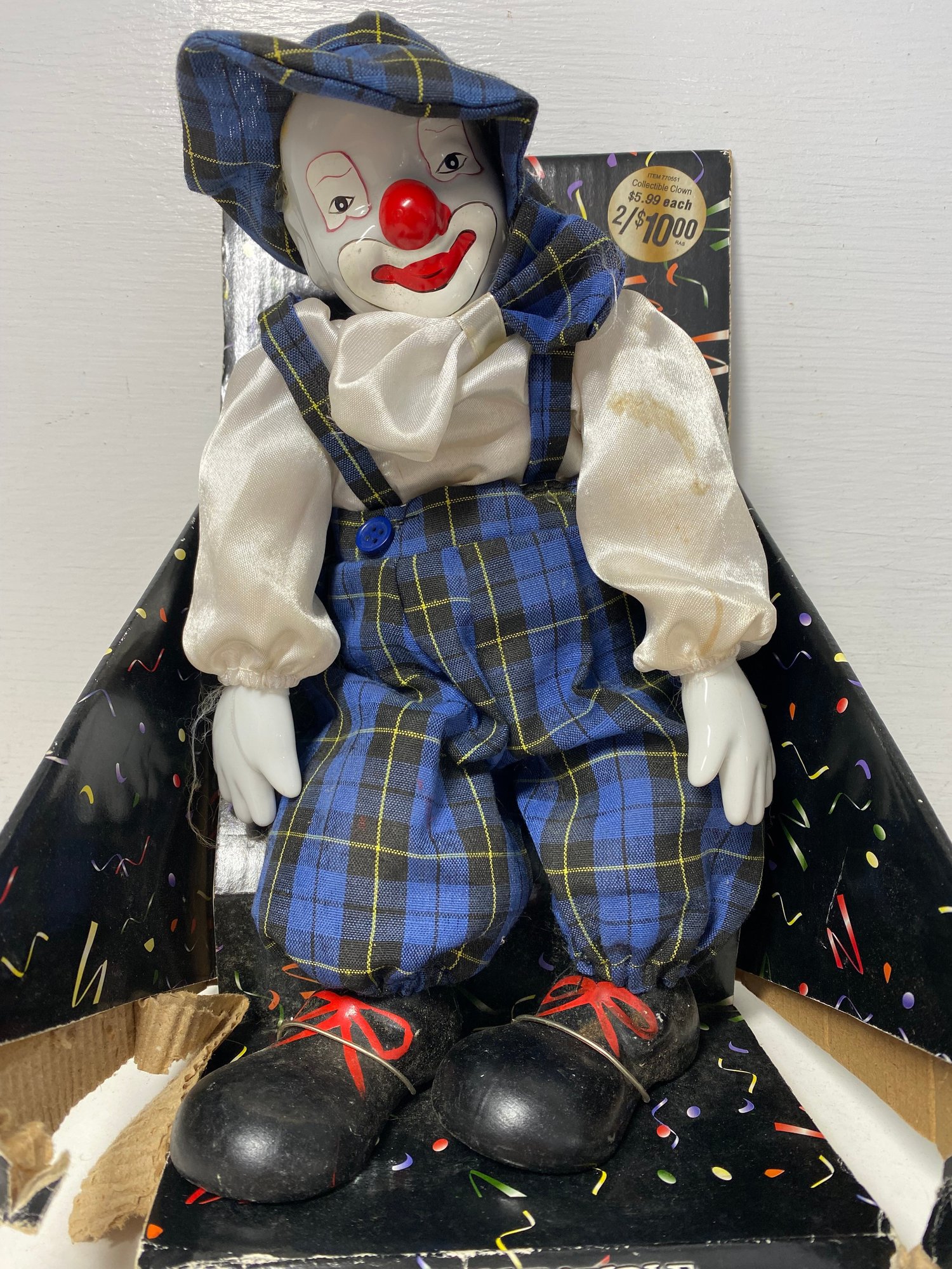 This collectible clown is in good condition his white shirt just has some stains on it, it maybe able to clean up. The box he is in is heavily damaged. He would be a good addition to your collection!