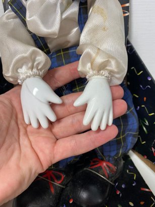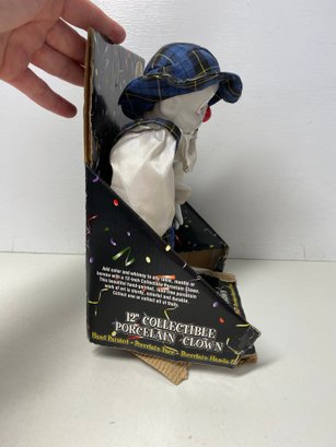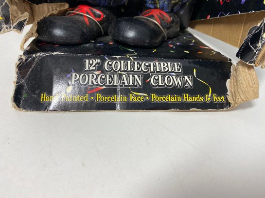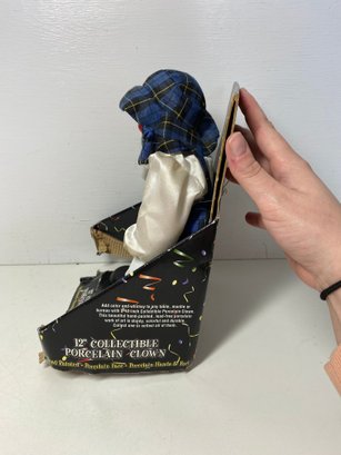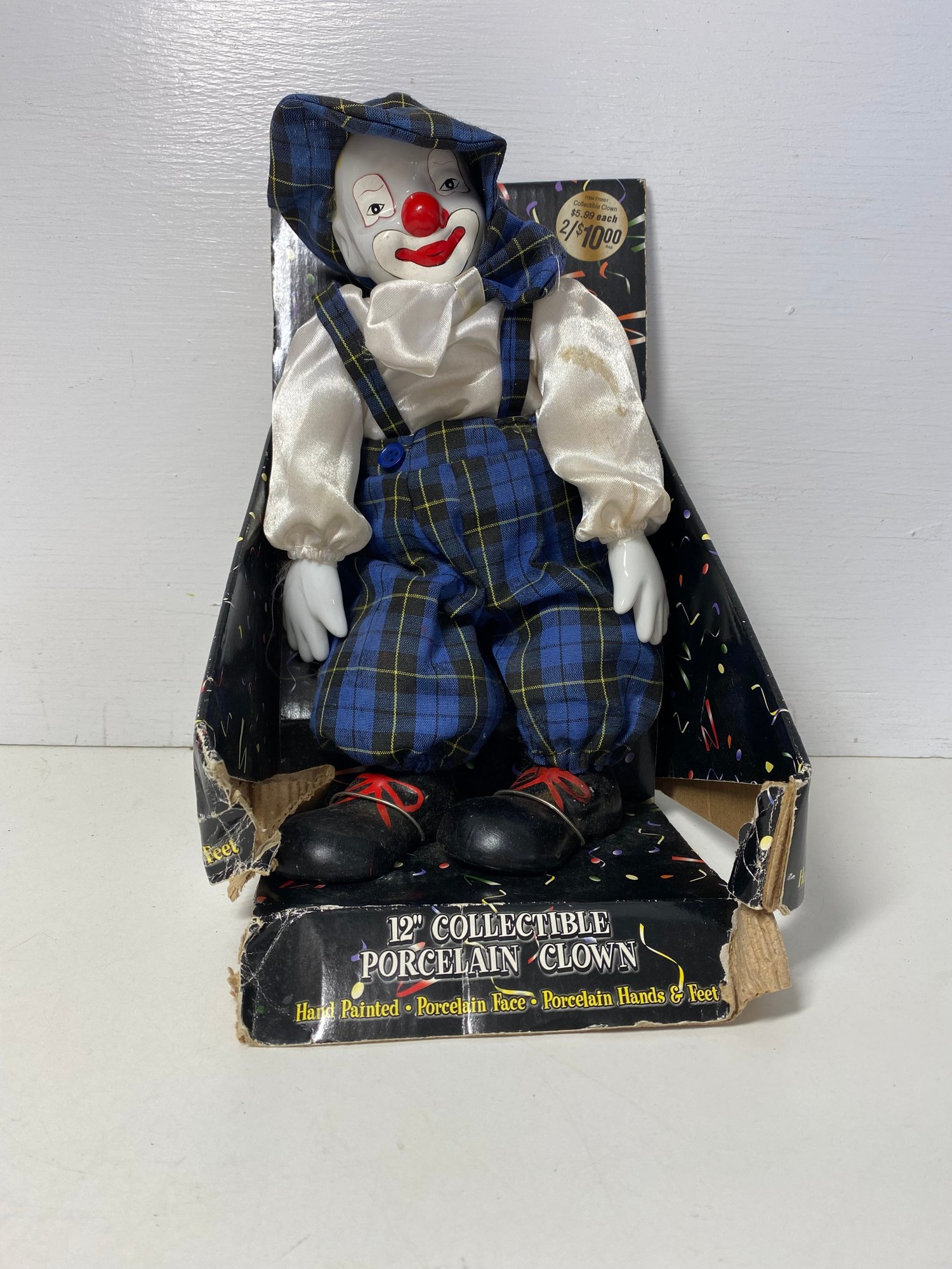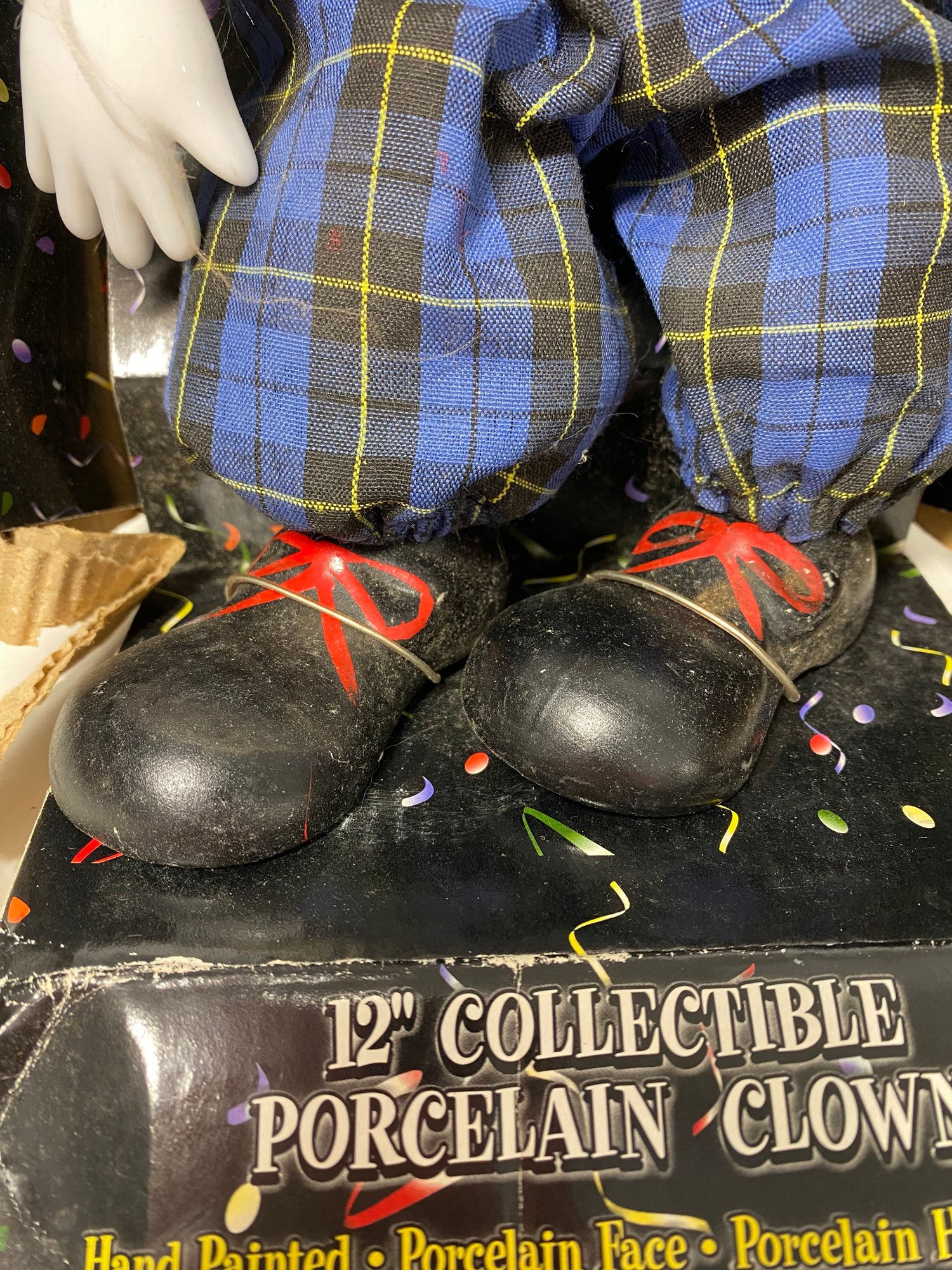 This collectible clown is in good condition his white shirt just has some stains on it, it maybe able to clean up. The box he is in is heavily damaged. He would be a good addition to your collection!