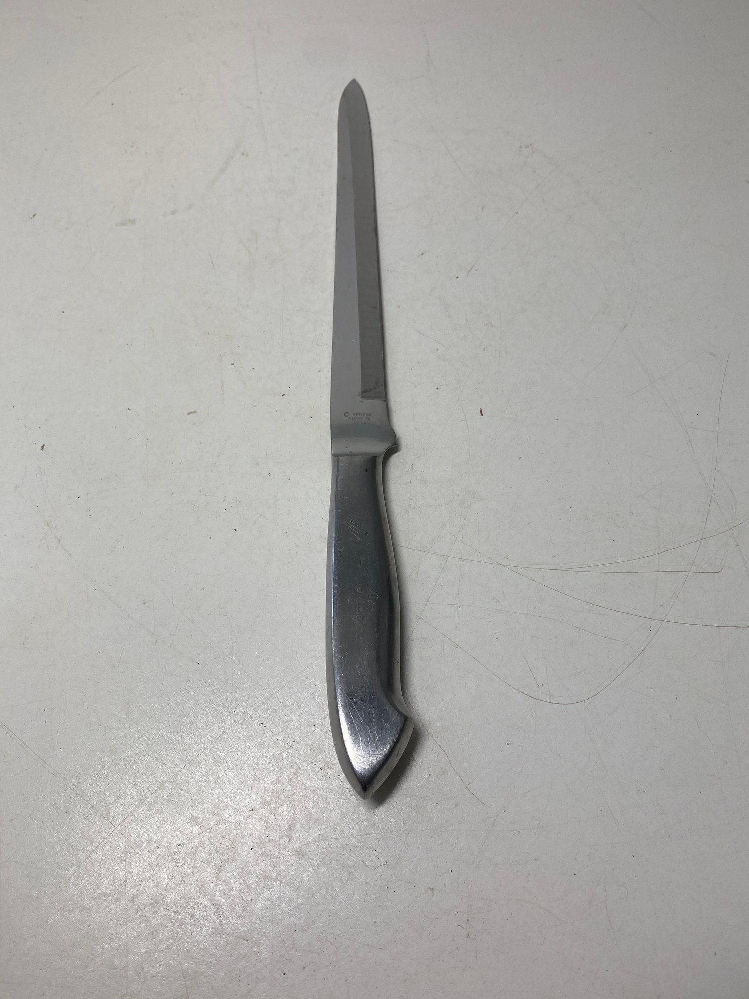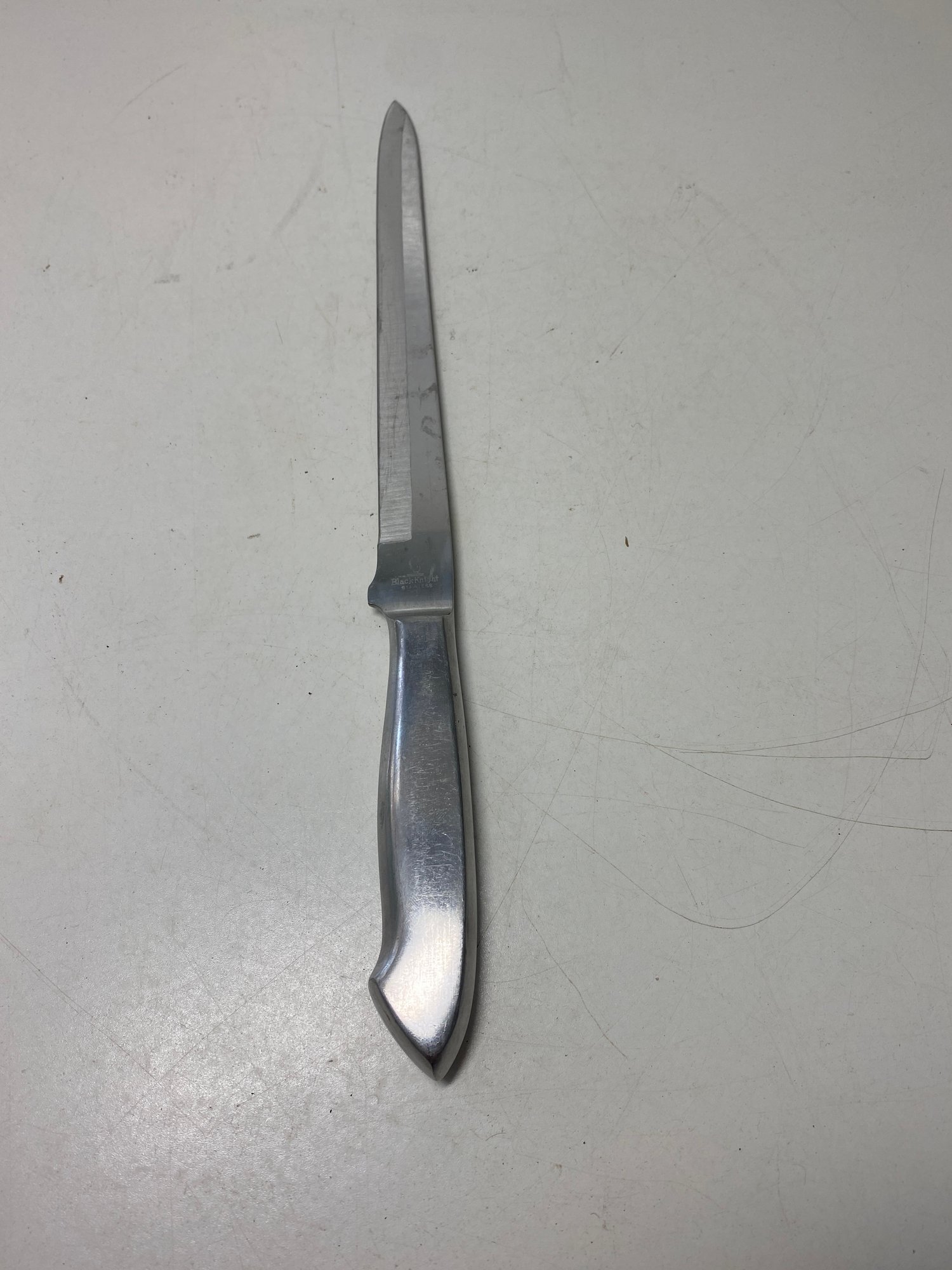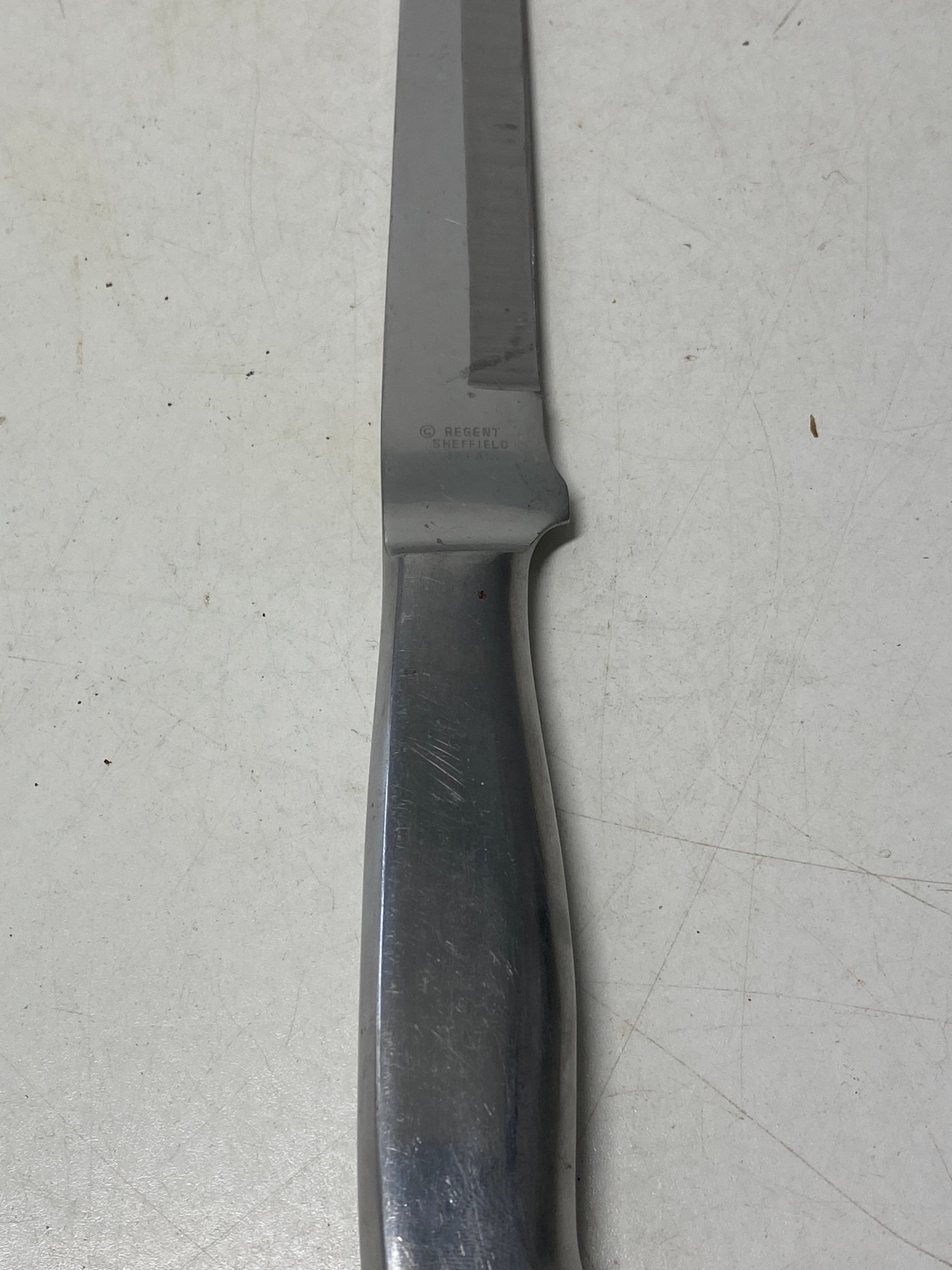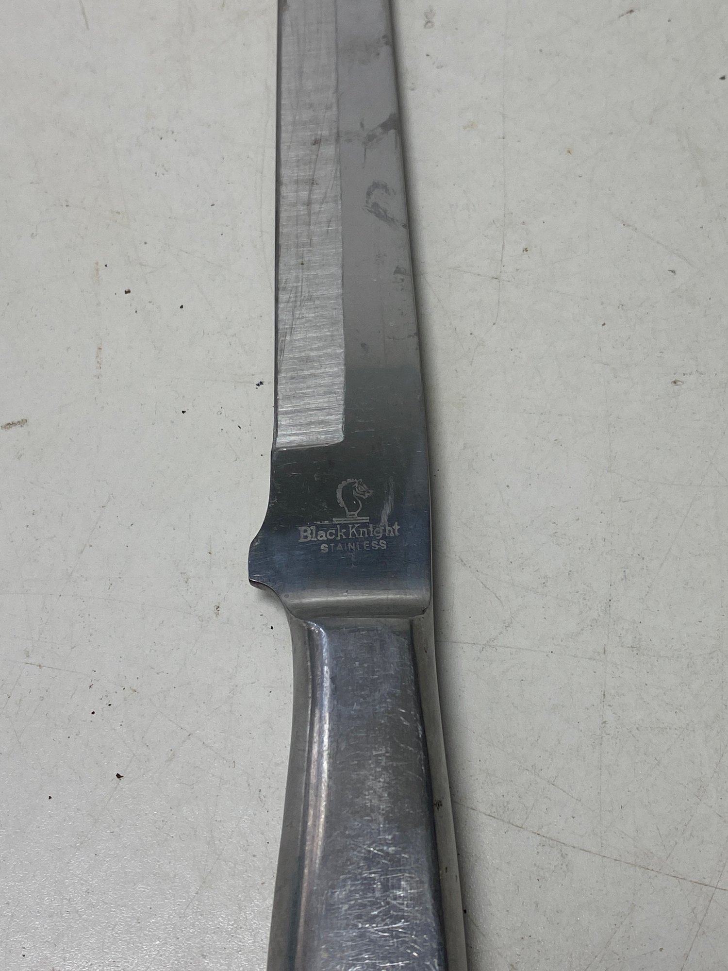 This knife has some minor scratches but is completely functional and is a nice quality knife! It is a regent Sheffield black knight stainless steel knife and measures 14.5” long.