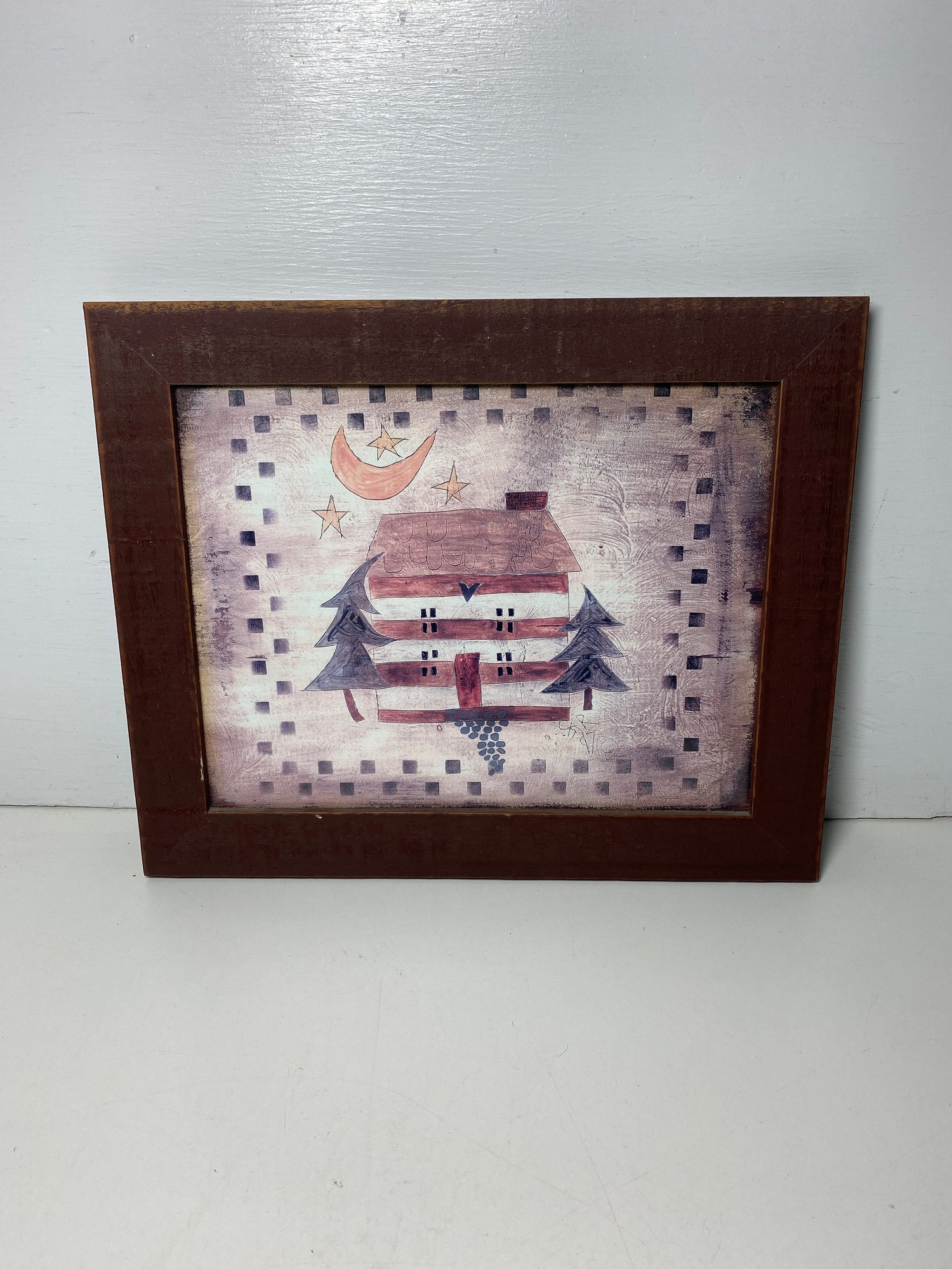 This wall hanging is in excellent condition and doesn’t appear to have any flaws on the front! The back has one small hole in the paper backing but I don’t see any other flaws. This print is signed but I can’t make out the signature. The frame measures 14” wide and 11.75” long.