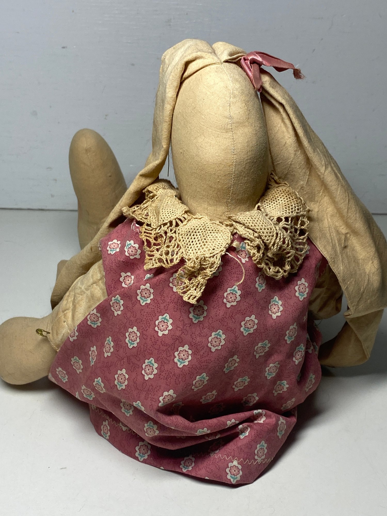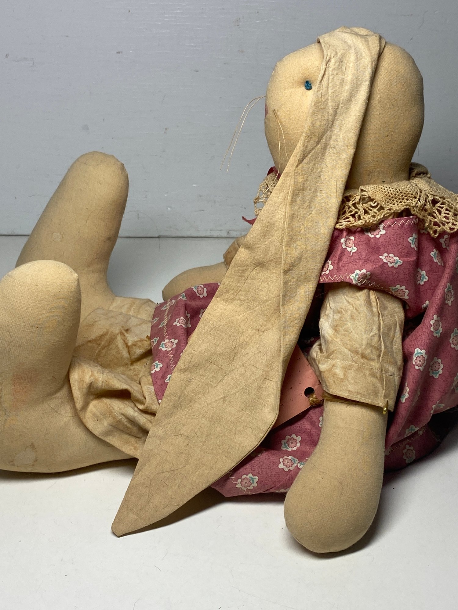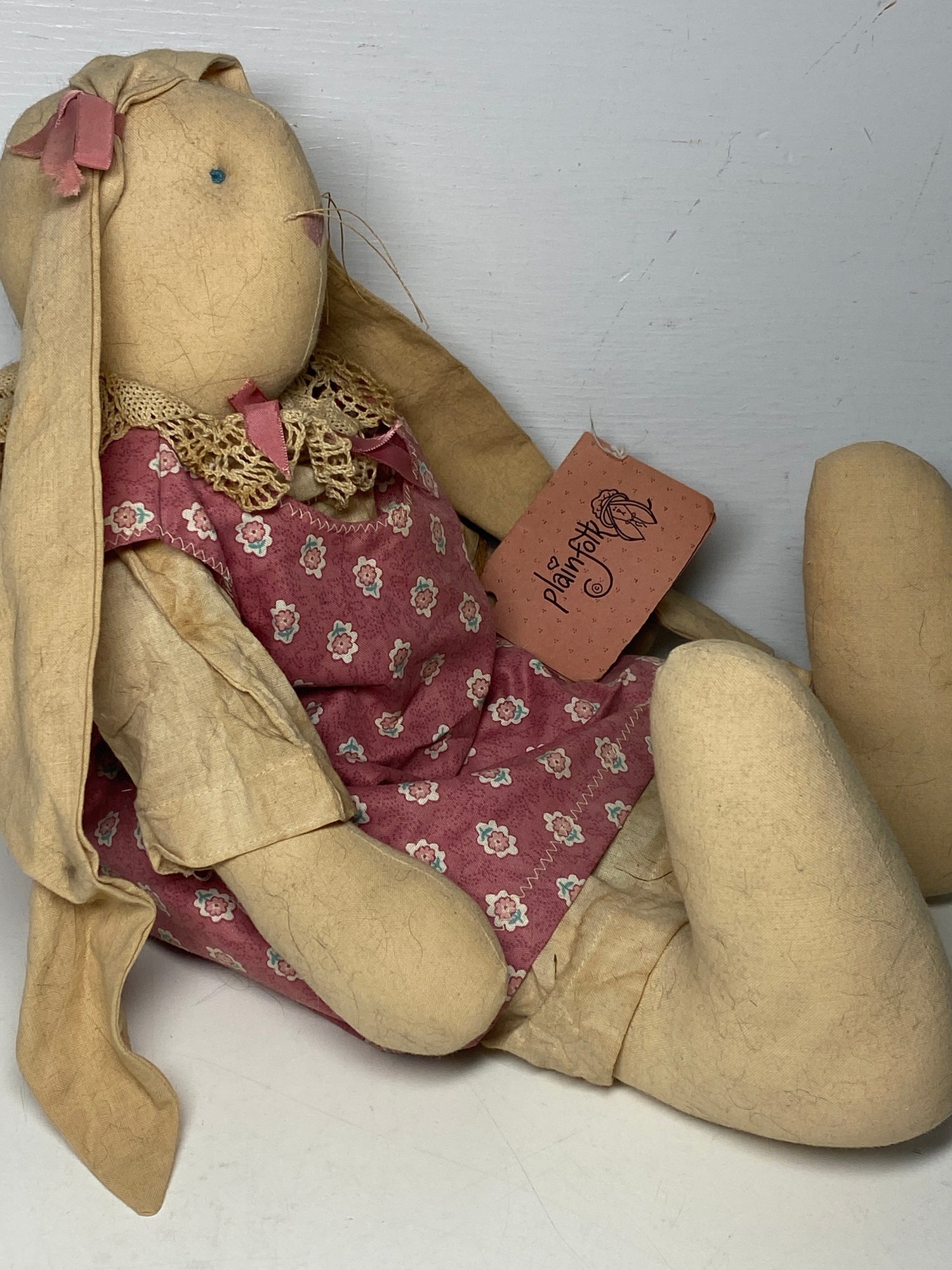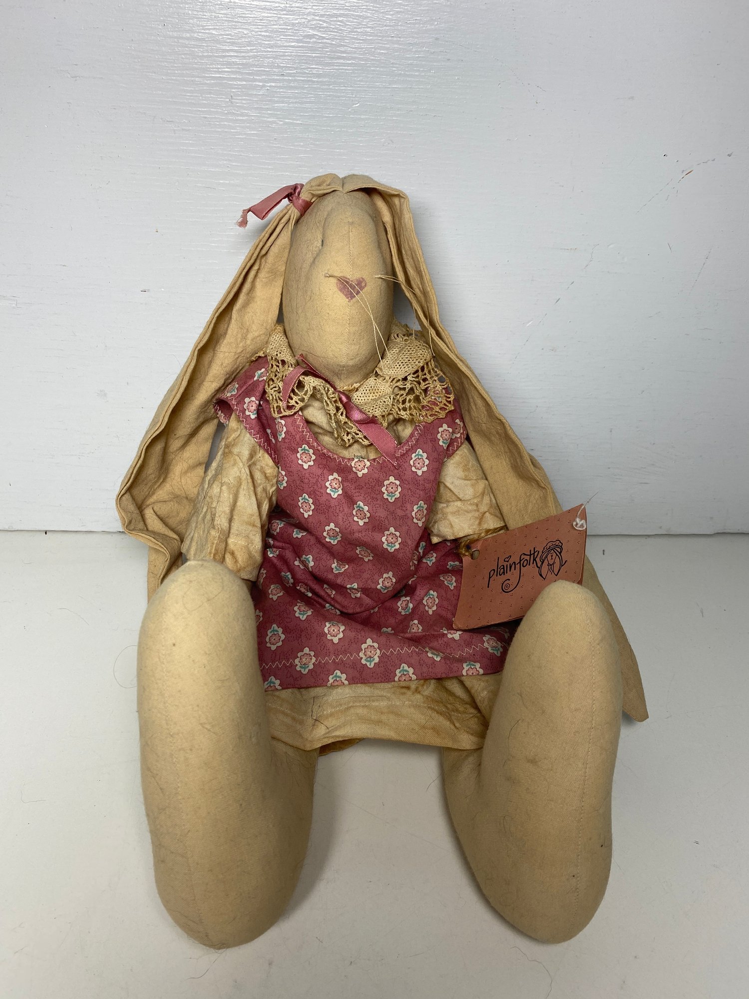 This rabbit has some discolored spots and some minor stains throughout that would most likely clean up in the wash. The tag is a plain folk tag and the rabbit’s name is Norma Jean. The rabbit measures 18” tall.
