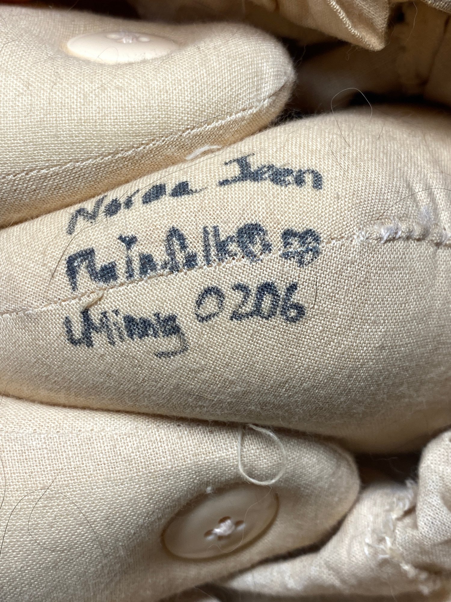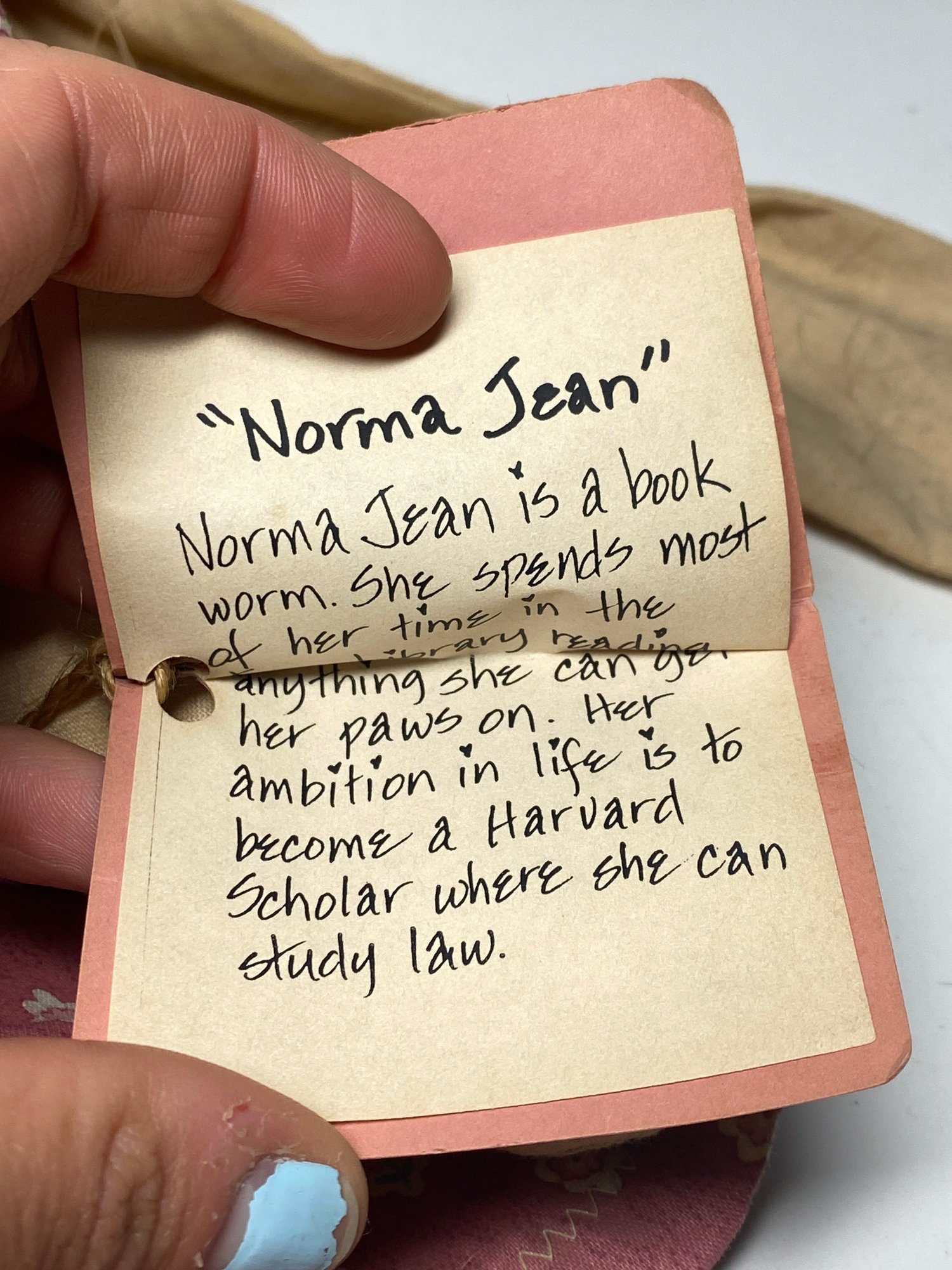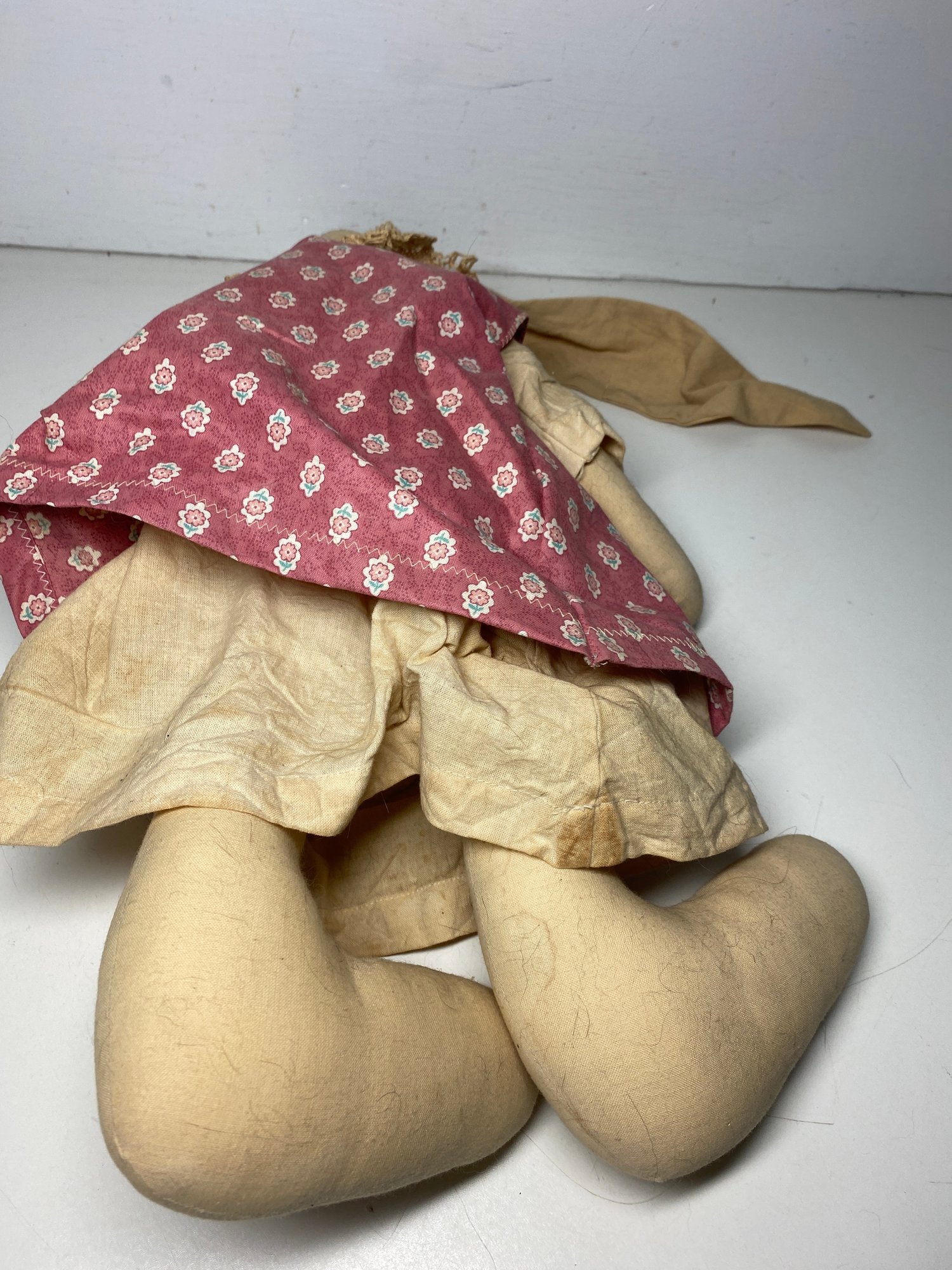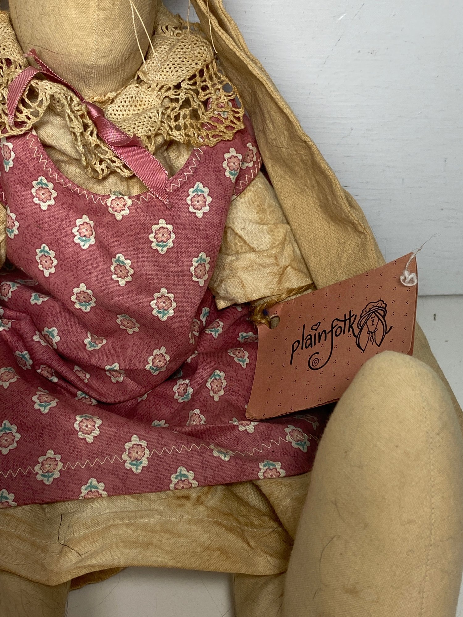 This rabbit has some discolored spots and some minor stains throughout that would most likely clean up in the wash. The tag is a plain folk tag and the rabbit’s name is Norma Jean. The rabbit measures 18” tall.