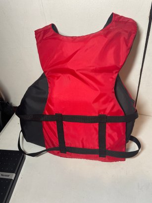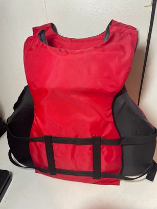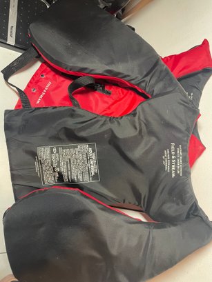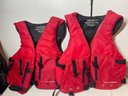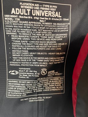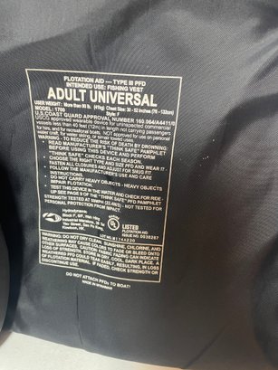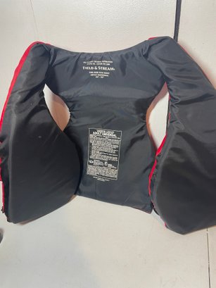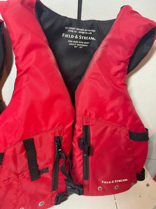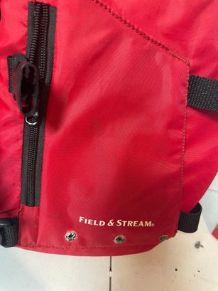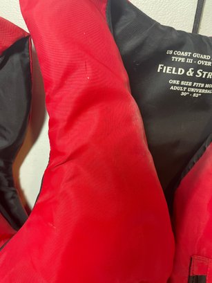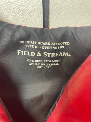 These are 2 Field & Stream Adult Life Vests. They are in good shape. They have some stains and could use some cleaning. There’s also some corrosion around the grommets. They are adult universal one size fits most 30”-52” and over 90lbs.