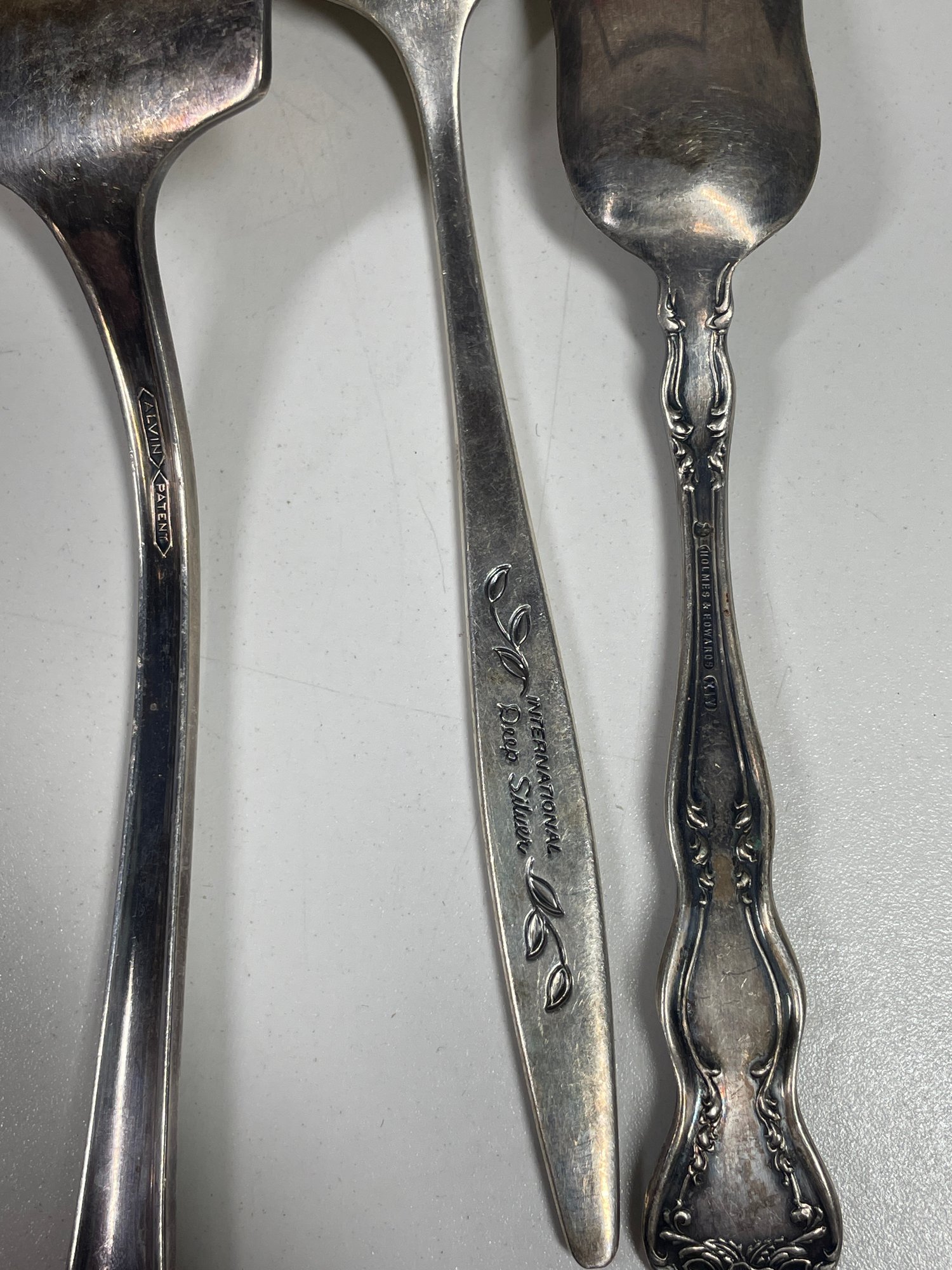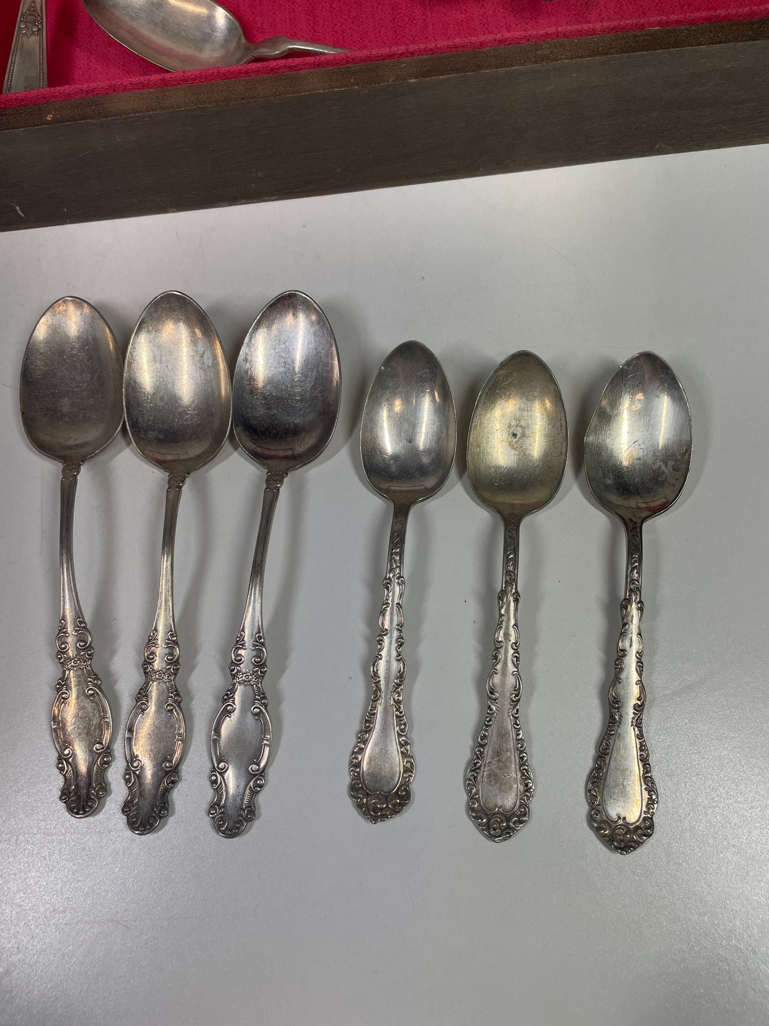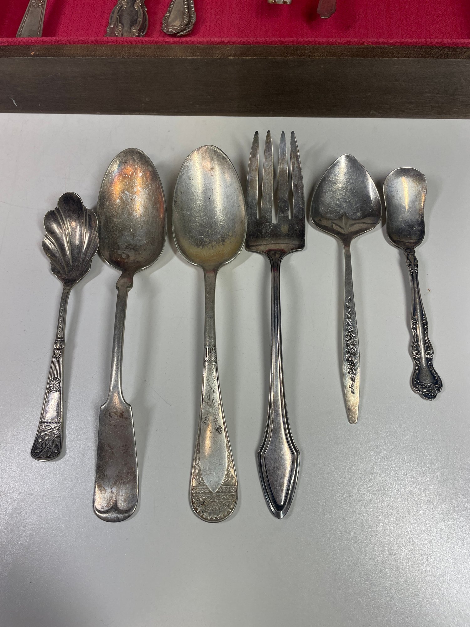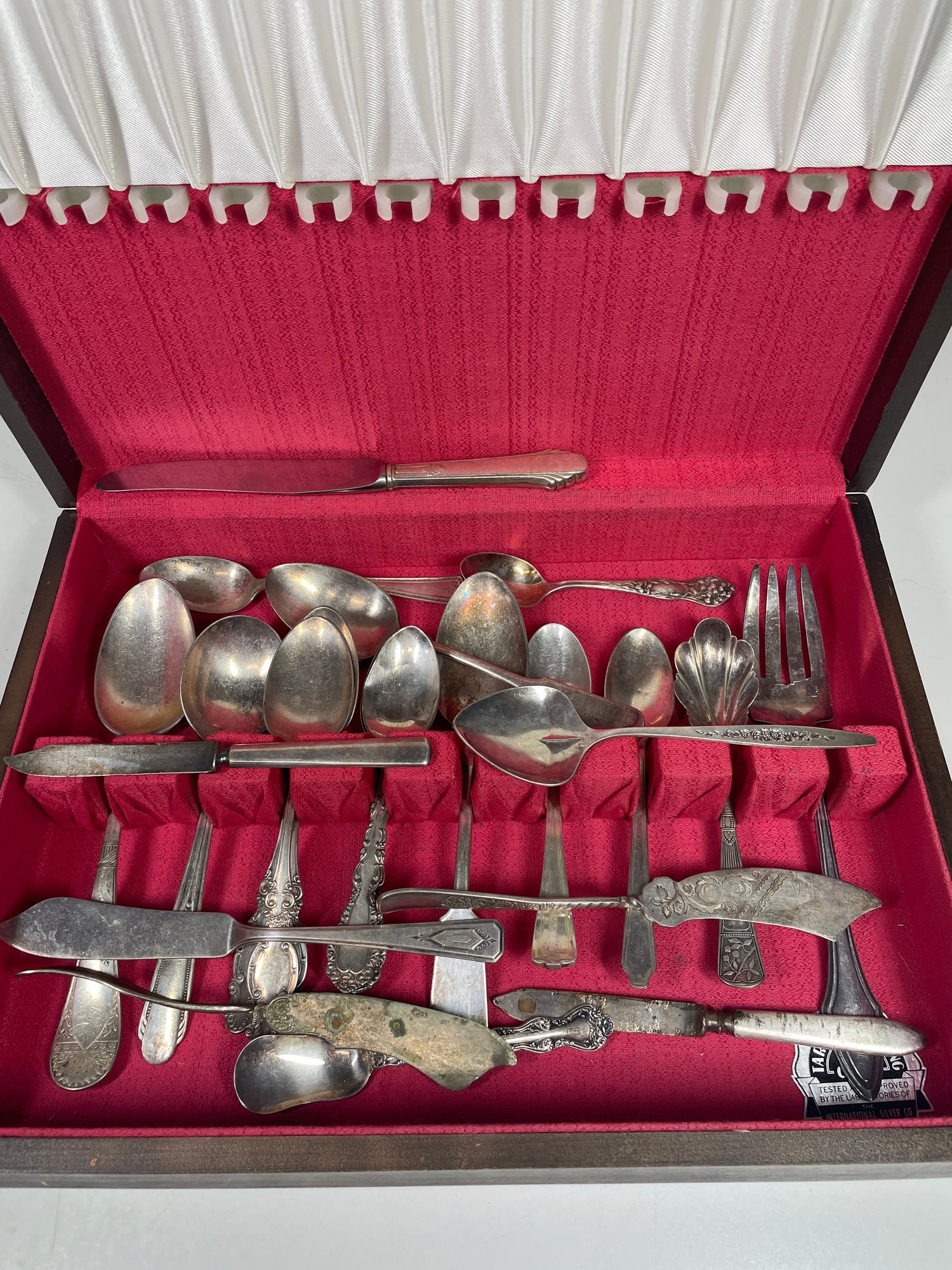 This is a mixed lot of mostly silver plated flatware. There may be some stainless mixed in. There is no solid silver. There is one marked “silver nickel”. They are in various conditions some with more tarnishing then others and various scratches. Awesome if you collect silver plate or want to start. This lot also includes the box which is in good condition with minor scratches here and there.