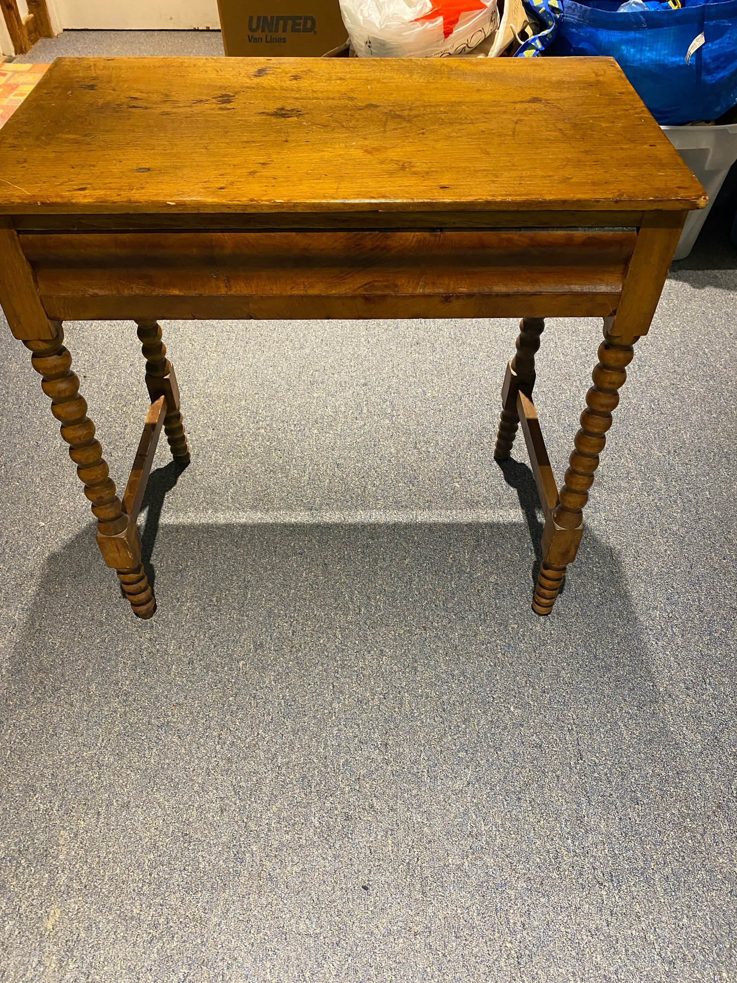 This accent table is nice and sturdy and has character! It has a shiny finish but it does have some scuffs and scratches along with some minor staining from age. It also has one drawer! It is unbranded and measures 28.5” wide,16.25” deep, and 28.75” tall