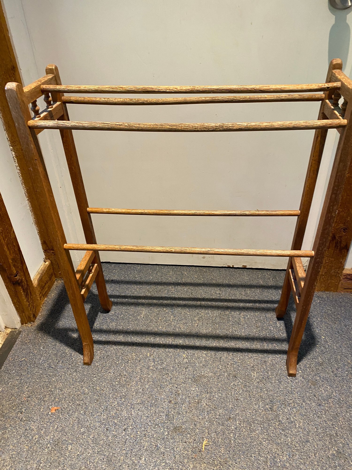 This quilt rack has some fading throughout and a couple of the dowels are starting to come loose but it is still a very nice and sturdy piece with a ton of life left! It measures 31.25” tall,25” wide, and 8” deep.