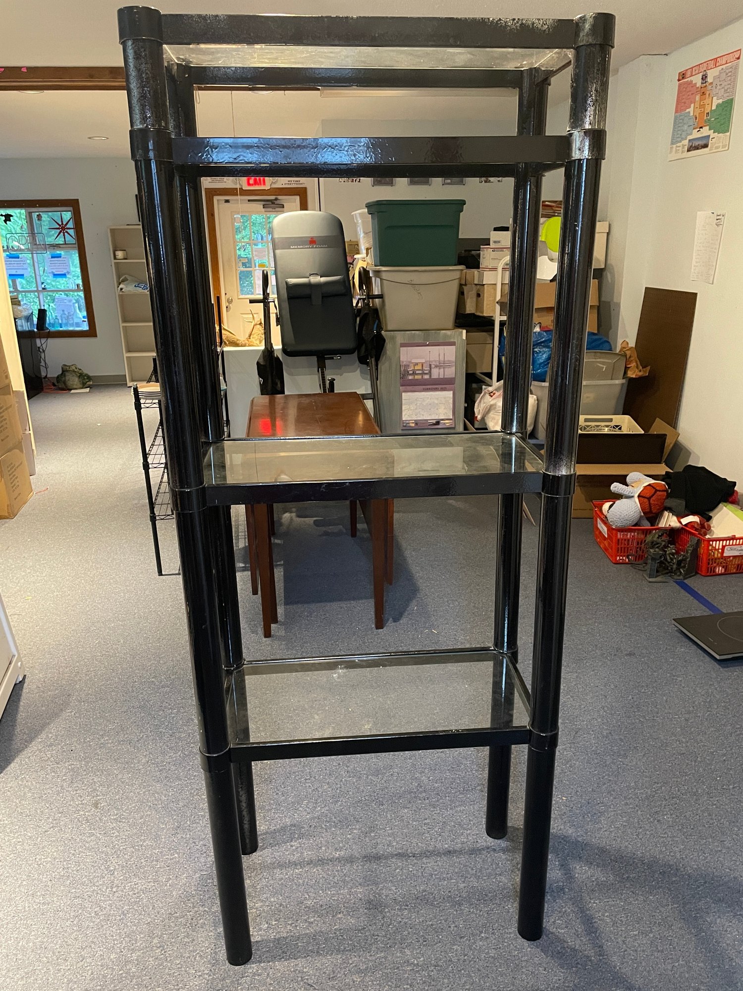 This is a 4 tier metal and glass shelf. Each tier comes apart and you could put the smallest shelf on the bottom if you would like. The shelves are glass and the caps that make the shelves stackable are plastic. Shelf could use some paint as it’s worn off in several places. None of the glass is chipped. When assembled it measures 72” tall, 15 1/2” deep, and 29” wide. One shelf is 6 1/2” tall, the other 3 are 22 1/2” tall.