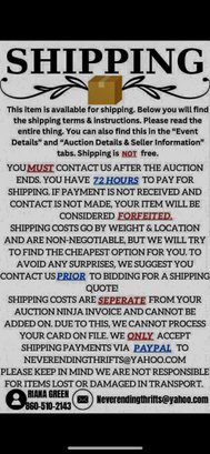 ~Only items marked “shipping” and noted in the description are eligible for shipping. We are not responsible if you bid on an item that is not eligible for shipping expecting it to be shipped so ask all questions prior to bidding.