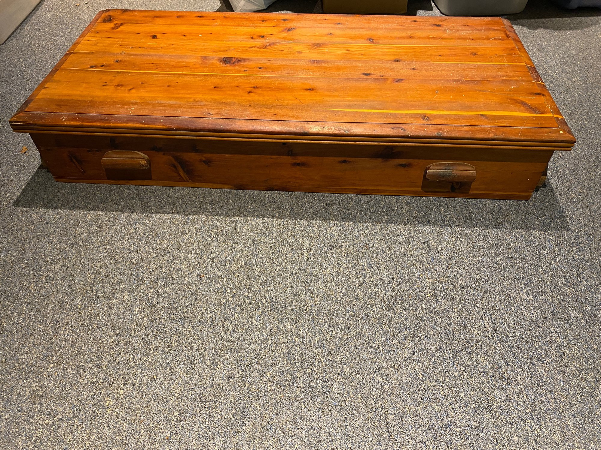 This cedar chest has some minor scuffs and scratches throughout from age and you. I think it would clean up very nicely though! It’s a nice solid cedar chest with wheels to make it easy to transport and it will fit nicely under a bed. It is west branch novelty and measures 48” wide,22” deep, and 8.5” tall.