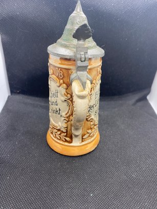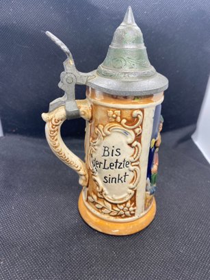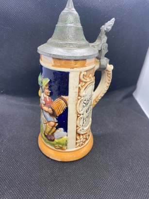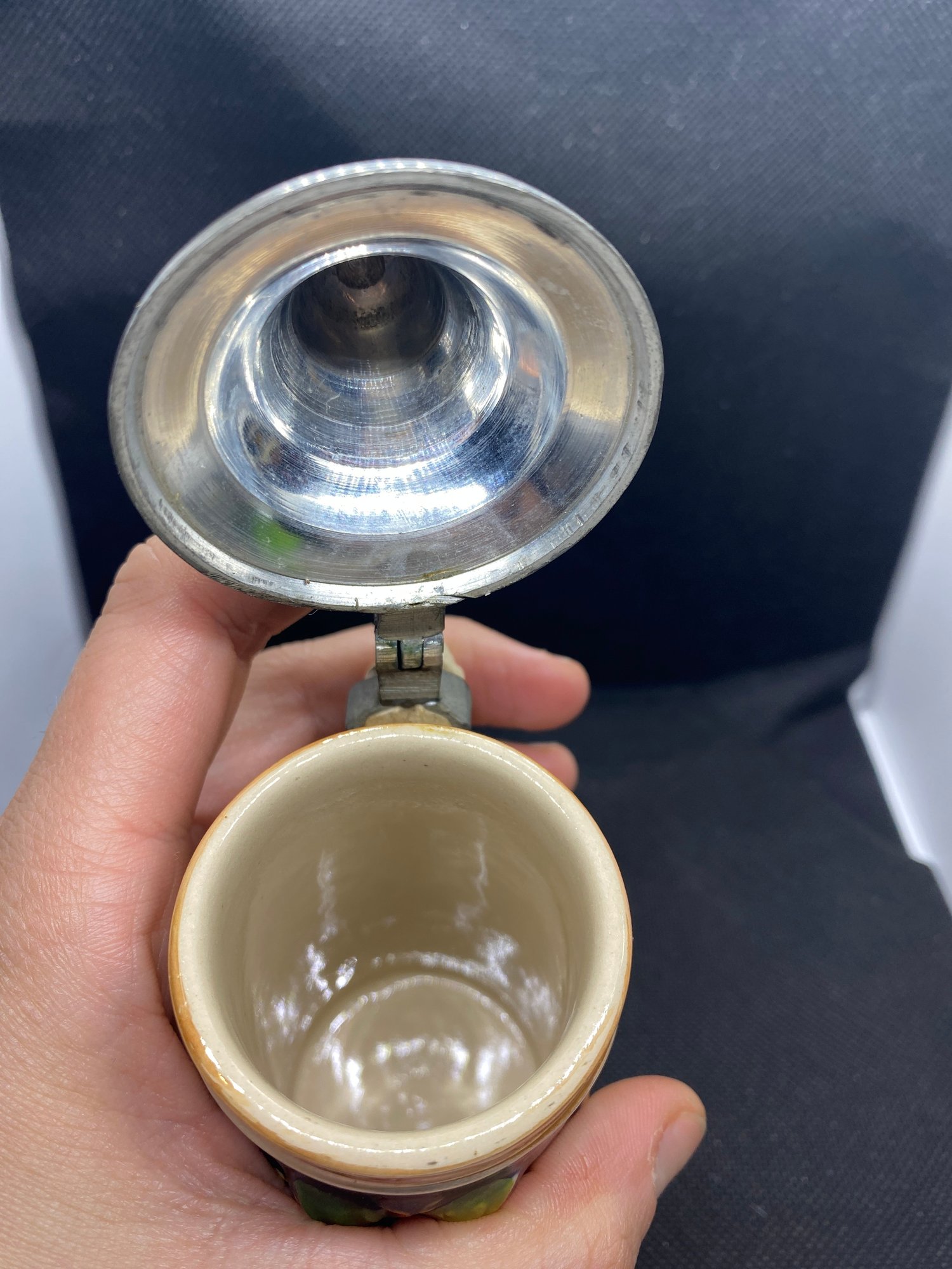 This beer stein has some minor wear on the pewter top but otherwise it’s in beautiful condition! It’s very clean inside and is marked “ Made in Germany” on the bottom. It measures 5.75” tall in total height and 2.5” in diameter.