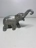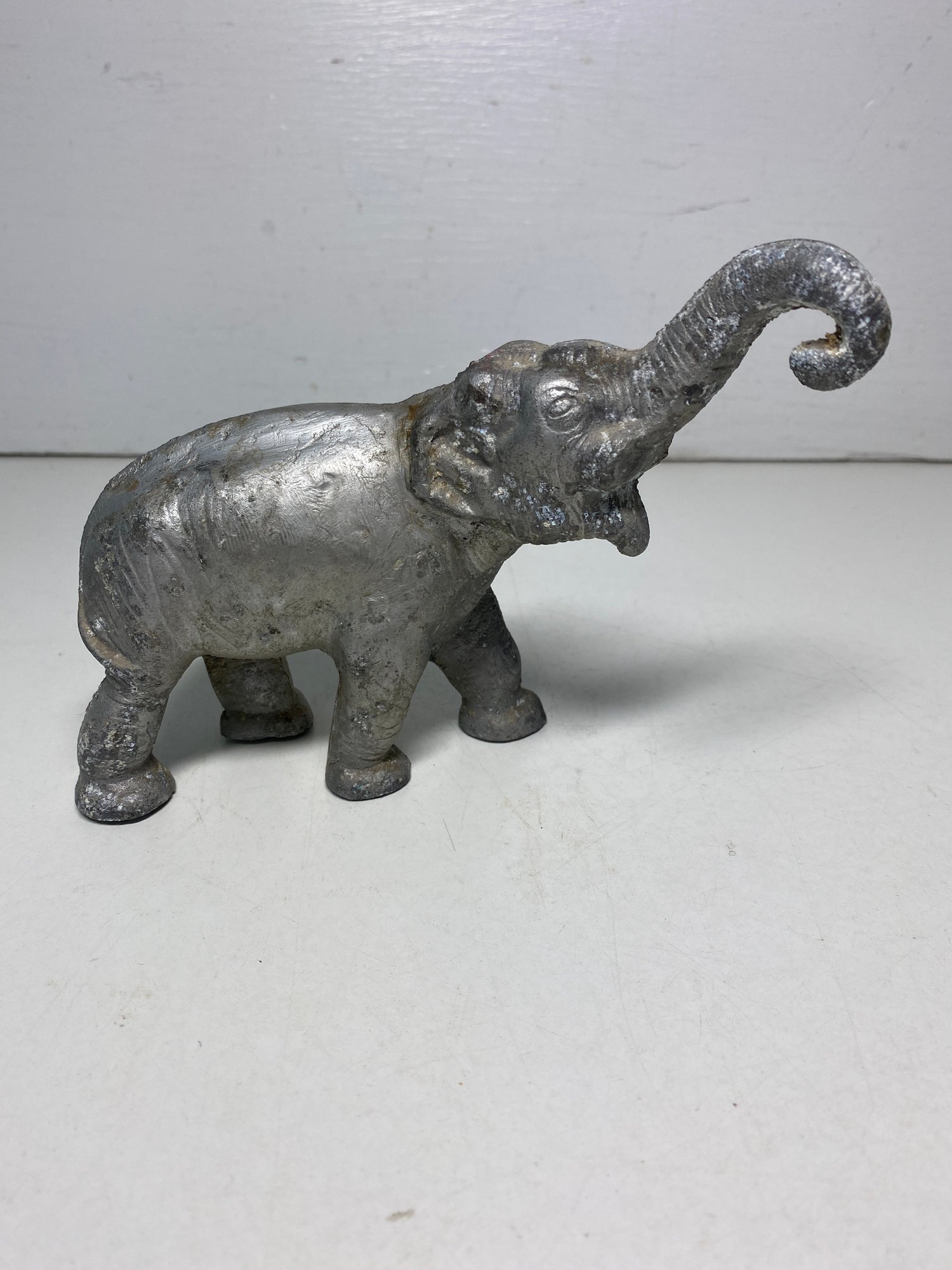 This elephant has some scuffs out of the finish and could use a detailed cleaning. It is a nice and solid piece and I believe it’s made out of some type of metal. It is unmarked and measures 5” tall including the trunk and 6” wide.