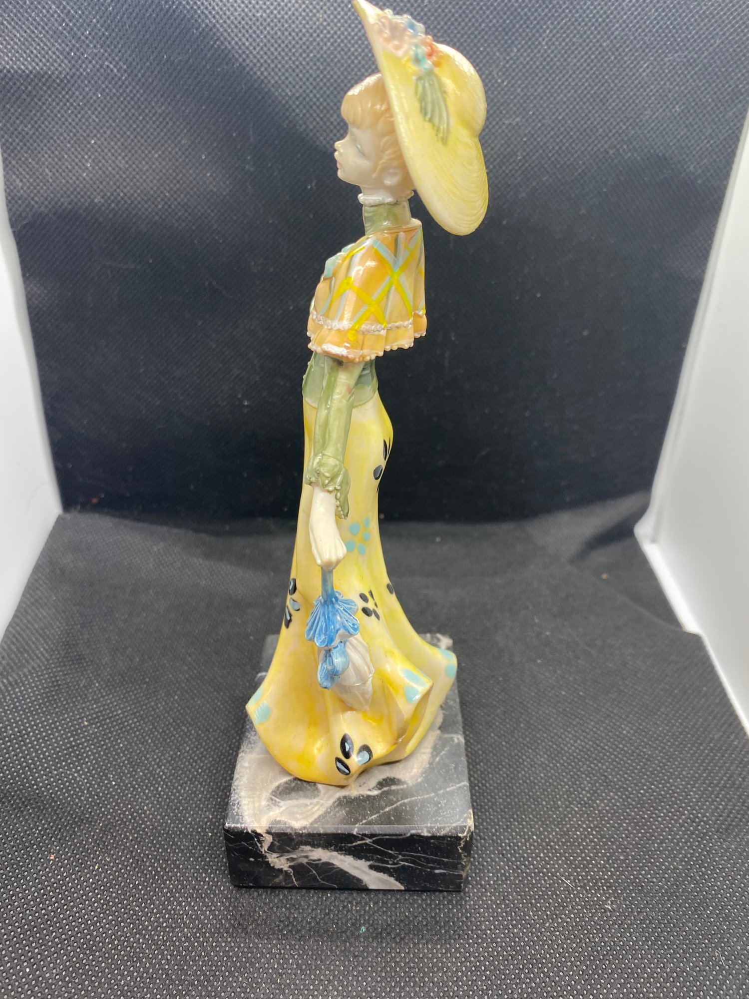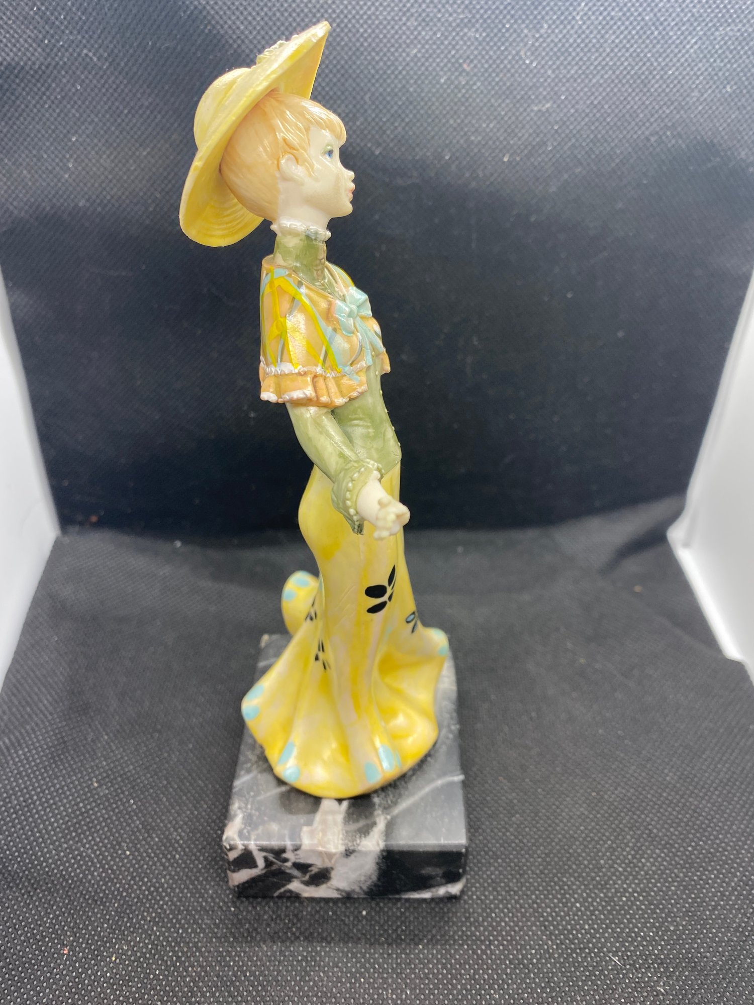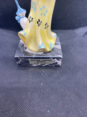 This figurine has one small chip out of the marble base but I don’t see any flaws otherwise! It measures 7” tall and the base measures 2”x2.5”. It is marked “ genuine Carrara Marble Made in Italy”.