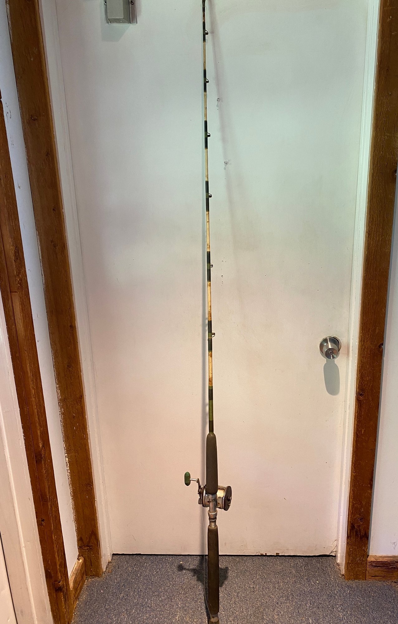 This fishing pole has some discoloration and minor surface rusting but still has a ton of life left! The reel moves freely and is a nice quality reel. The handle is very comfortable and this is a great quality reel. It has 7 eyes and measures 79” long.