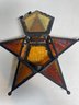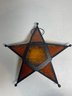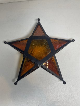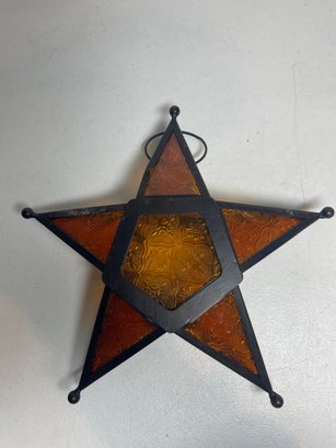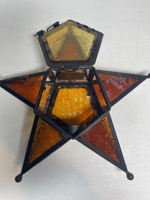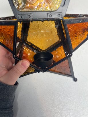 This is a beautiful amber glass hanging tea light holder. Has a door to put the tea light in and and latches shut. Measures 10.5”x10.5”. No cracks to the glass.