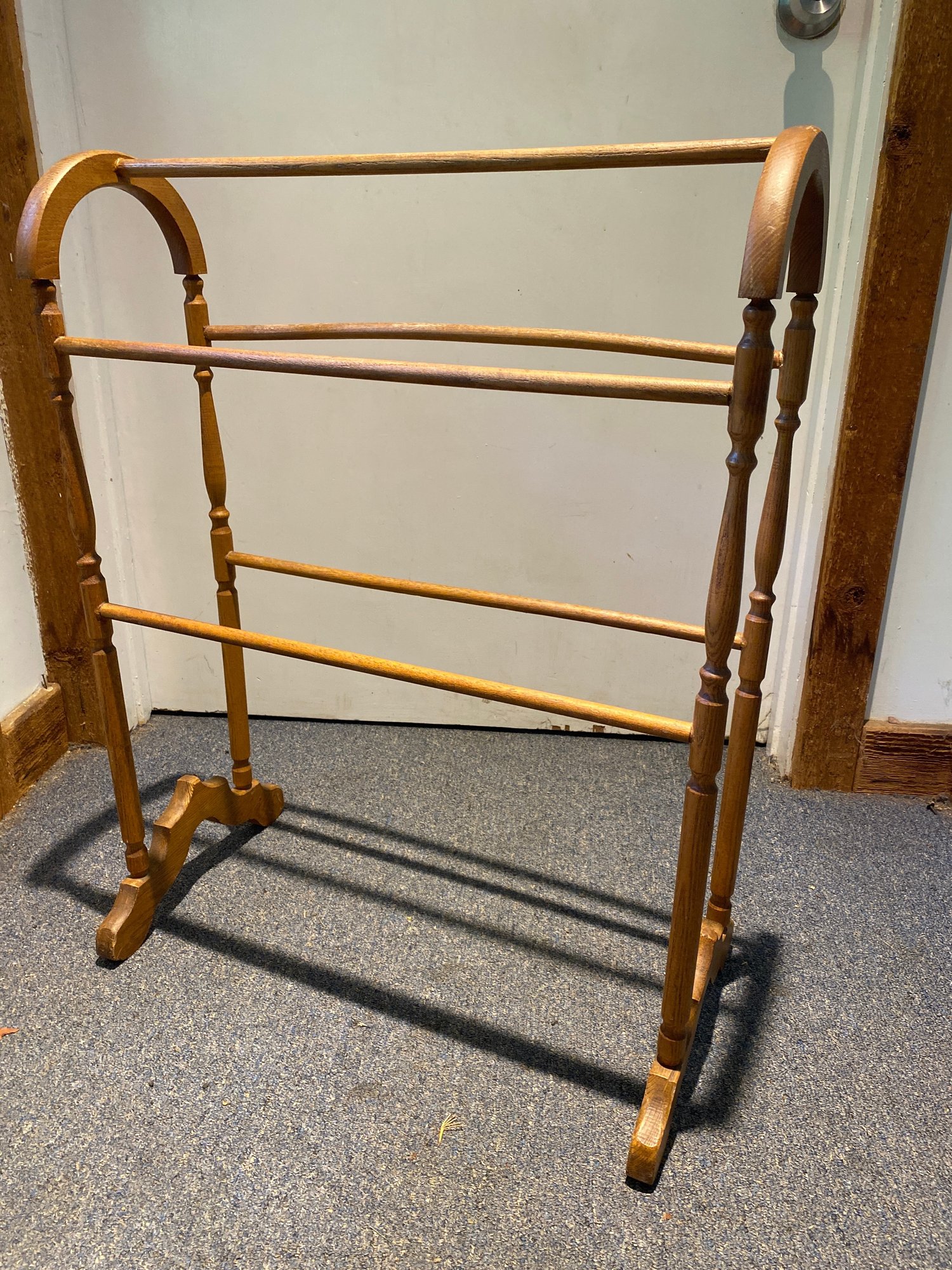 This quilt rack is in beautiful condition for its age! It is just ever so slightly wobbly but will still function just fine. There is some minor fading and one of the top dowels is bowed a bit from age. It measures 28.75” tall,22” wide, and 12” deep