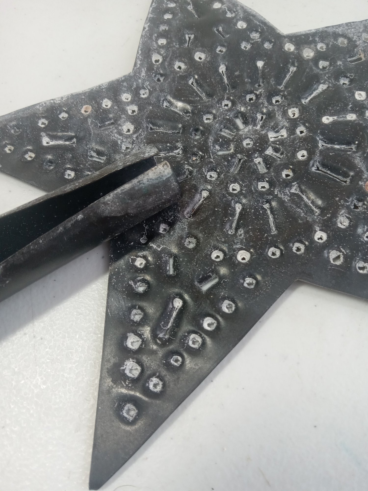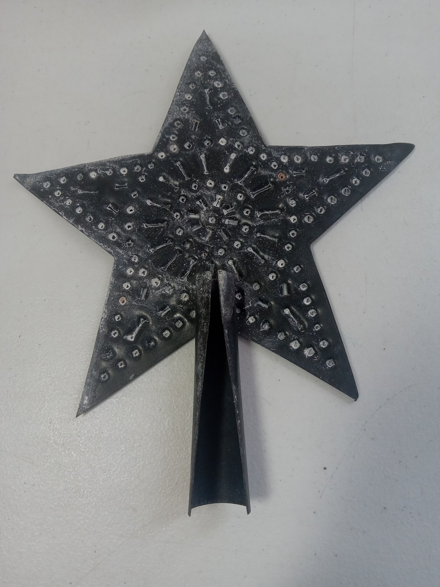Hand-worked antique tree topper, the punches look hand done, and uneven edges look done by hand. It's roughly 9.5 inches long and roughly 8.25 inches wide. It has a white layer of ware that looks like it can be cleaned.