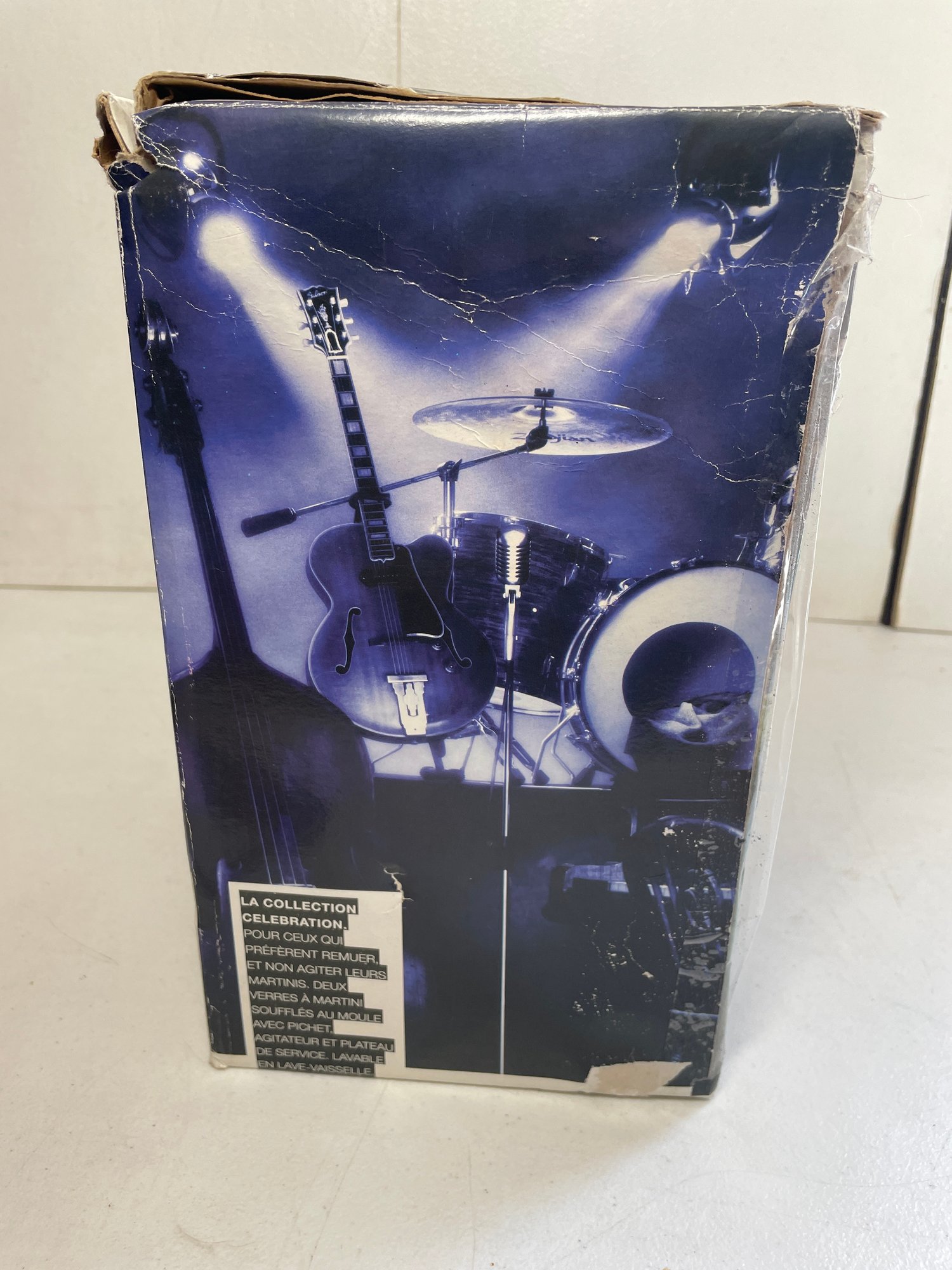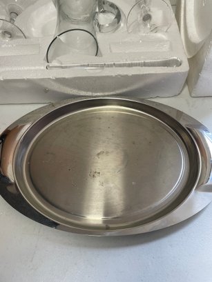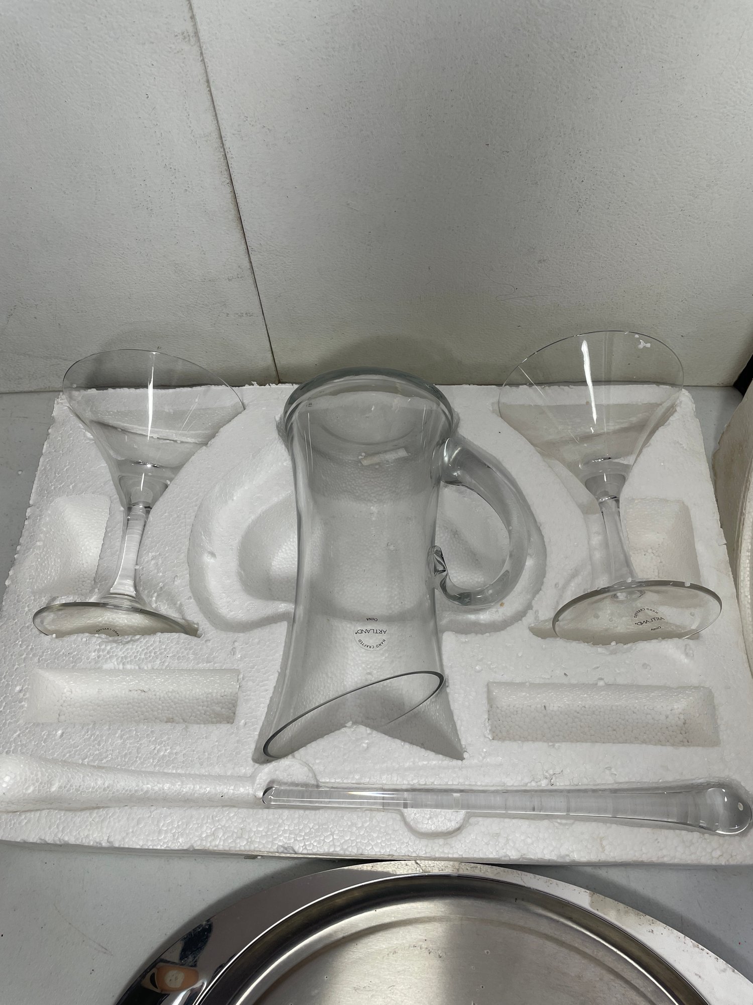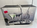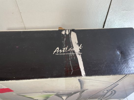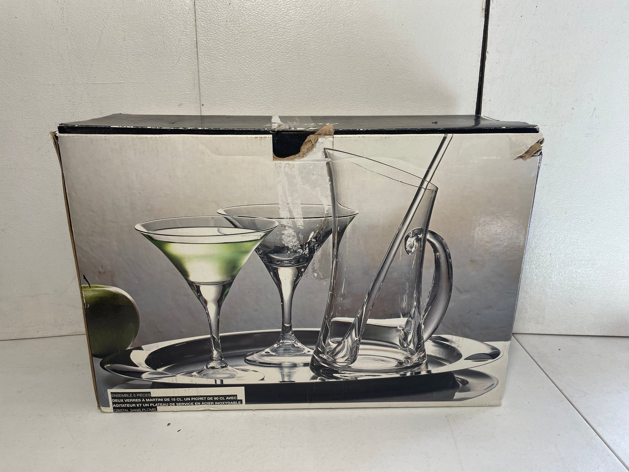 This is an Artland Celebration Collection martini set. This set has 5 pieces total and all the pieces are in good condition. No cracks or chips on the glassware. The tray has some stains and scratches as shown in the picture. The box also has some damage as shown in the pictures.