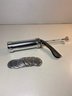 This cookie press is Biscuits brand and is stainless steel! Other than a couple of small scratches I see no flaws. The tube measures 6.75” long and 2” in diameter. The stem measures 6.75” long. It also includes 19 different attachments!