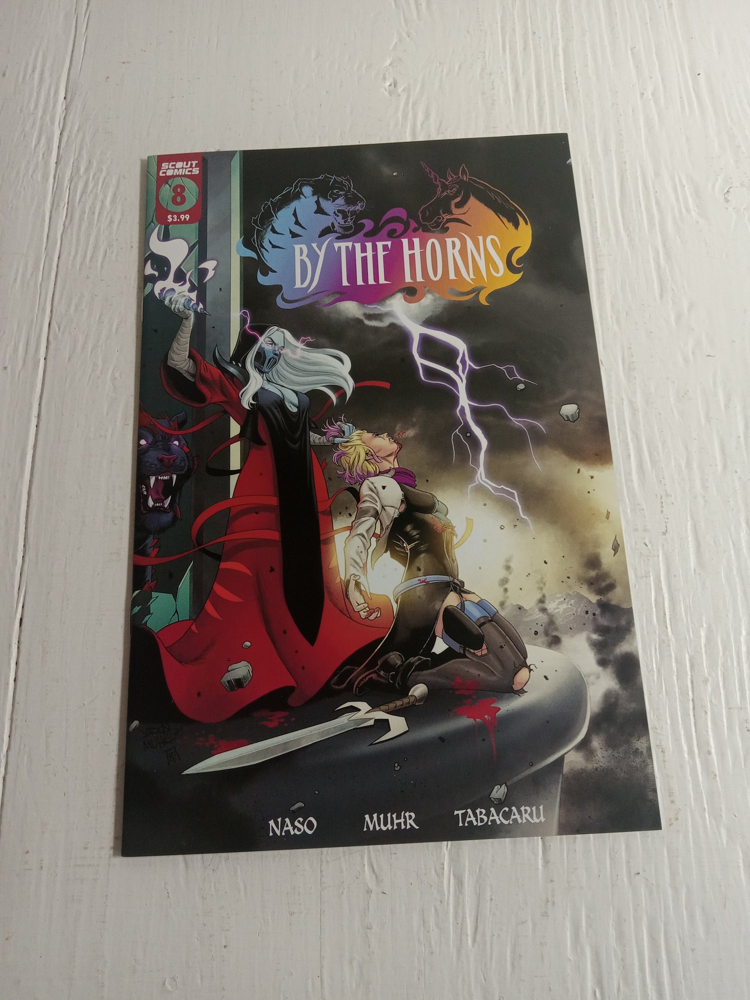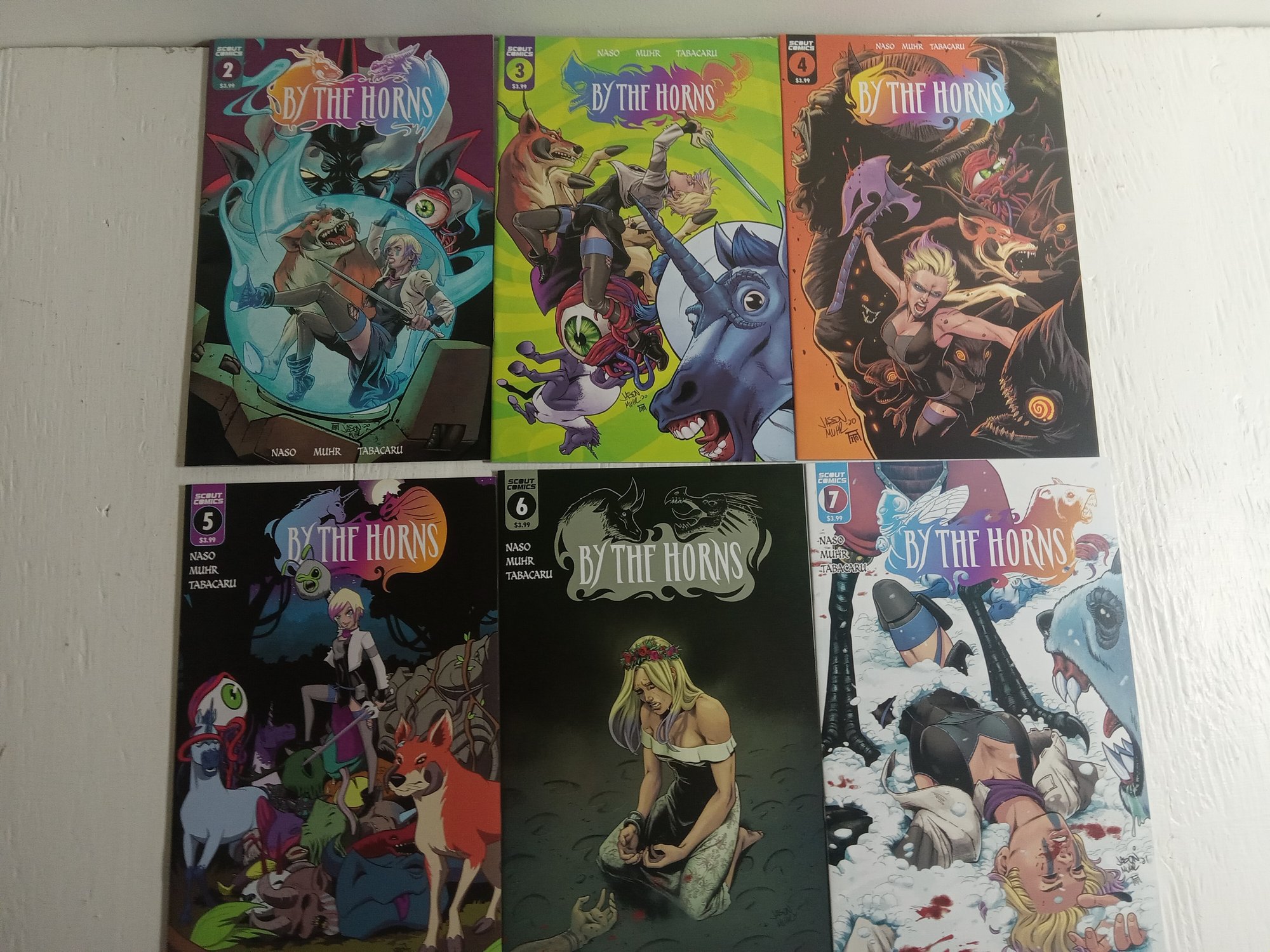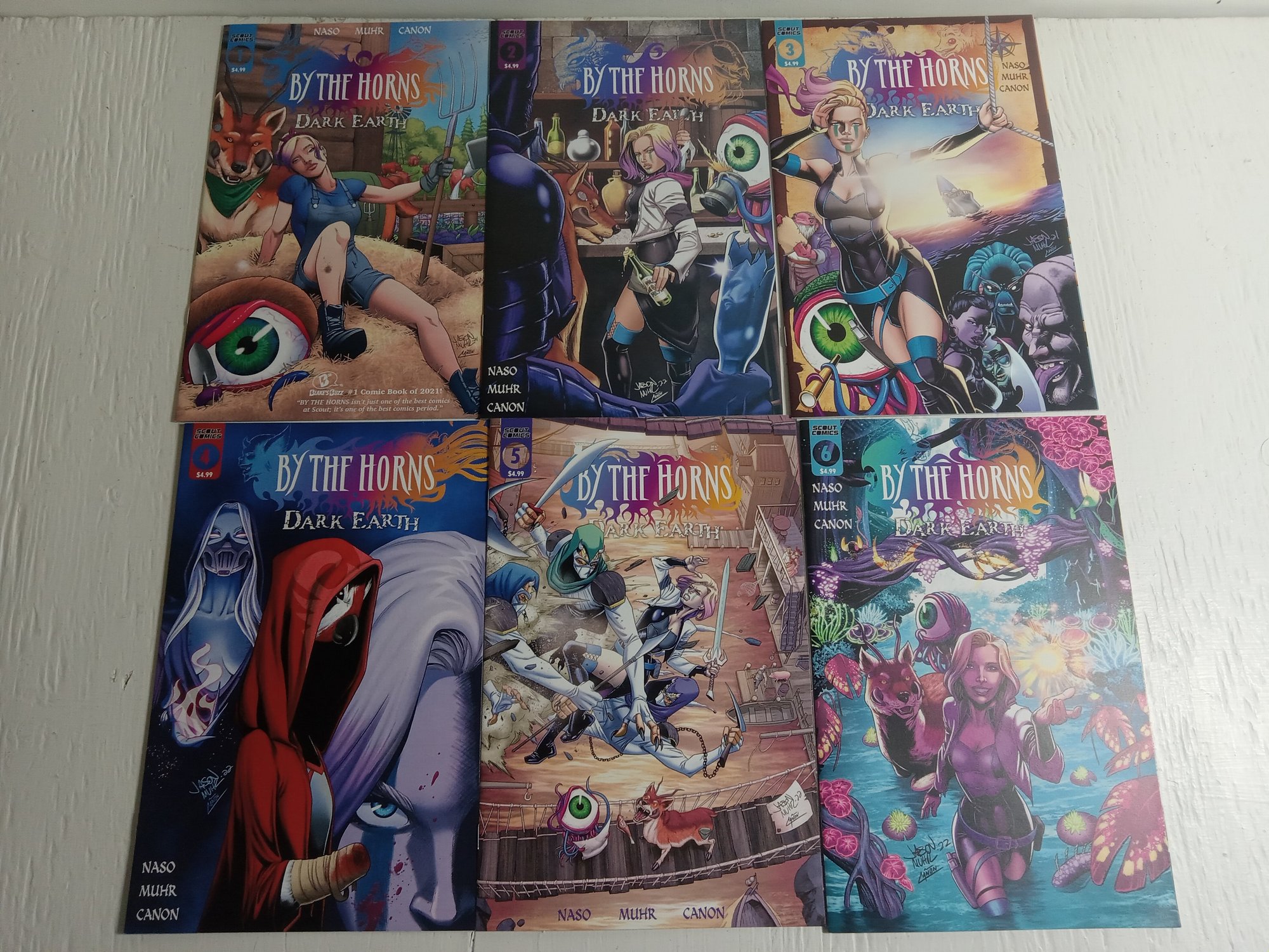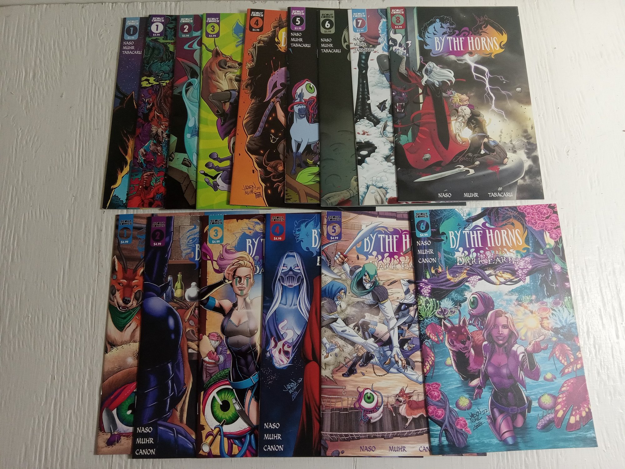 Lot of 15 "by the horns" comic books. There's two #1 issues in the first run variant covers, then it's a straight run until issue 8. There's also the first 6 issues of Dark Earth. Comics are bagged and boarded.