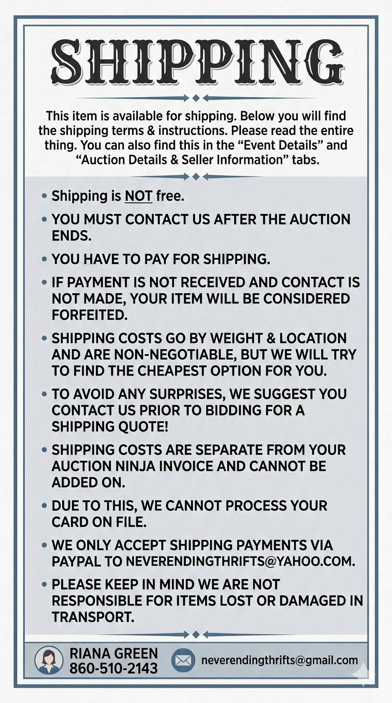 ~Shipping costs go by weight and location and are non-negotiable but we will try to find the cheapest option for you. To avoid any surprises we suggest you contact us prior to bidding to calculate your shipping cost. Shipping costs are SEPARATE from your Never Ending Thrifts LLC invoice and cannot be added on to the invoice.