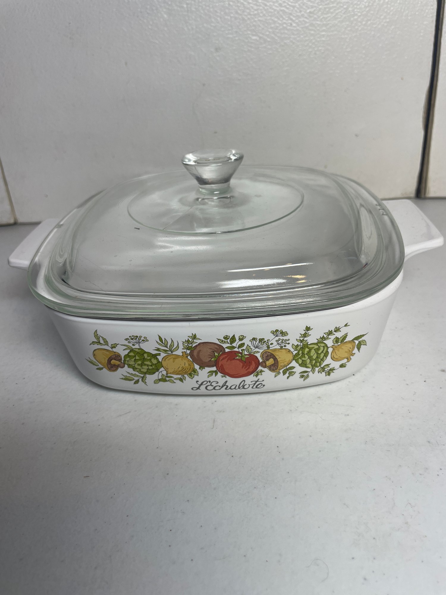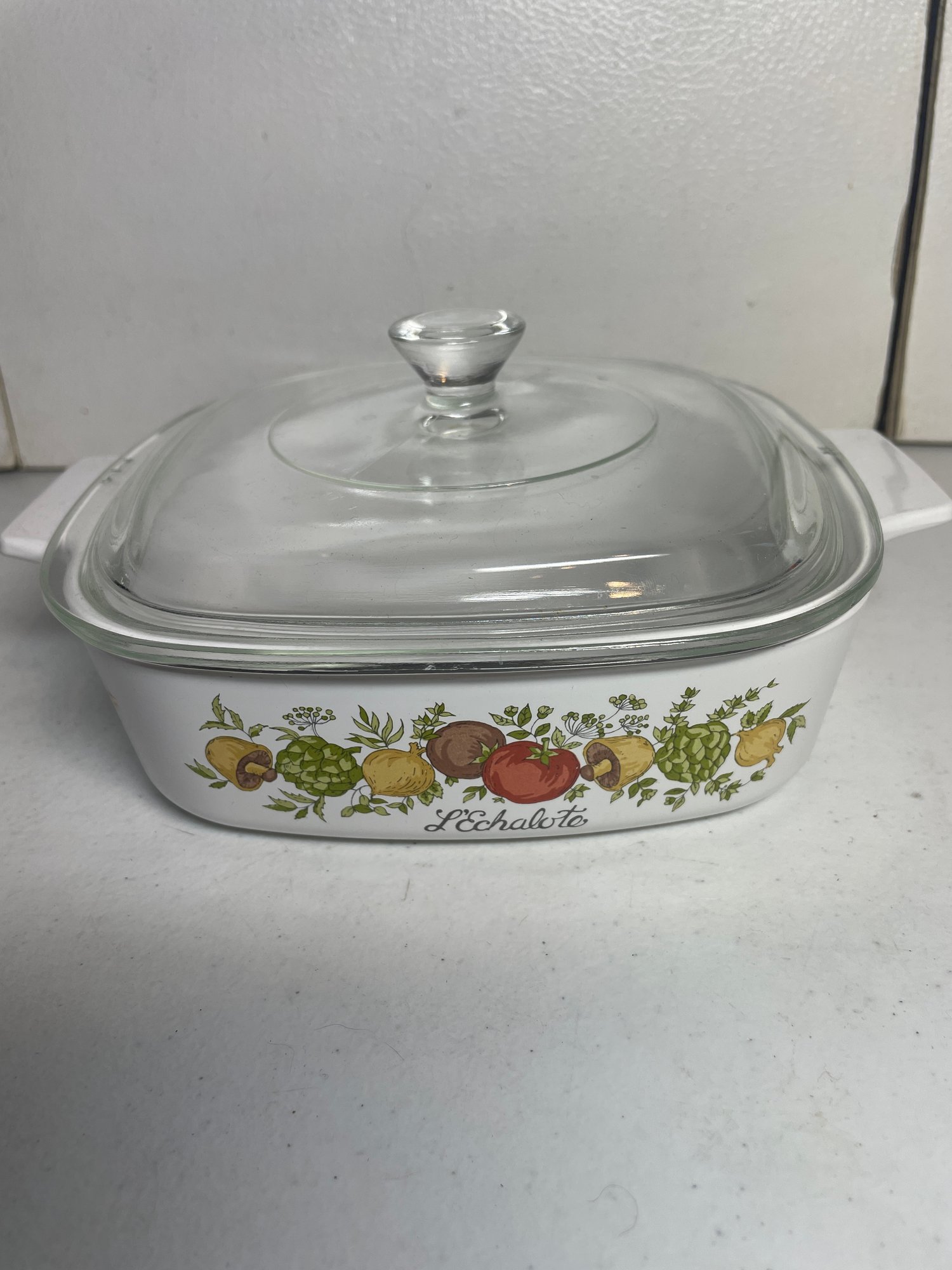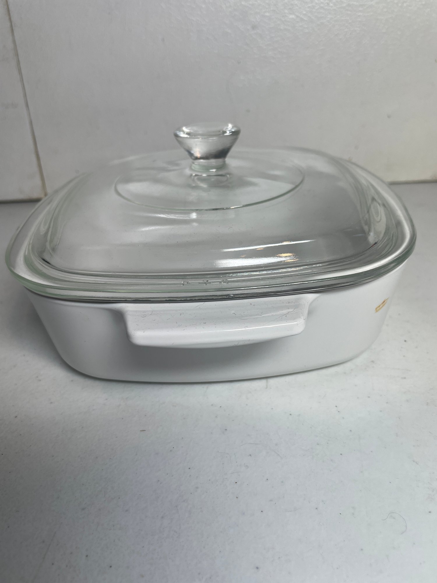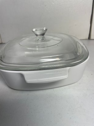 This is a beautiful Corning Ware casserole dish with lid. It is in nice shape with no chips or major scratches. The lid is in good shape also. It is a 1qt casserole dish. It measures 7”x7”x2”.