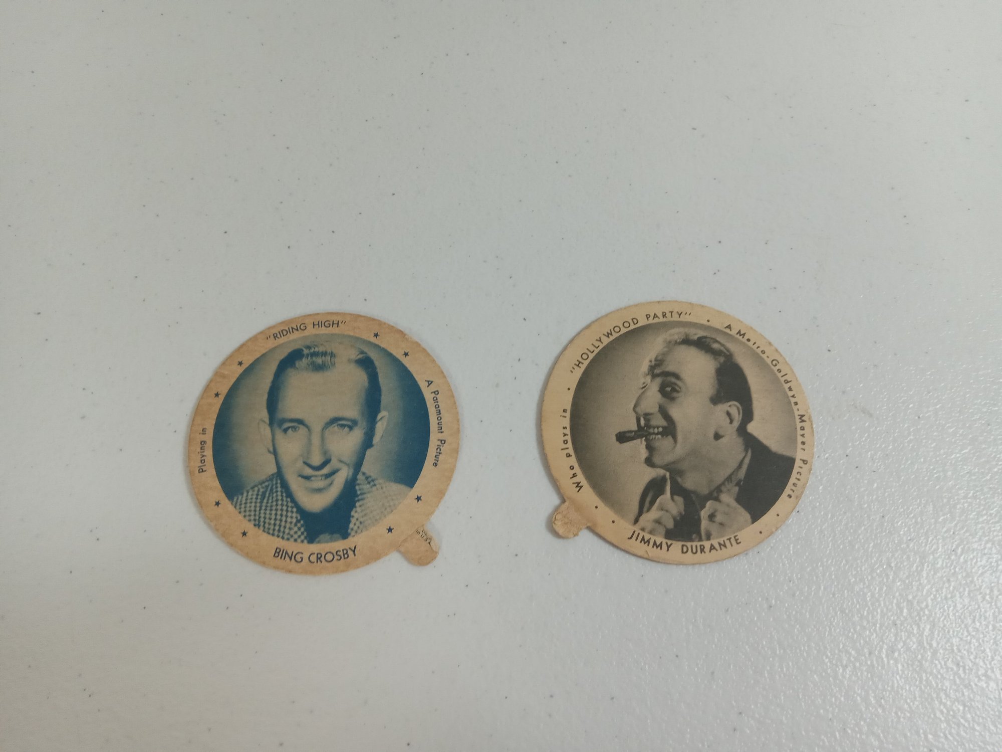 Old Ice Cream lids from Dixie Daries, "Bing Crosby" is on one lid, and "Jimmy Durante" is on the other. They're in nice shape for their age, but have discoloring and fading in areas. 2 3/4 inches in diameter.