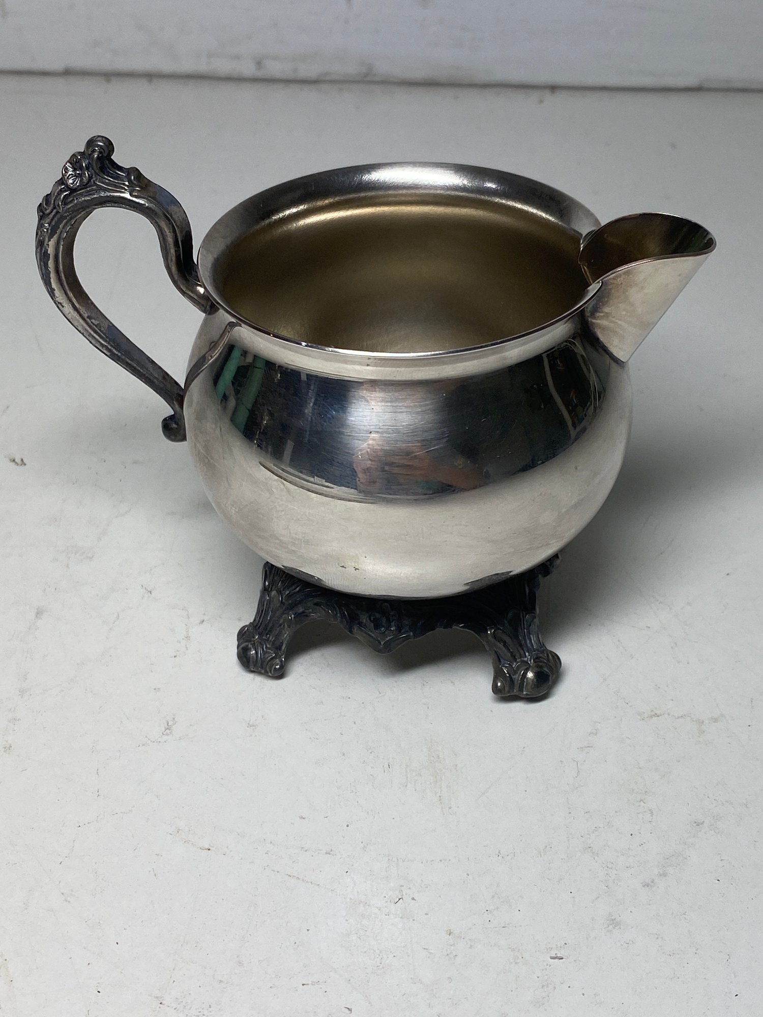 This beautiful creamer has some minor tarnishing here and there but overall is a beautiful shiny piece! It is marked “ FB rogers 2305” on the bottom and measures 3.75” to the top of the handles.