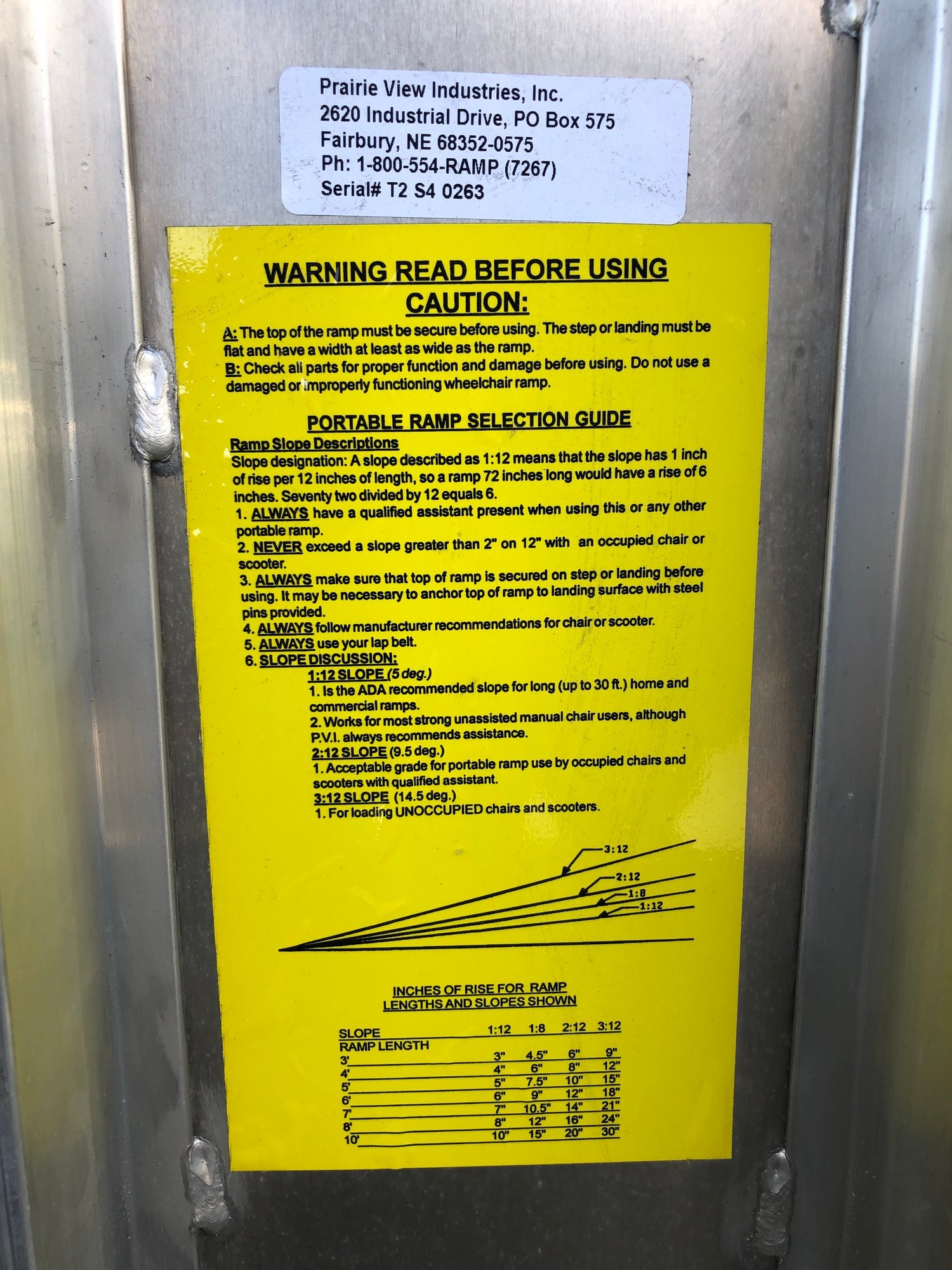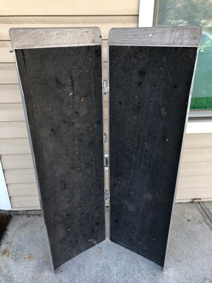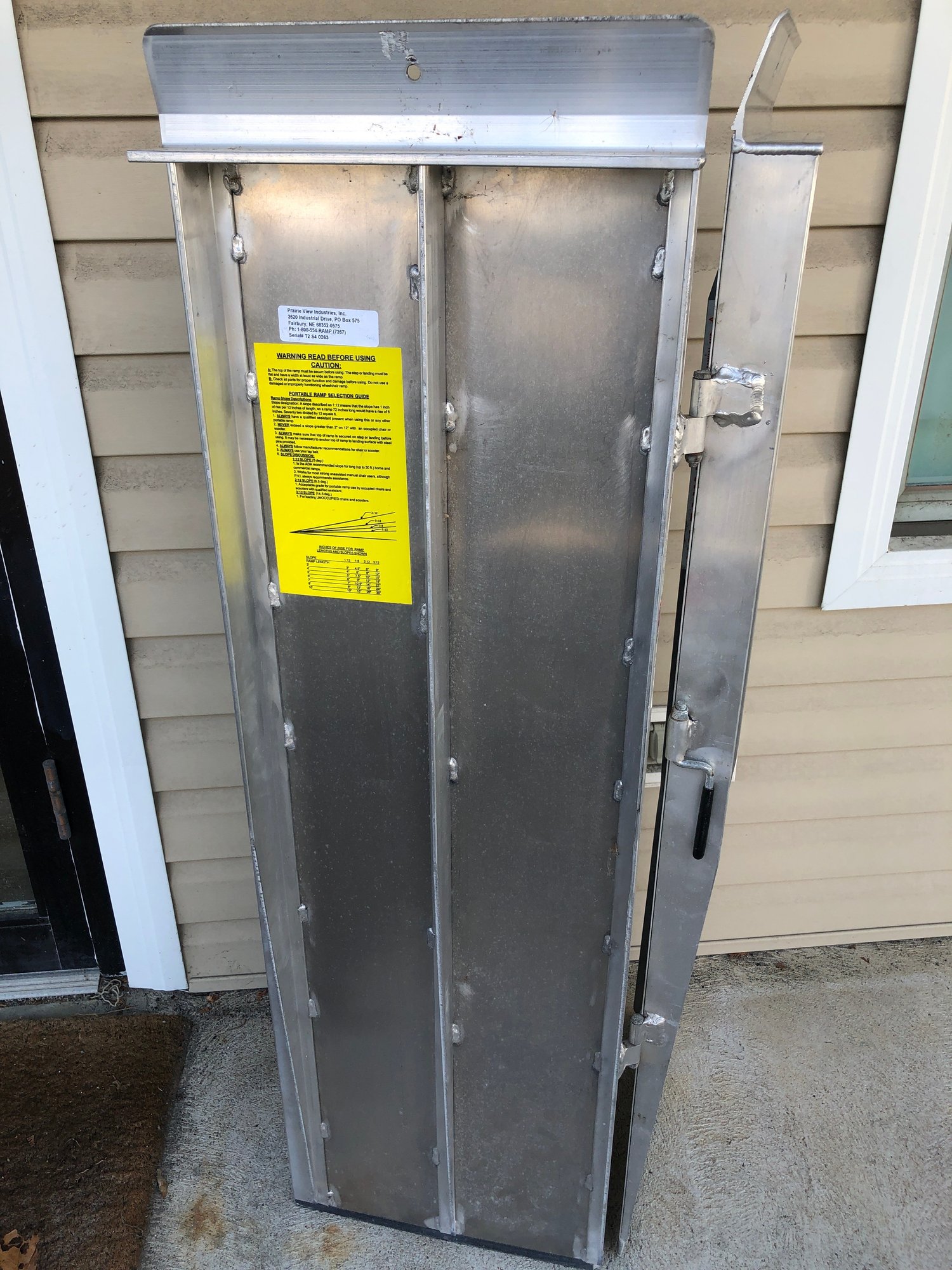 This is a portable, foldable aluminum wheelchair ramp, manufactured by Prairie View Industries (PVI). It features a foldable design that allows it to be carried like a suitcase for easy transport and storage. The ramp is constructed from lightweight, durable aluminum. It includes an anti-slip, high-traction surface for safety. weight capacities are 400LBS for a single axle - 800 lbs for a two axle. The ramp is ideal for sheds, thresholds, etc.