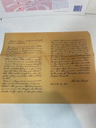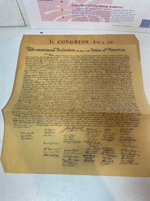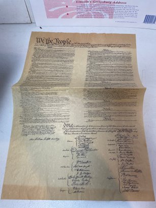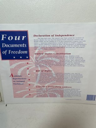 This is a nice reproductions lot of four documents of freedom. The lot includes a reproduction of the following: Declaration of Independence, United States Constitution, Bill of Rights, Lincoln’s Gettysburg Address. They are in nice shape other than the folds in the middle of them. Authentic reproductions on antiqued parchment.