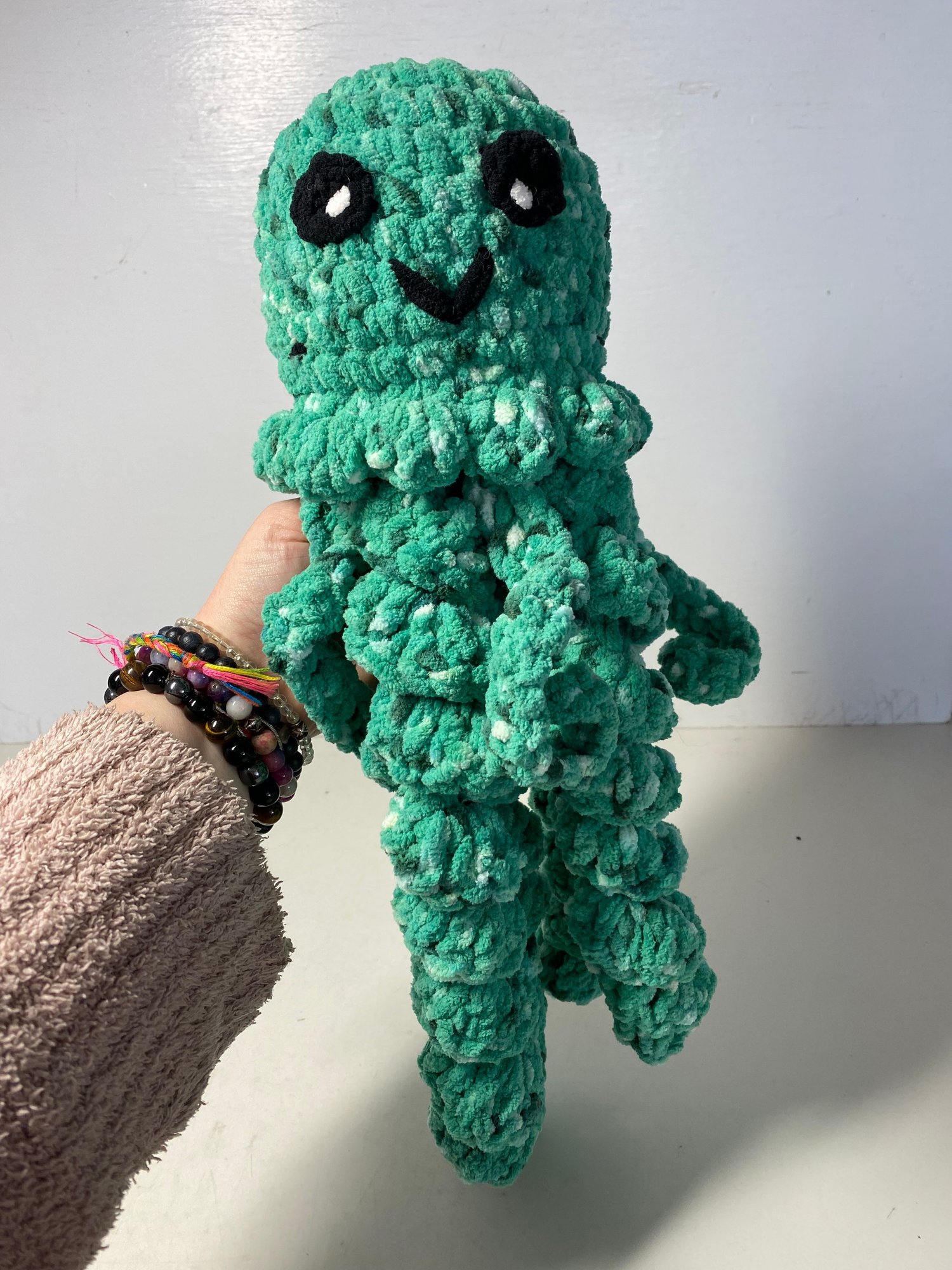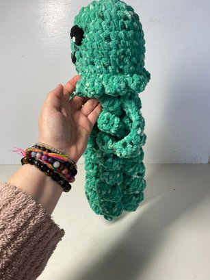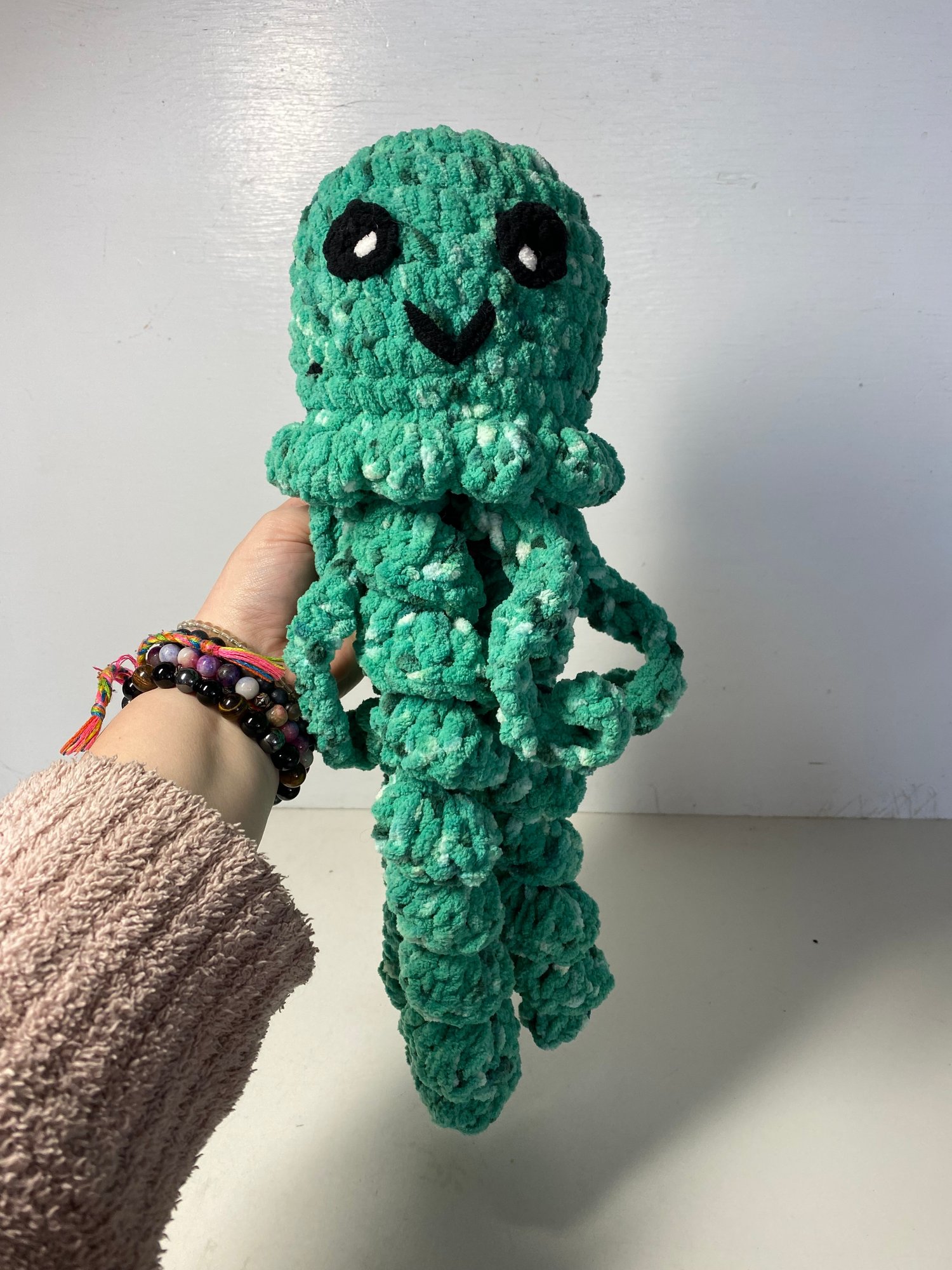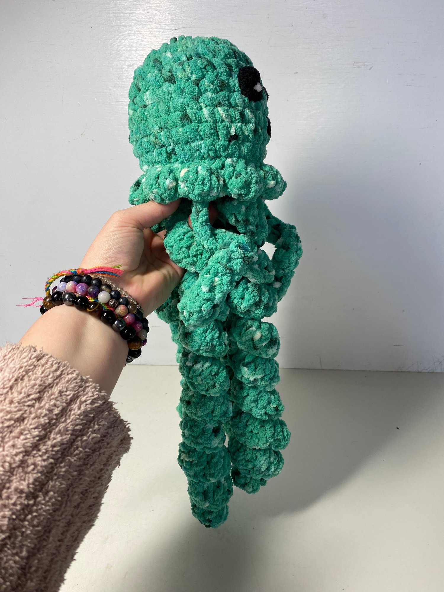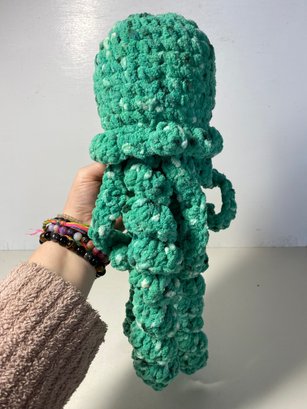 This is a handmade crochet jellyfish! He is roughly 16 inches long with roughly a diameter of 5 inches. He is in good condition all handmade, Perfect for a gift for someone if they enjoy jellyfish!