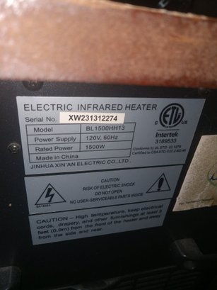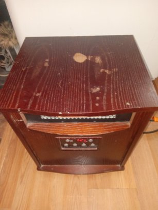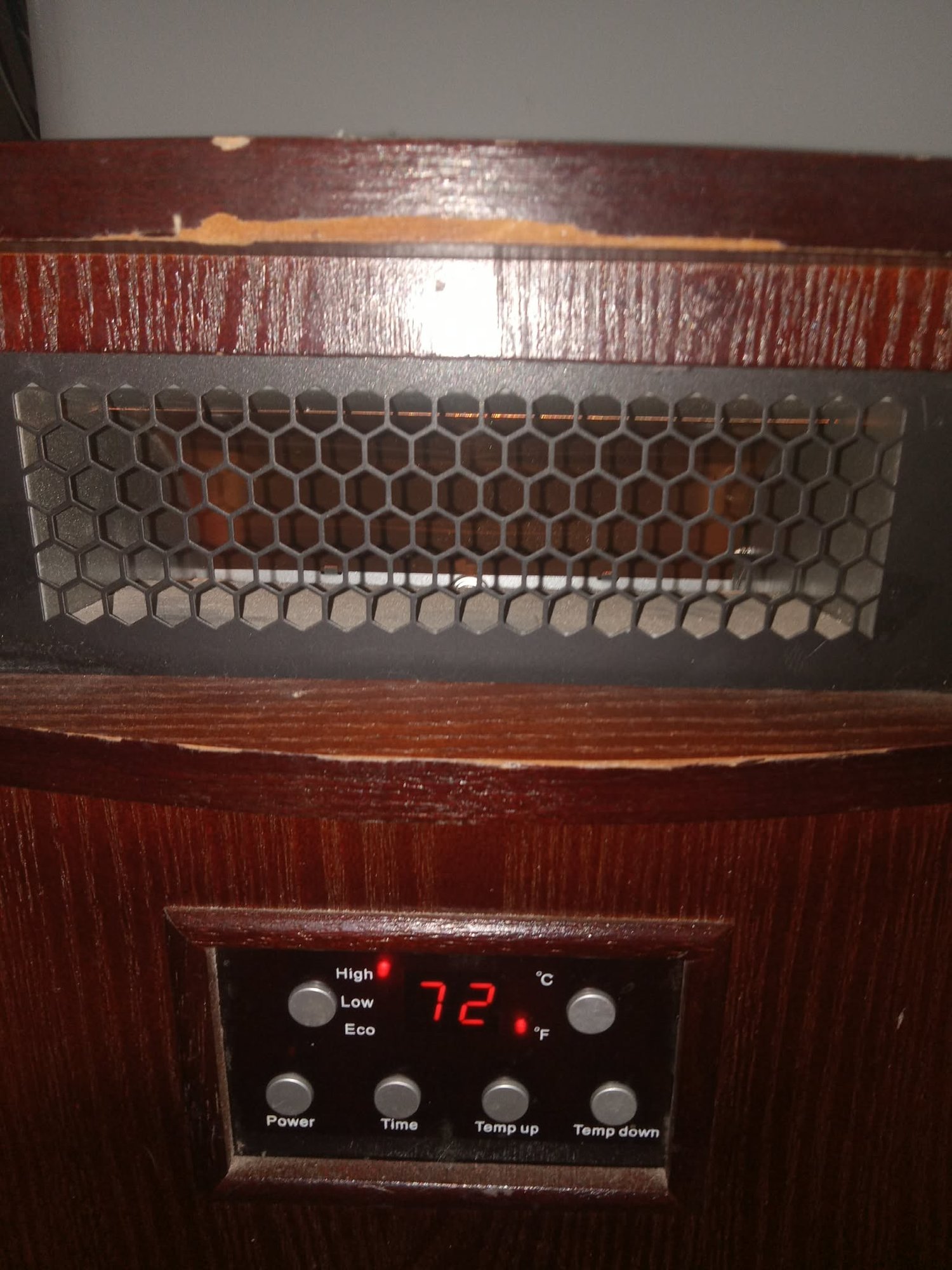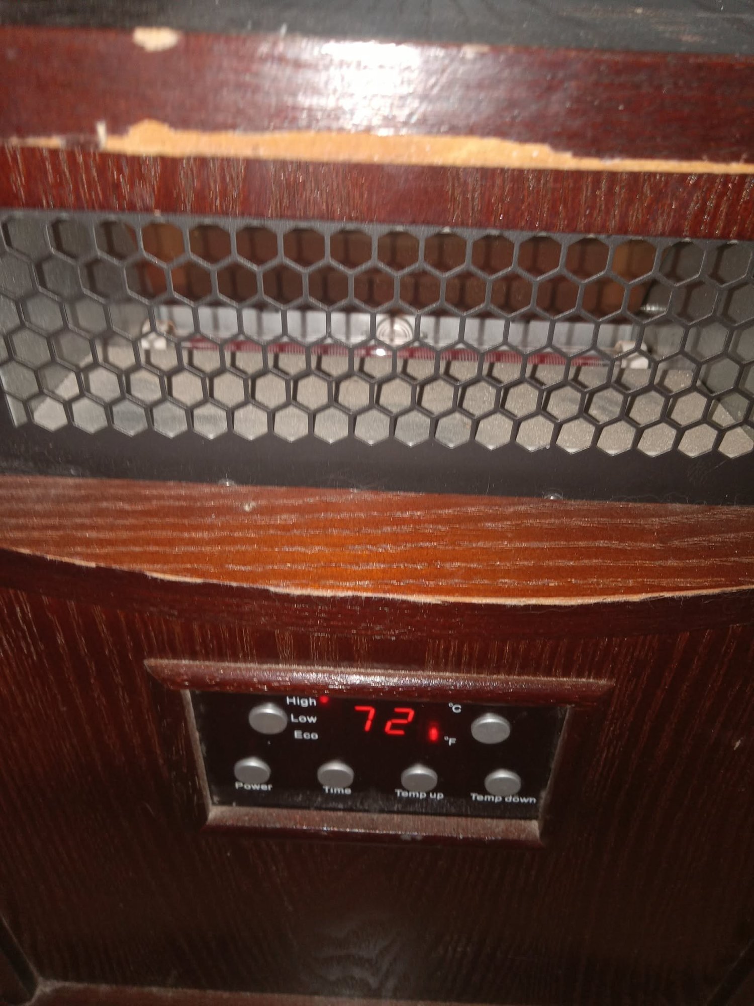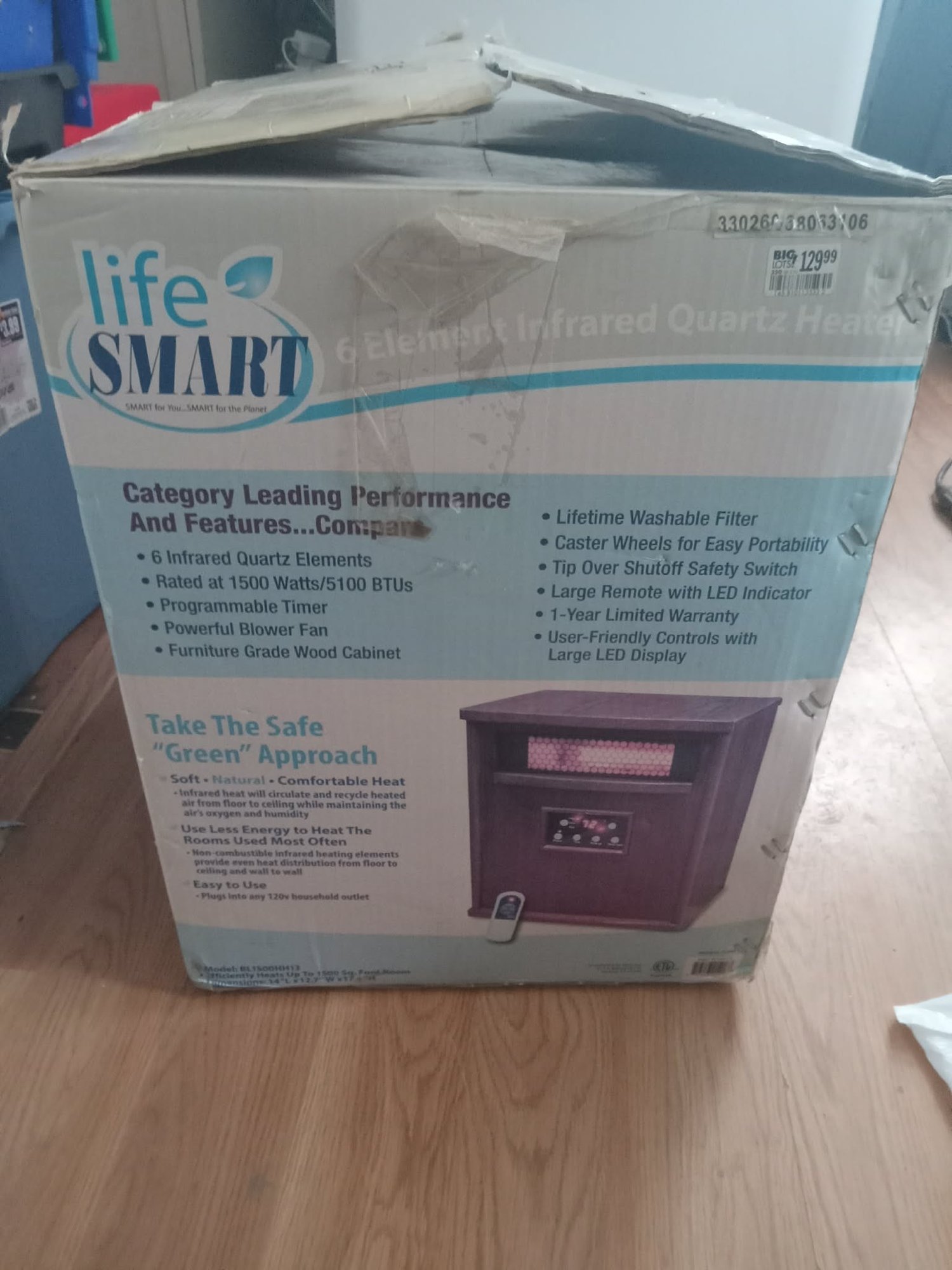 LifeSmart 6 element inferred heater. It has some scratches and other ware as shown in the pictures but the heater runs great. The remote is broken, heavy battery corrosion. It measures 14”x12.70x17”.
