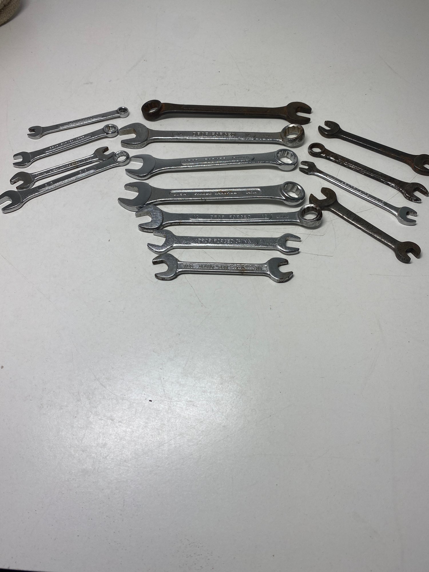 These wrenches vary in sizes and brands. Some are branded and some are not marked at all. Most look like new but some have some rusting throughout. All of them are functional and have a ton of life left! They vary in metric and standard sizes as well I believe.The smallest size I see is 1/4 and the largest is 14.