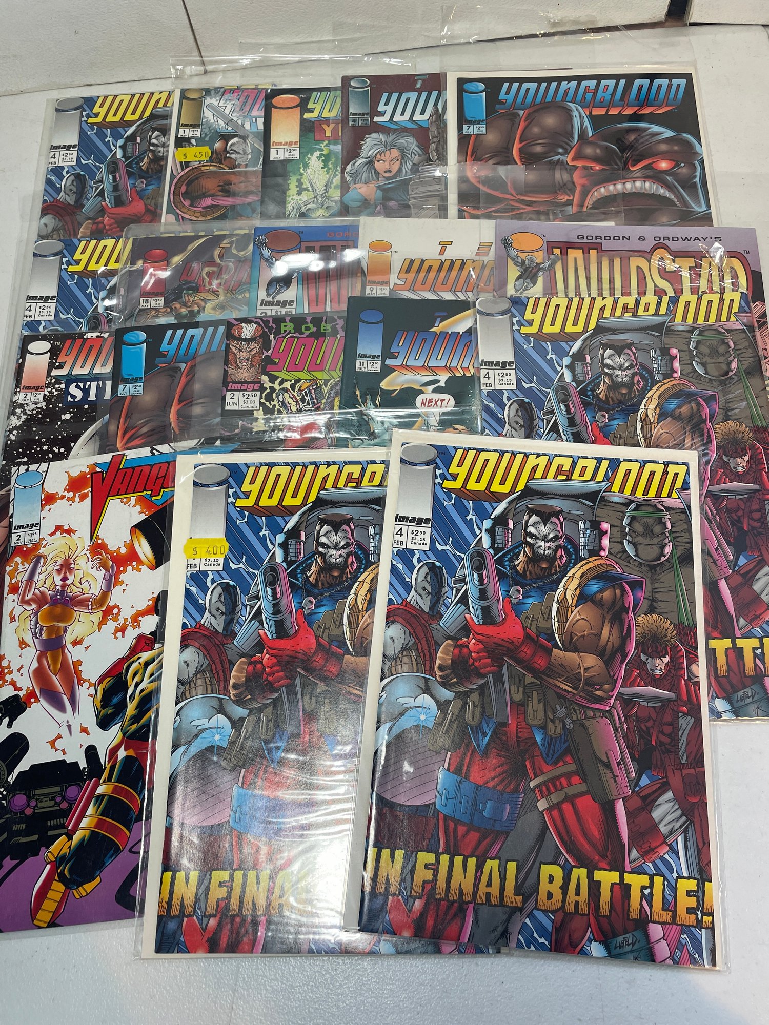 This is a lot of 18 image comic books. There are several duplicates as pictures. Some are bagged and boarded some are just bagged. They all seem to be in good condition!