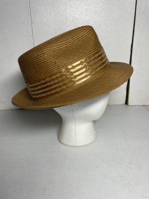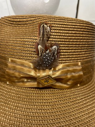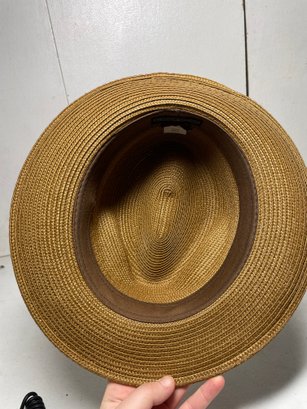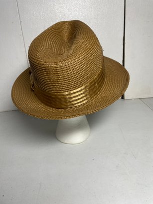 This is a beautiful Stacy Adams fedora hat. No stains or tears. It says it’s made of natural fibers and it’s a size medium. The brim measures 2”, the crown measures 4”, the circumference measures 22”.