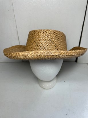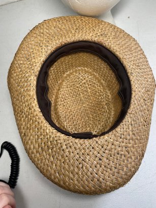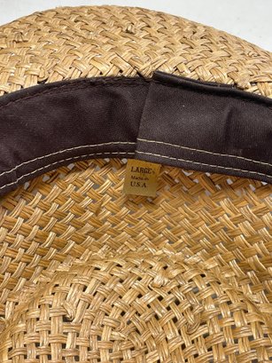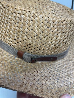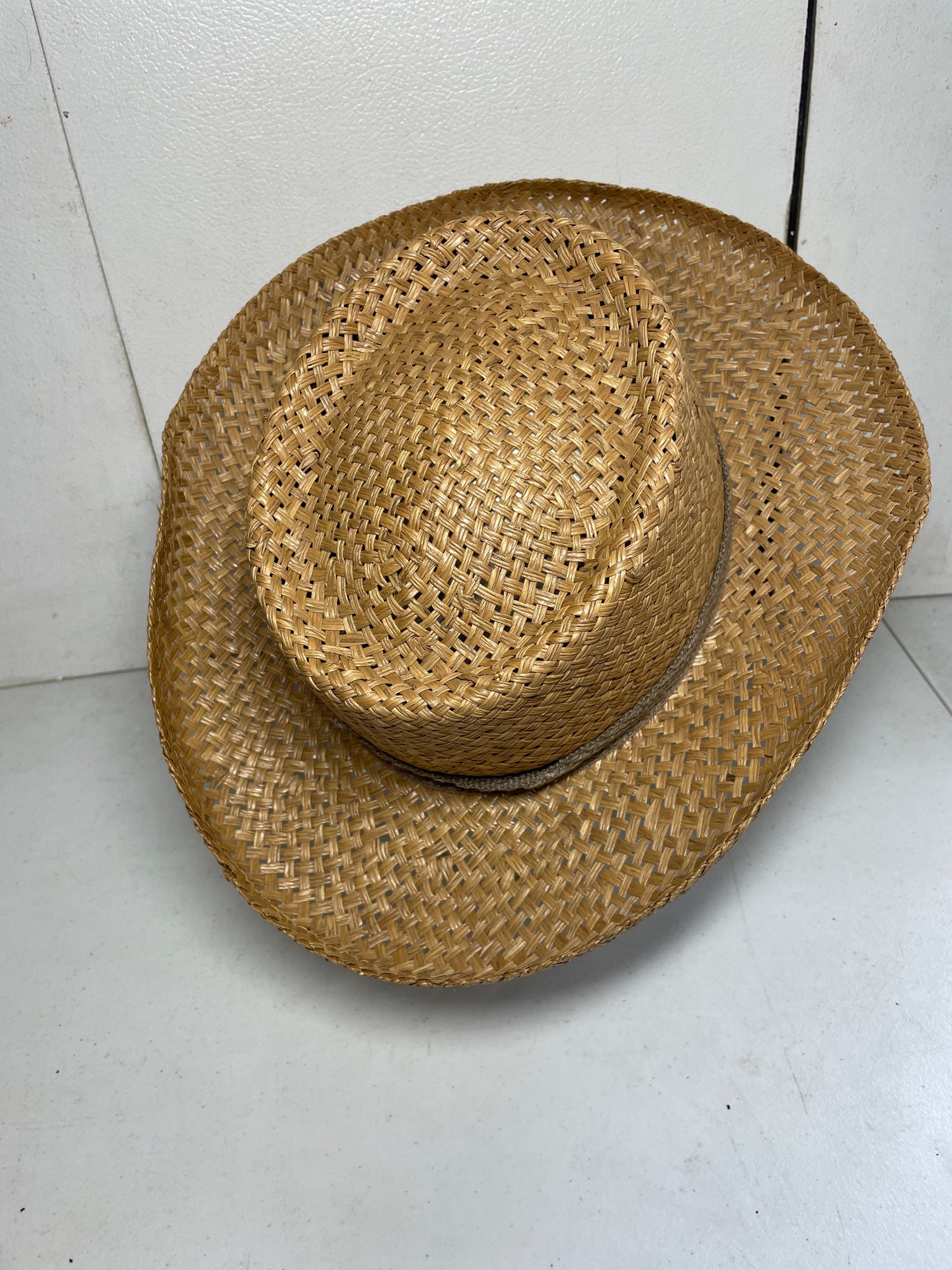 This is a nice men’s straw fedora hat. There’s no brand and no information other than size large and made in USA. The brim measures 3”, the crown measures 4”, and the circumference measures 24”.