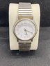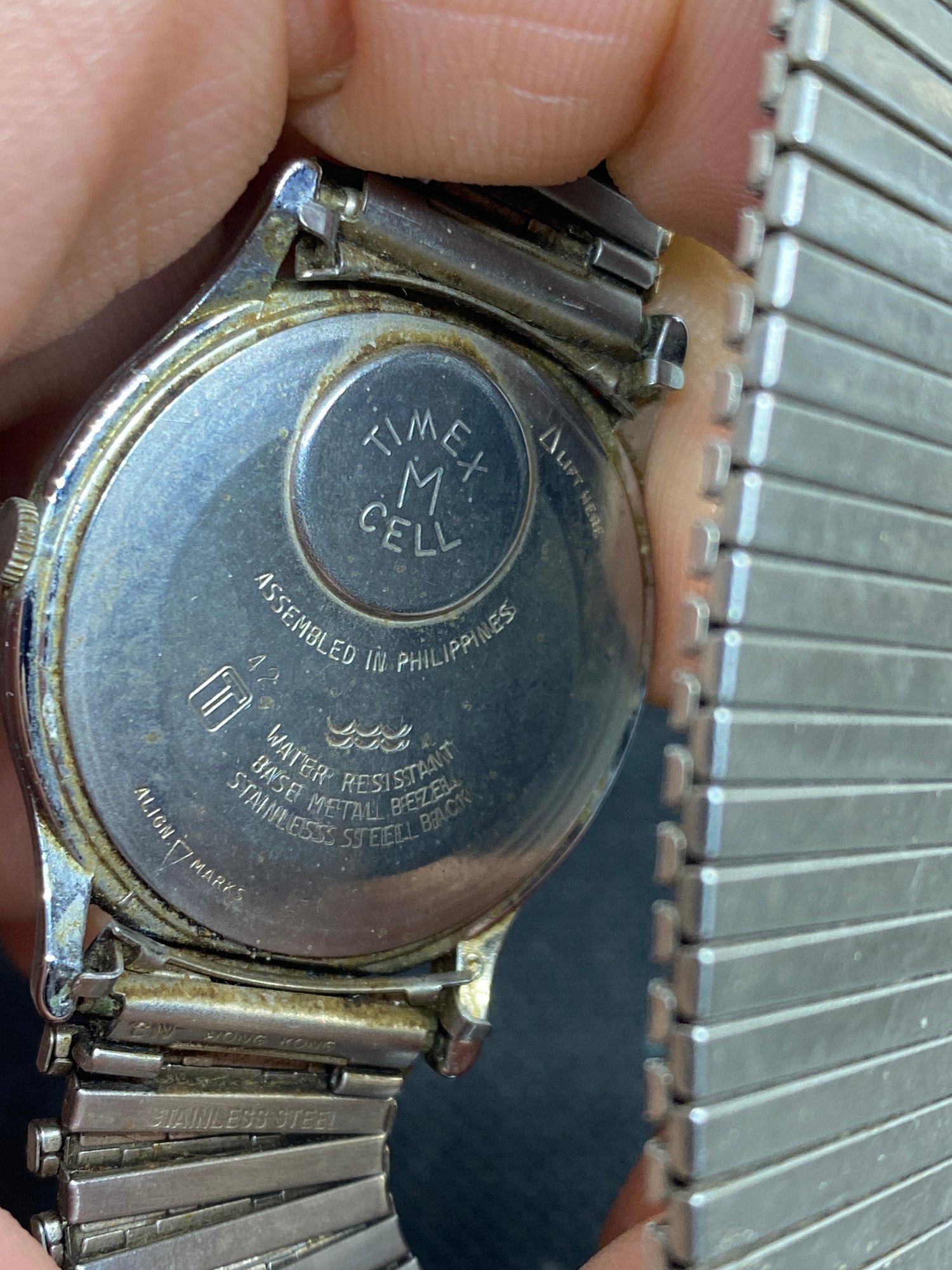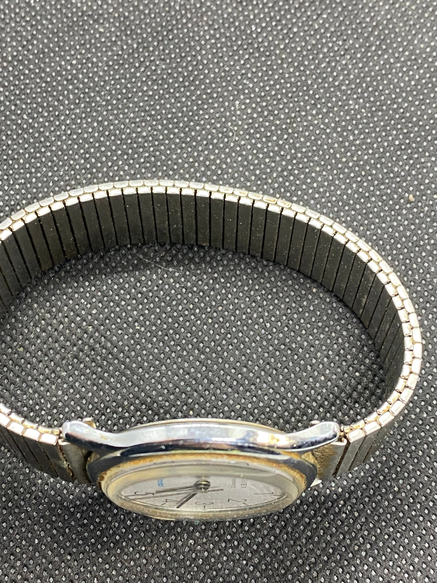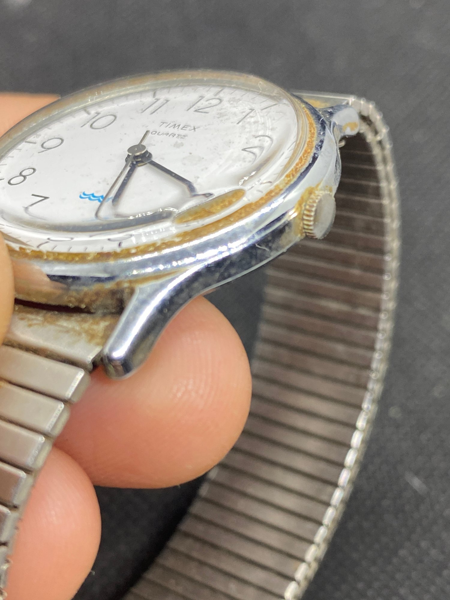 This watch is untested but most likely needs a fresh set of batteries. It has some dirt caked up in some areas but could be cleaned up. There is a small chip out of the bubble as well but doesn’t affect the use of the watch. It is a Timex brand.