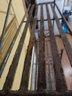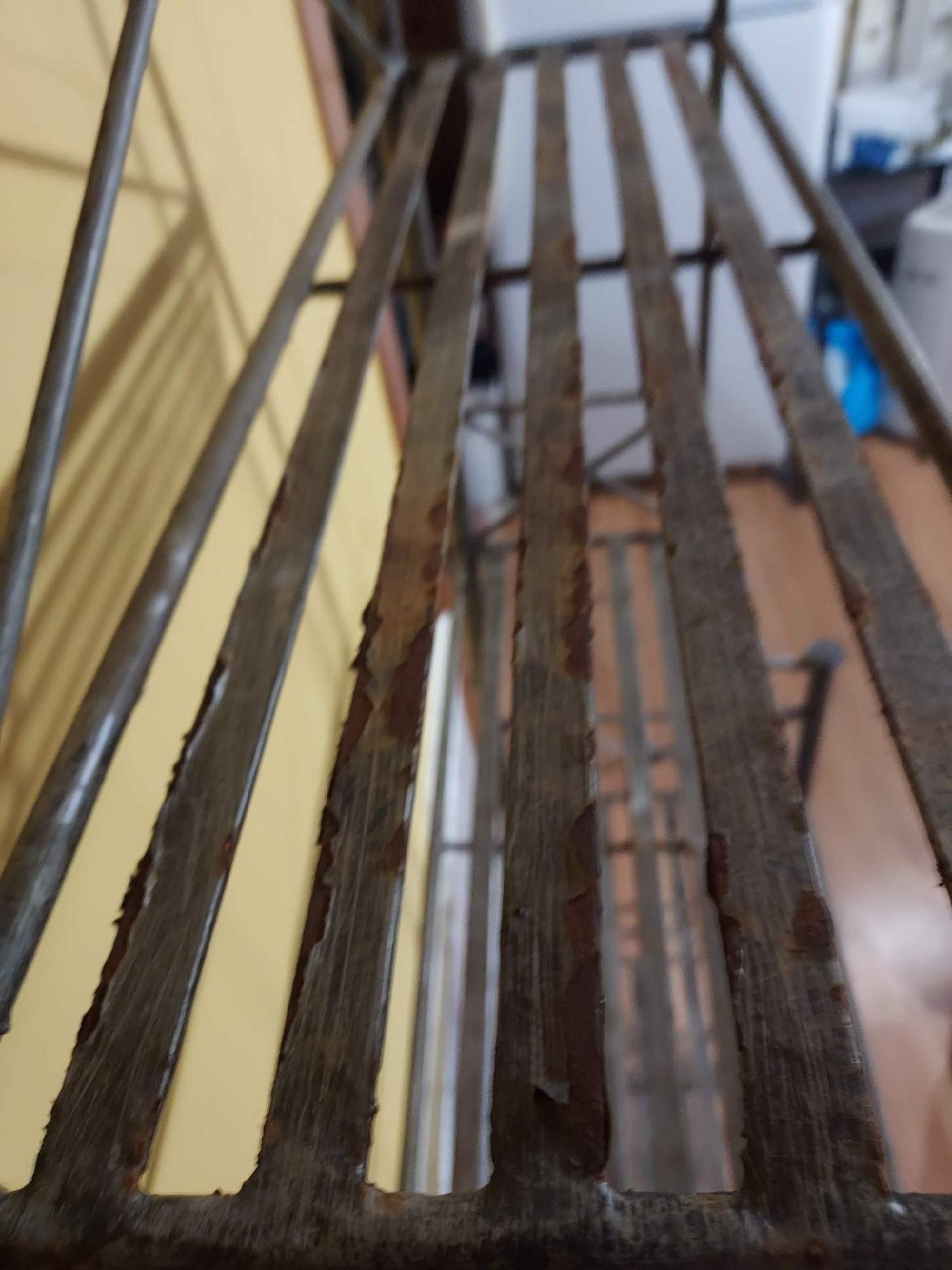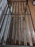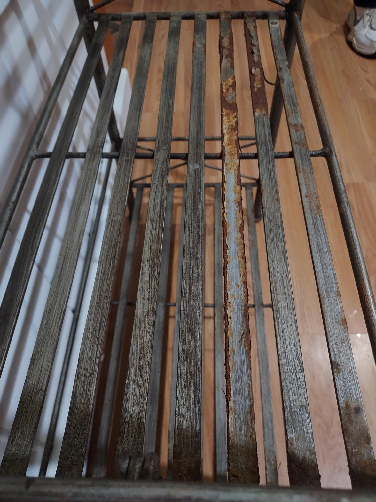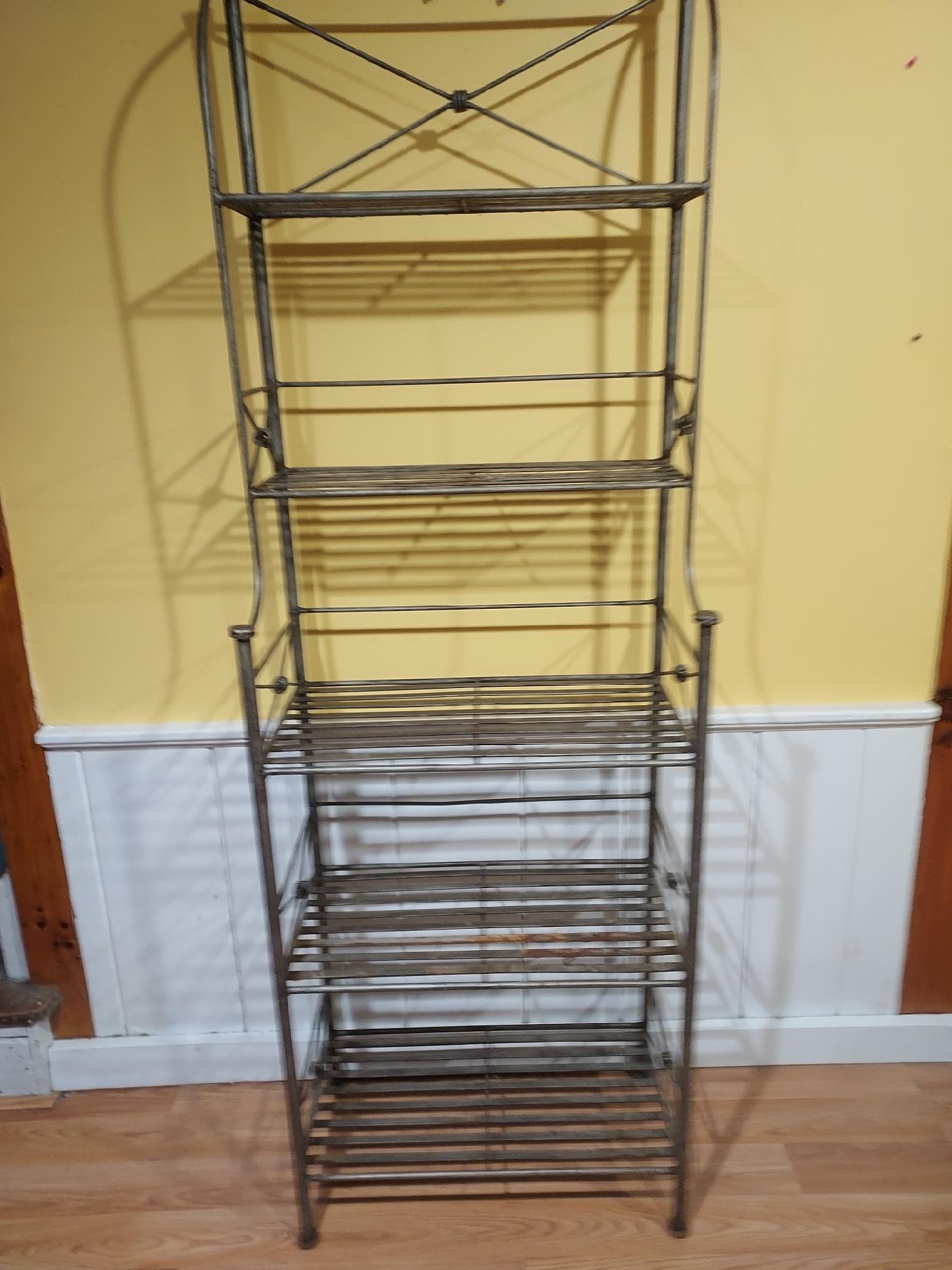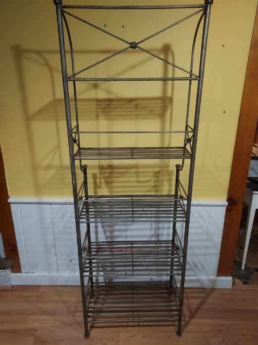 This is a wrought iron kitchen rack. It is in good condition other than some rust in some spots as shown in the pictures. It measures 24.25” wide, 3 shelves are 13” deep, 2 shelves 8” deep, and 72” tall.