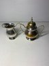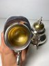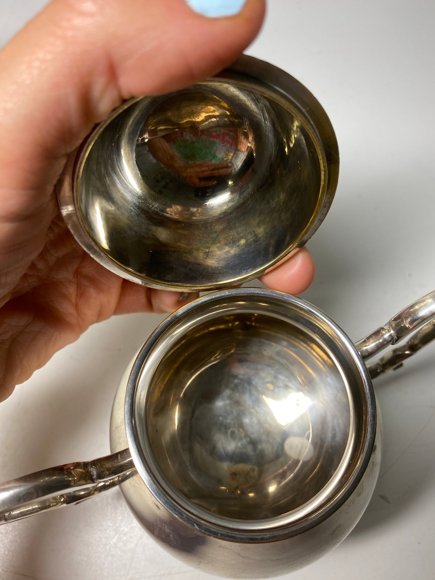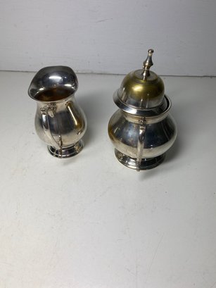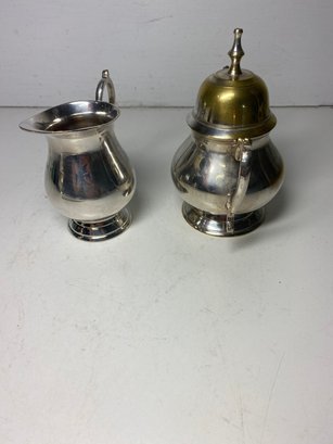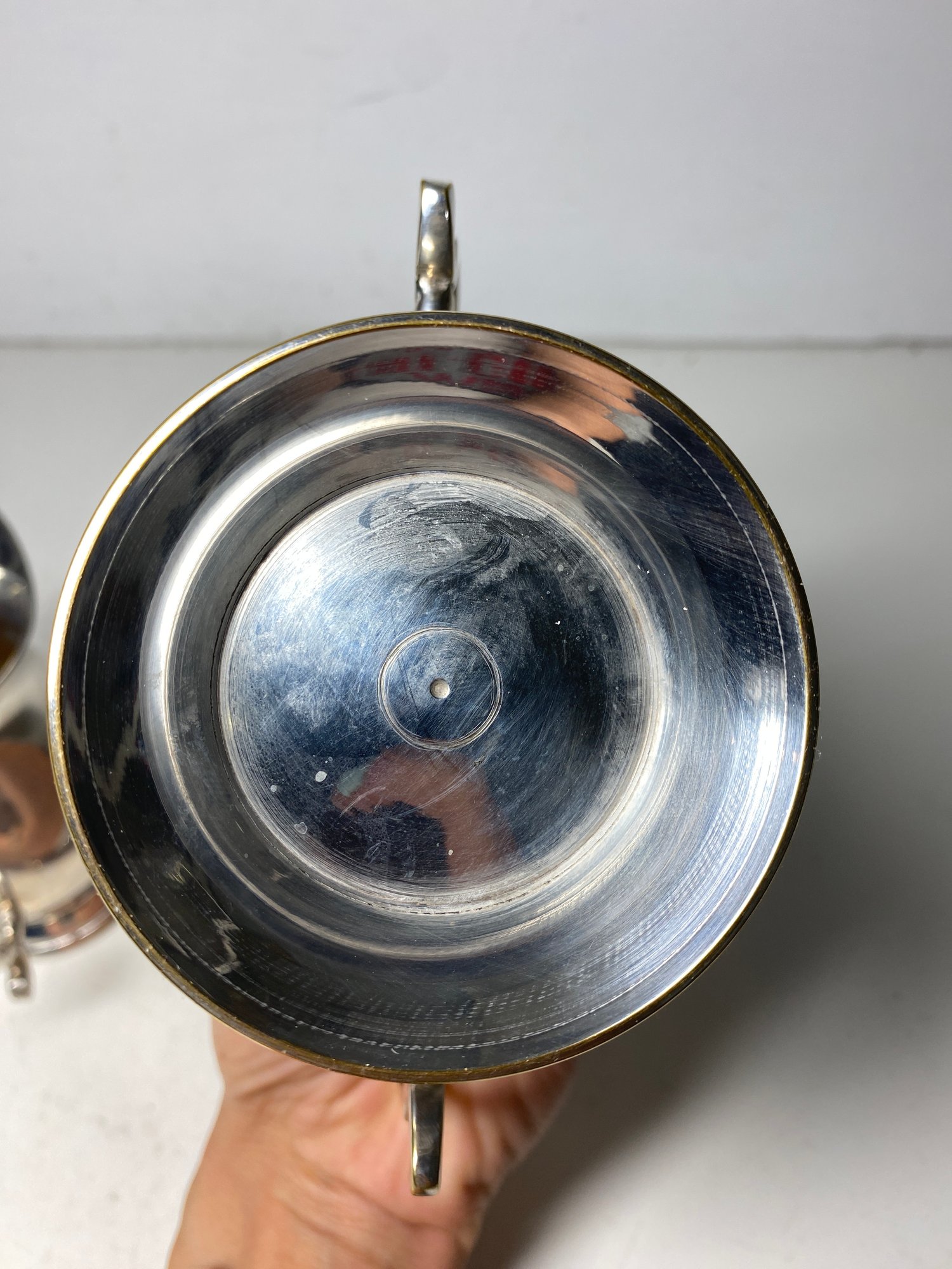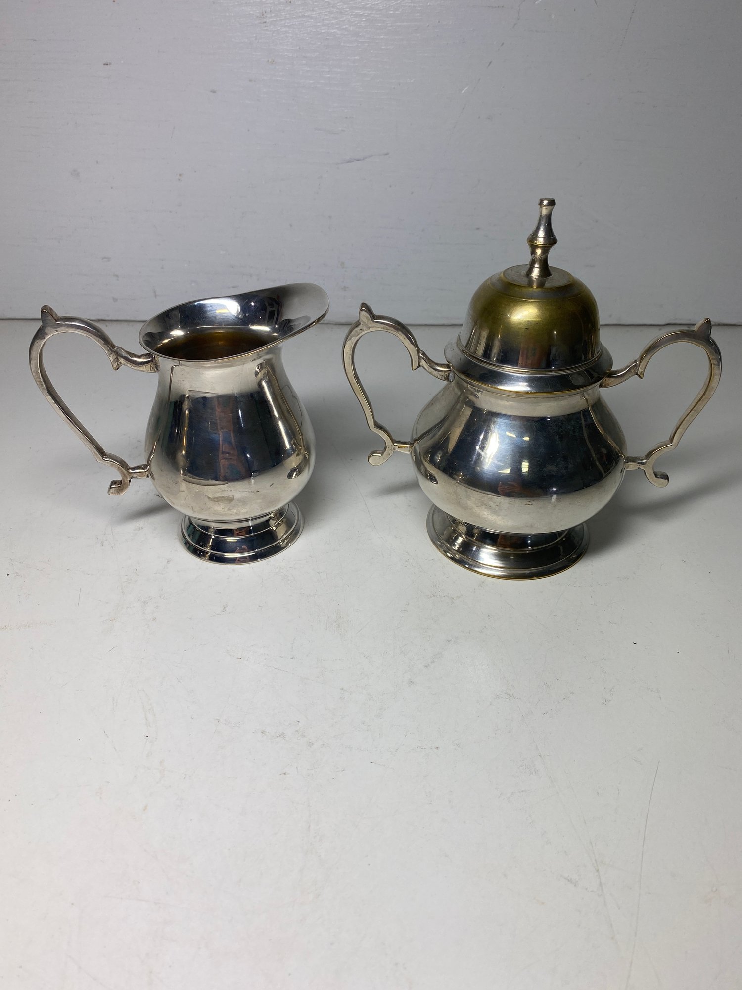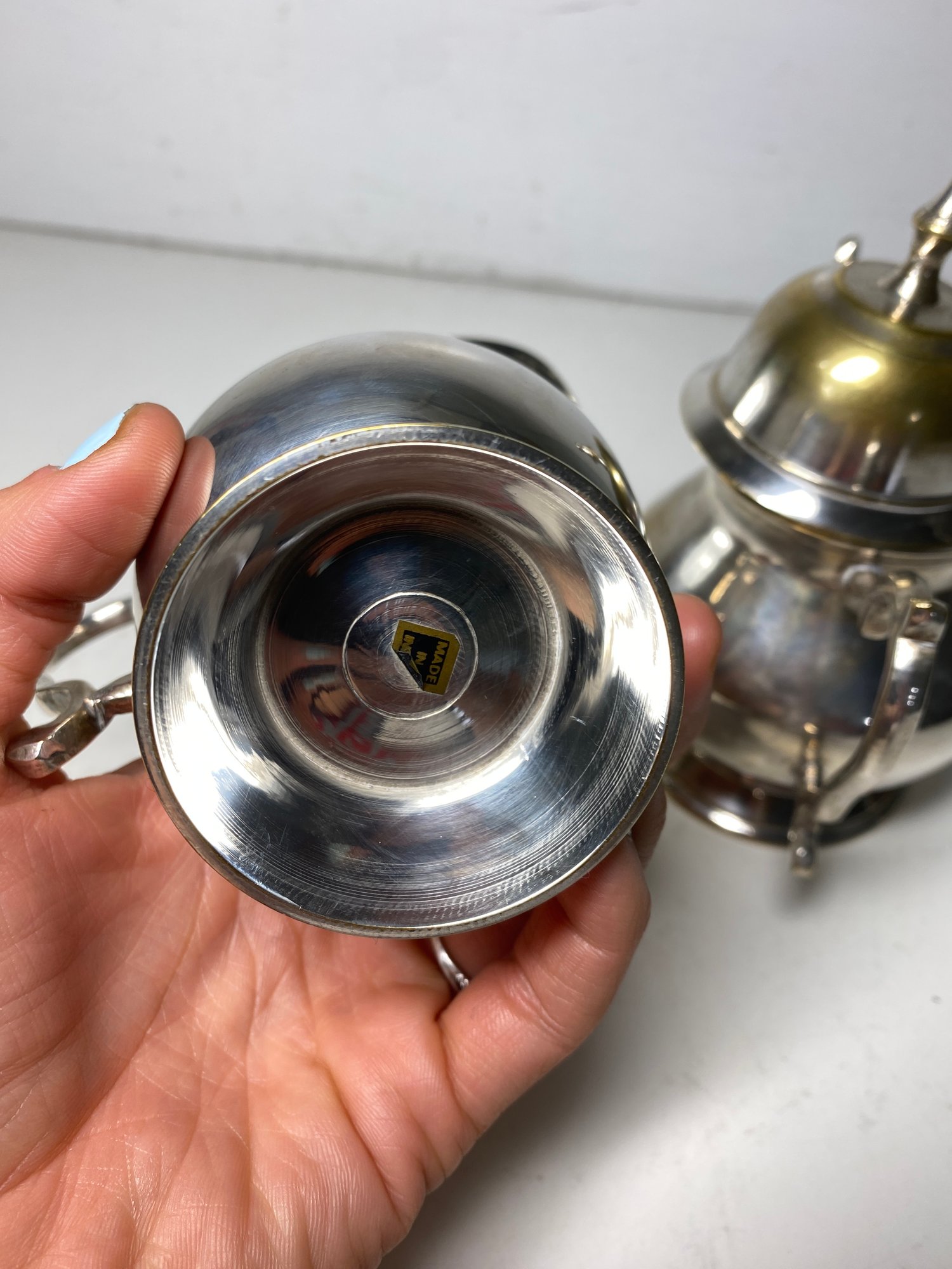 This set has some minor tarnishing and the brass is peeking through in some areas. The creamer has a made in India sticker on the bottom but the sugar bowl does not. Judging by the pattern this is definitely a set! The creamer measures 4.25” tall and 4.75” from handle to mouth of the creamer. The sugar bowl measures 6” tall including the lid and 6.5” from handle to handle.