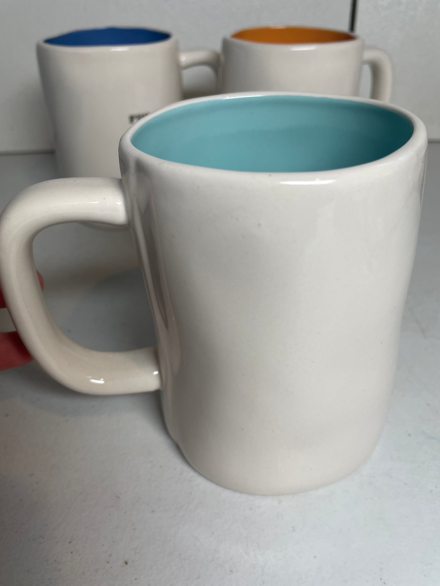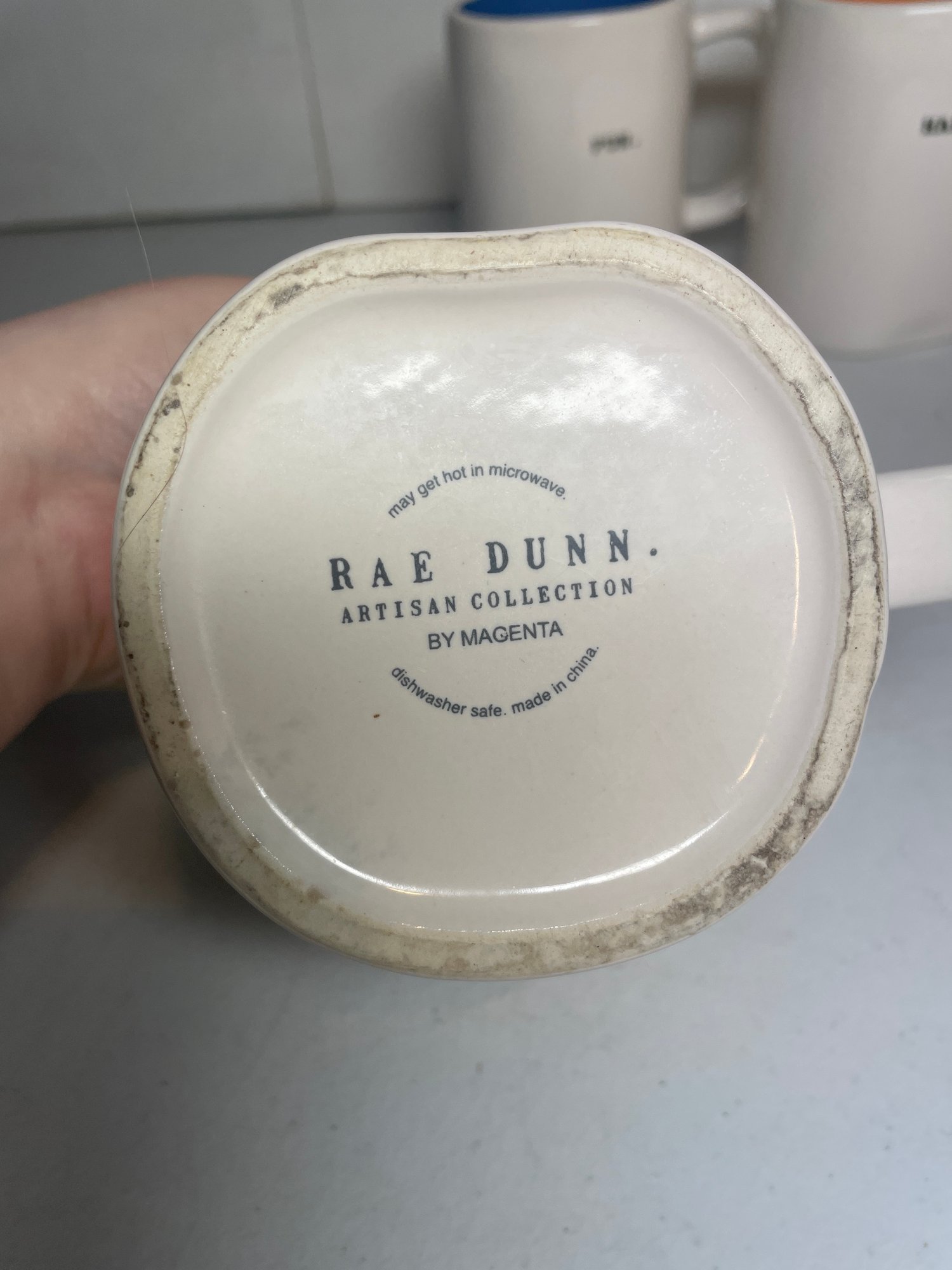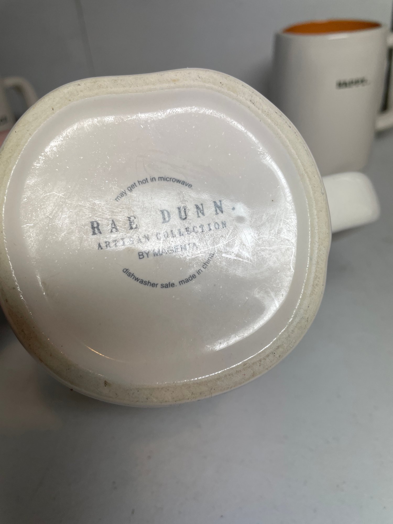 This is a nice set of 3 Rae Dunn mugs! They are in good condition with no chips, cracks, or breaks. They could use a little cleaning. They measure 5” tall and 3 1/2” in diameter.