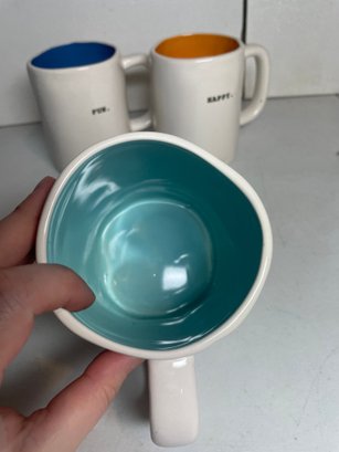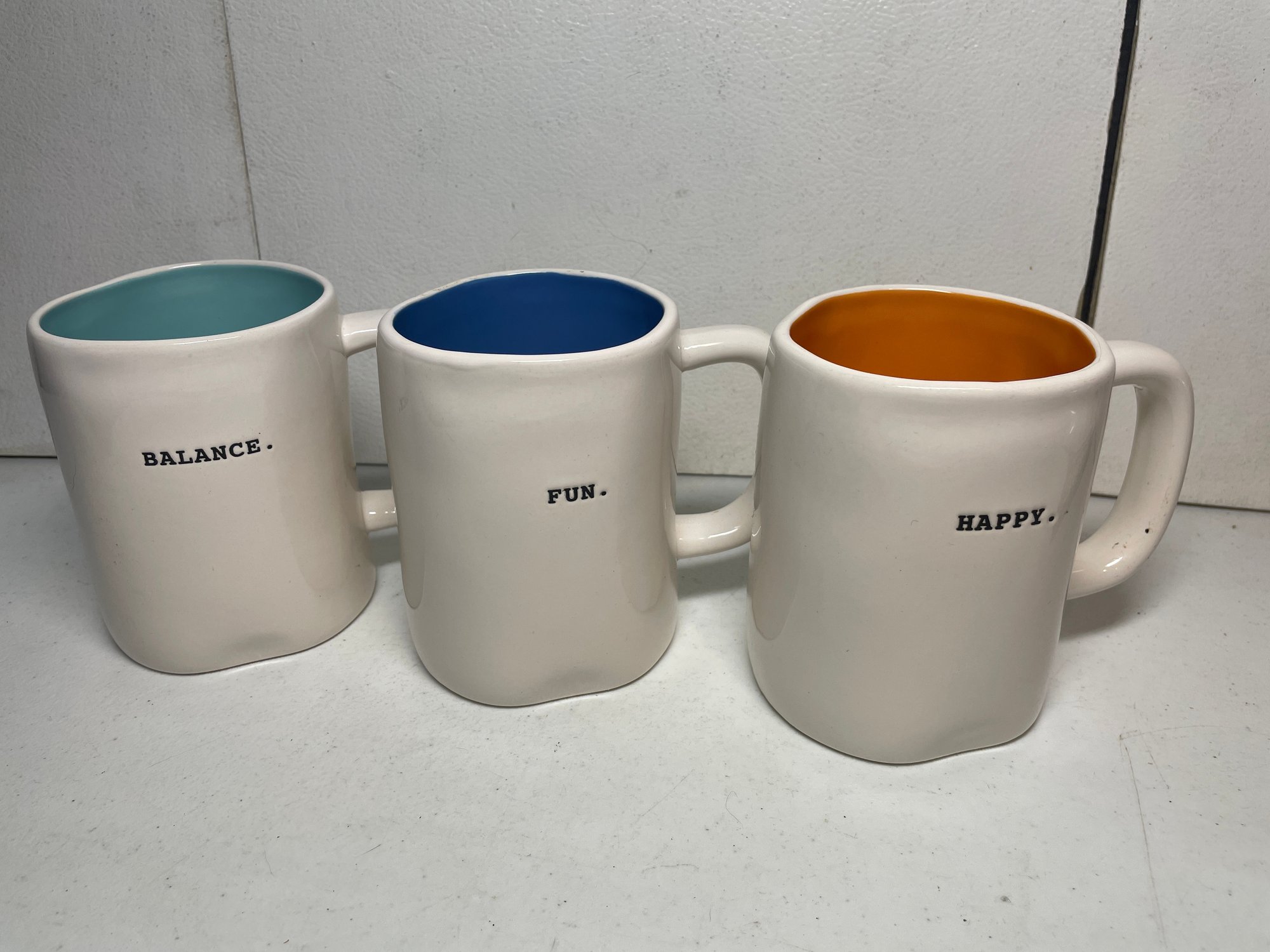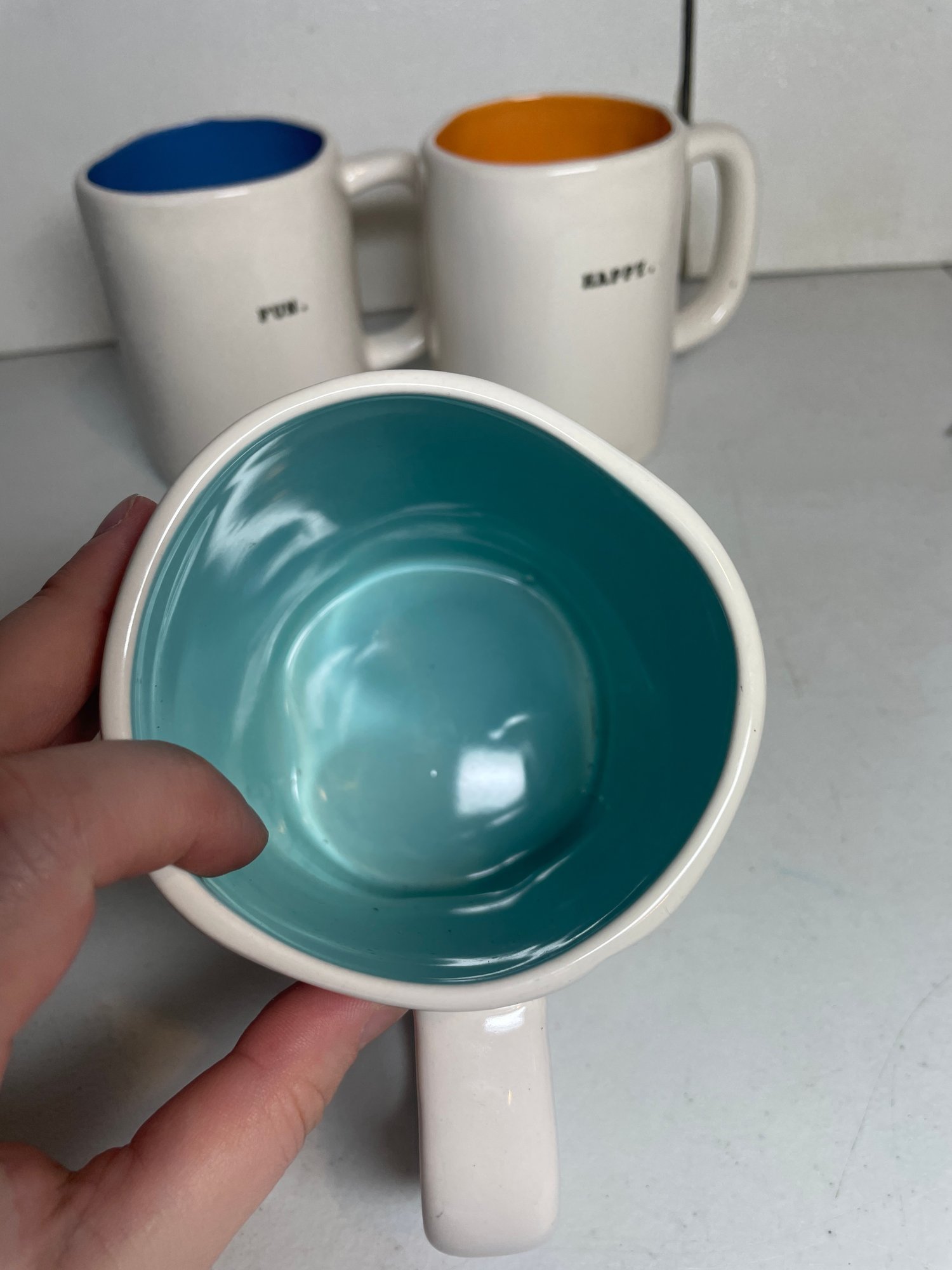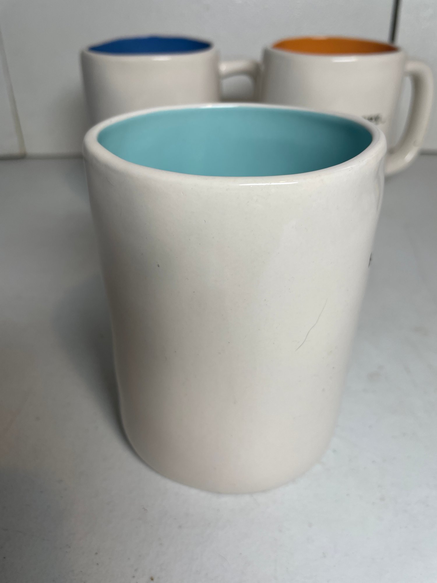 This is a nice set of 3 Rae Dunn mugs! They are in good condition with no chips, cracks, or breaks. They could use a little cleaning. They measure 5” tall and 3 1/2” in diameter.
