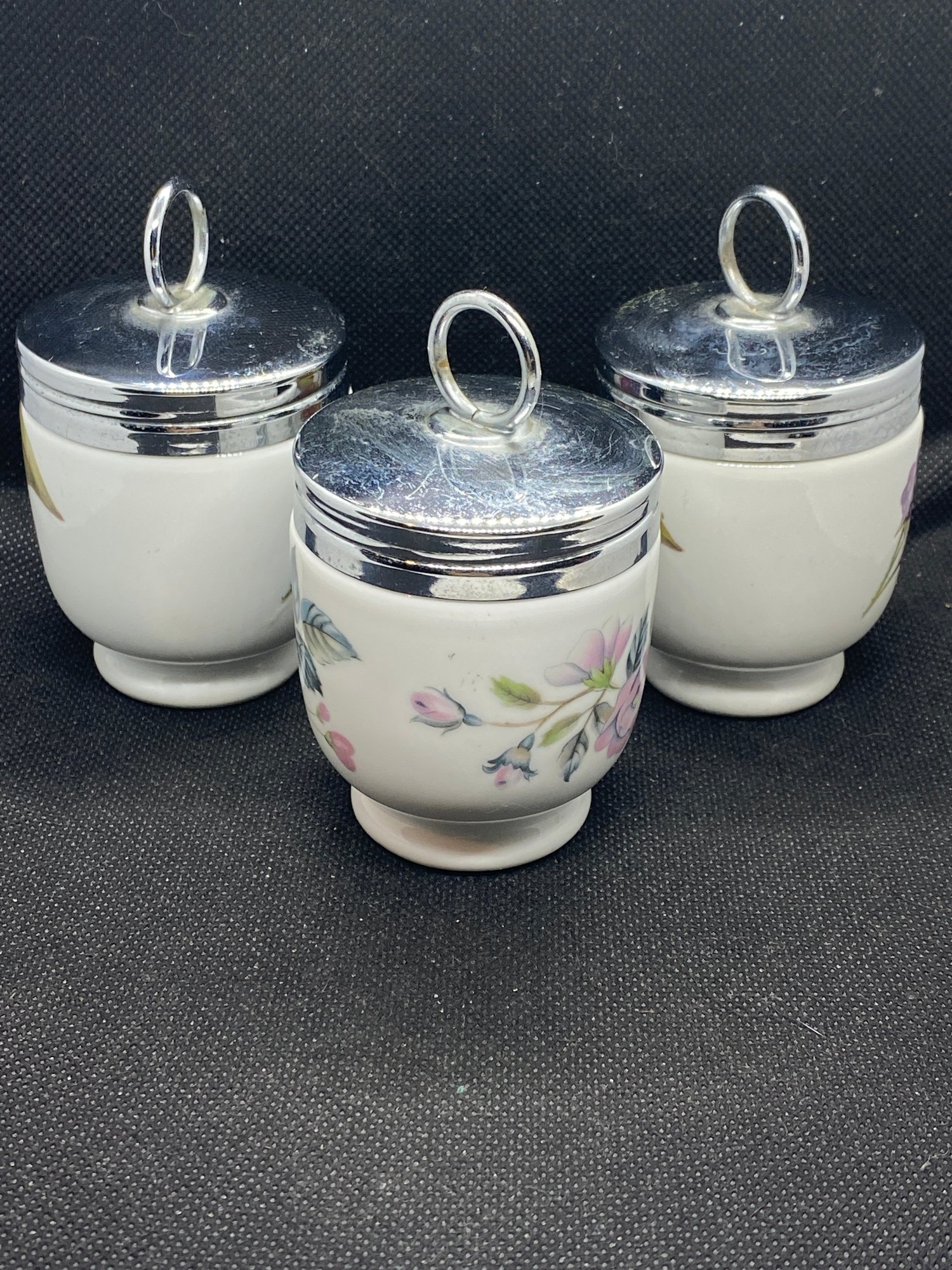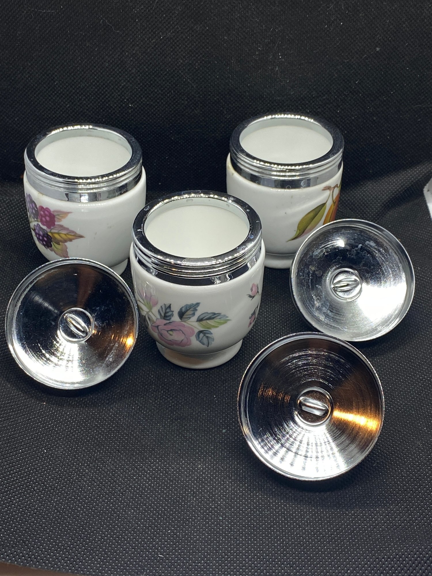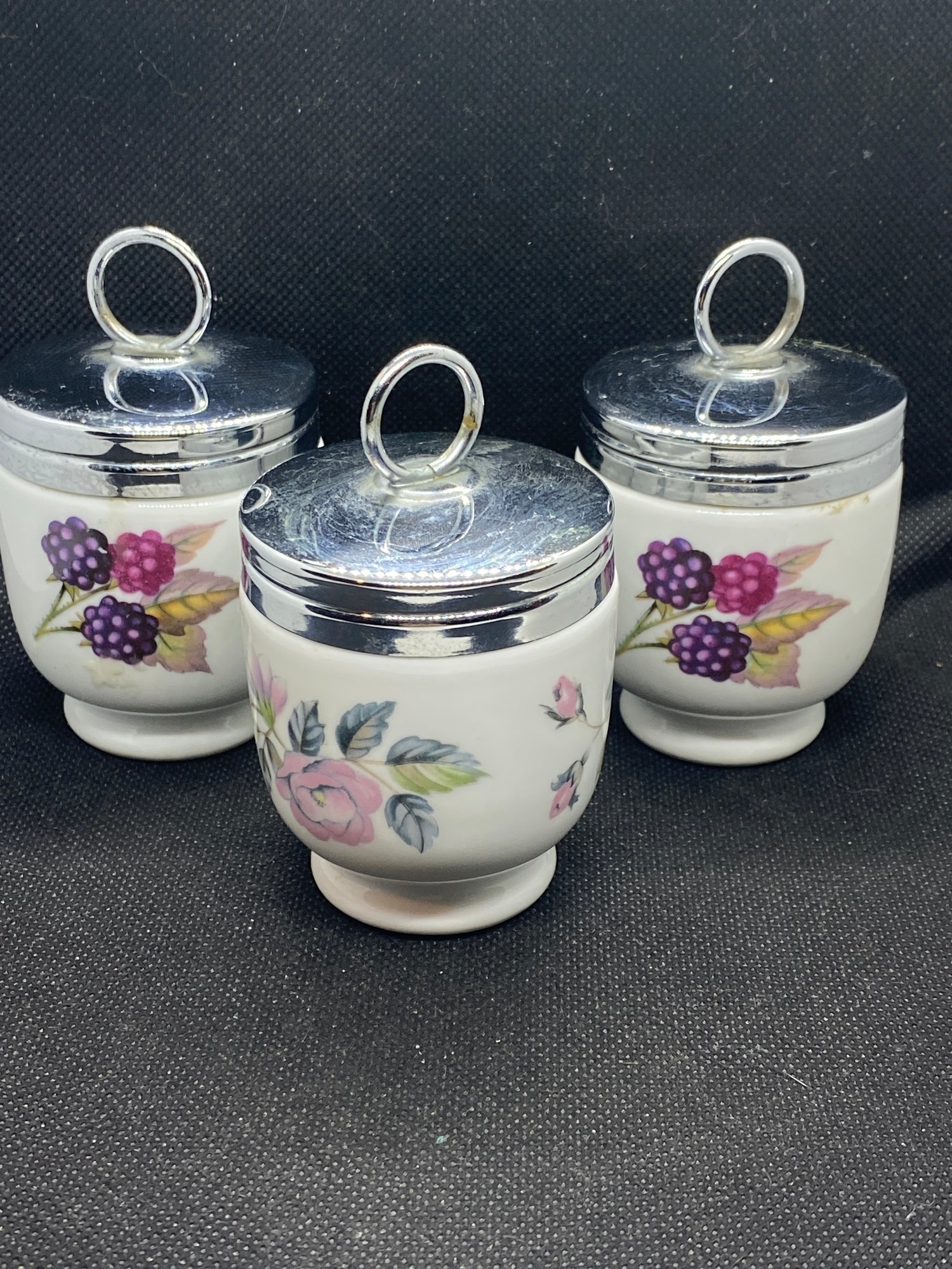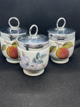 These egg coddlers are in beautiful condition with very minimal wear. There isn’t any cracks or chips and the lids screw on perfectly! They each measure 3.5” tall including the ring and 2.5” not including the ring.