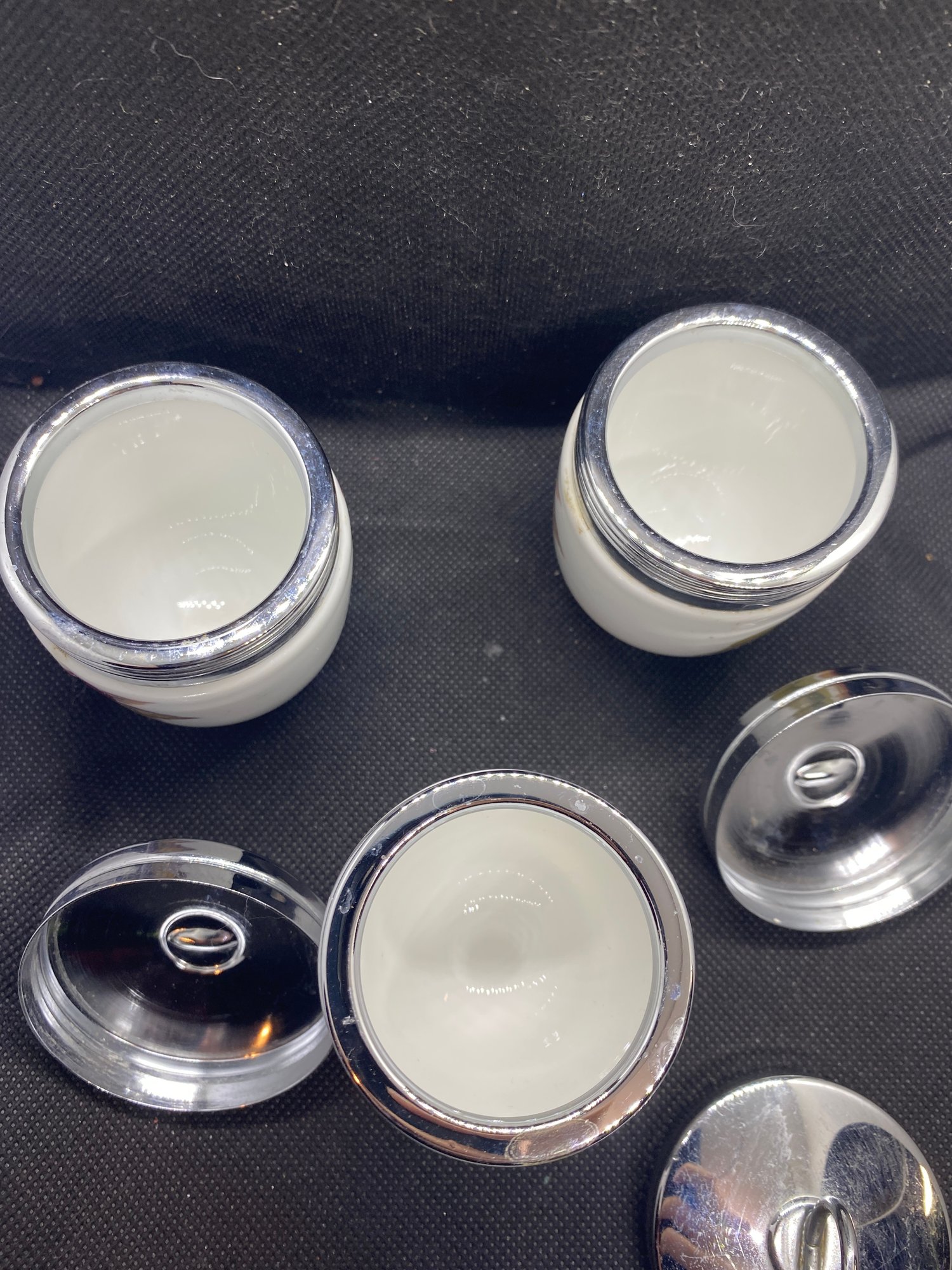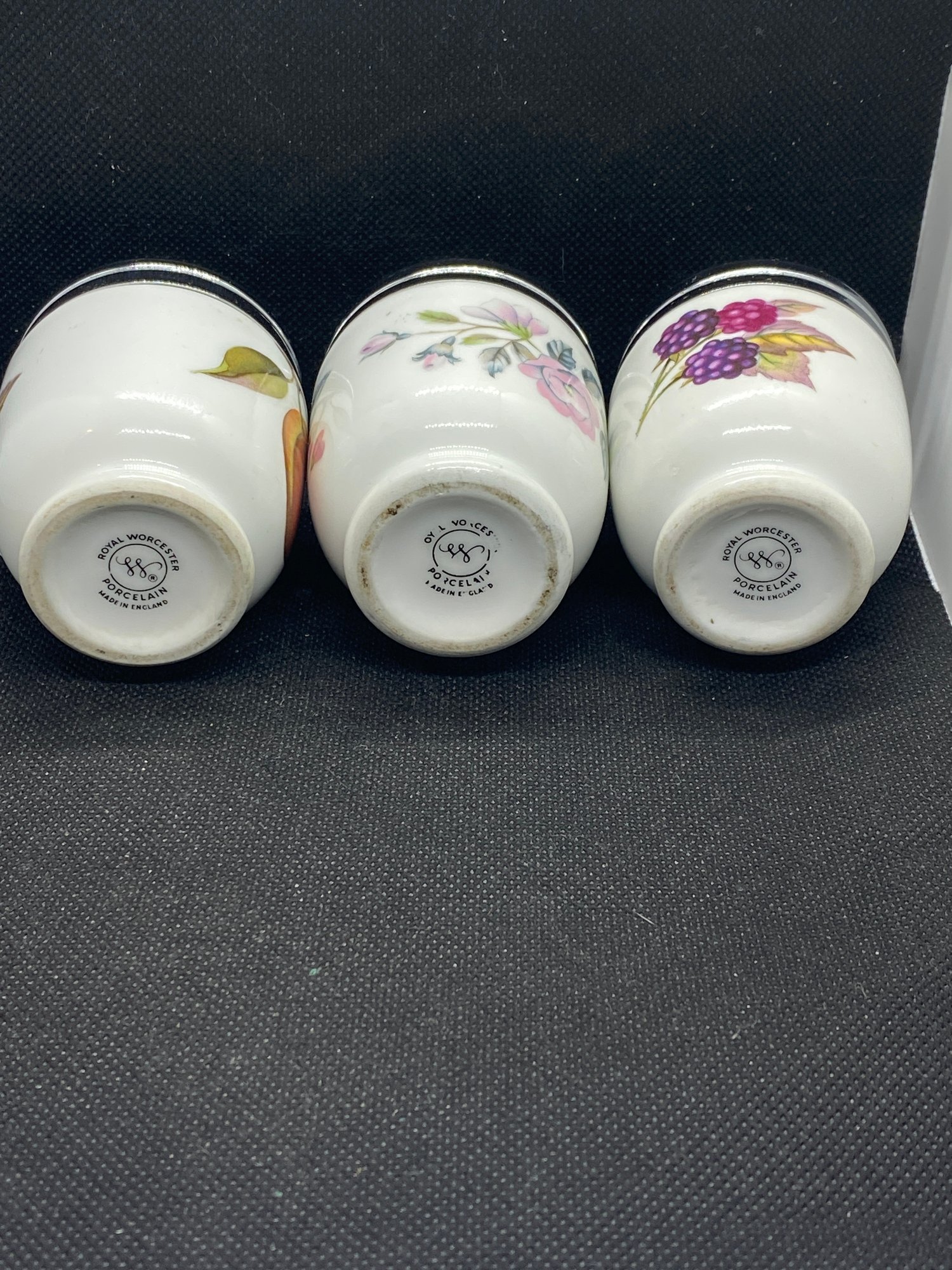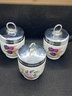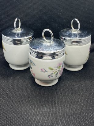 These egg coddlers are in beautiful condition with very minimal wear. There isn’t any cracks or chips and the lids screw on perfectly! They each measure 3.5” tall including the ring and 2.5” not including the ring.
