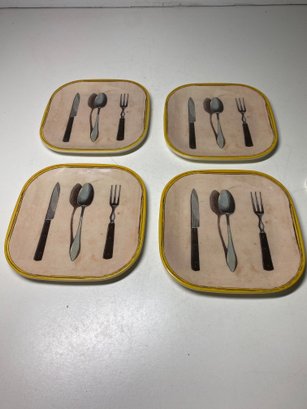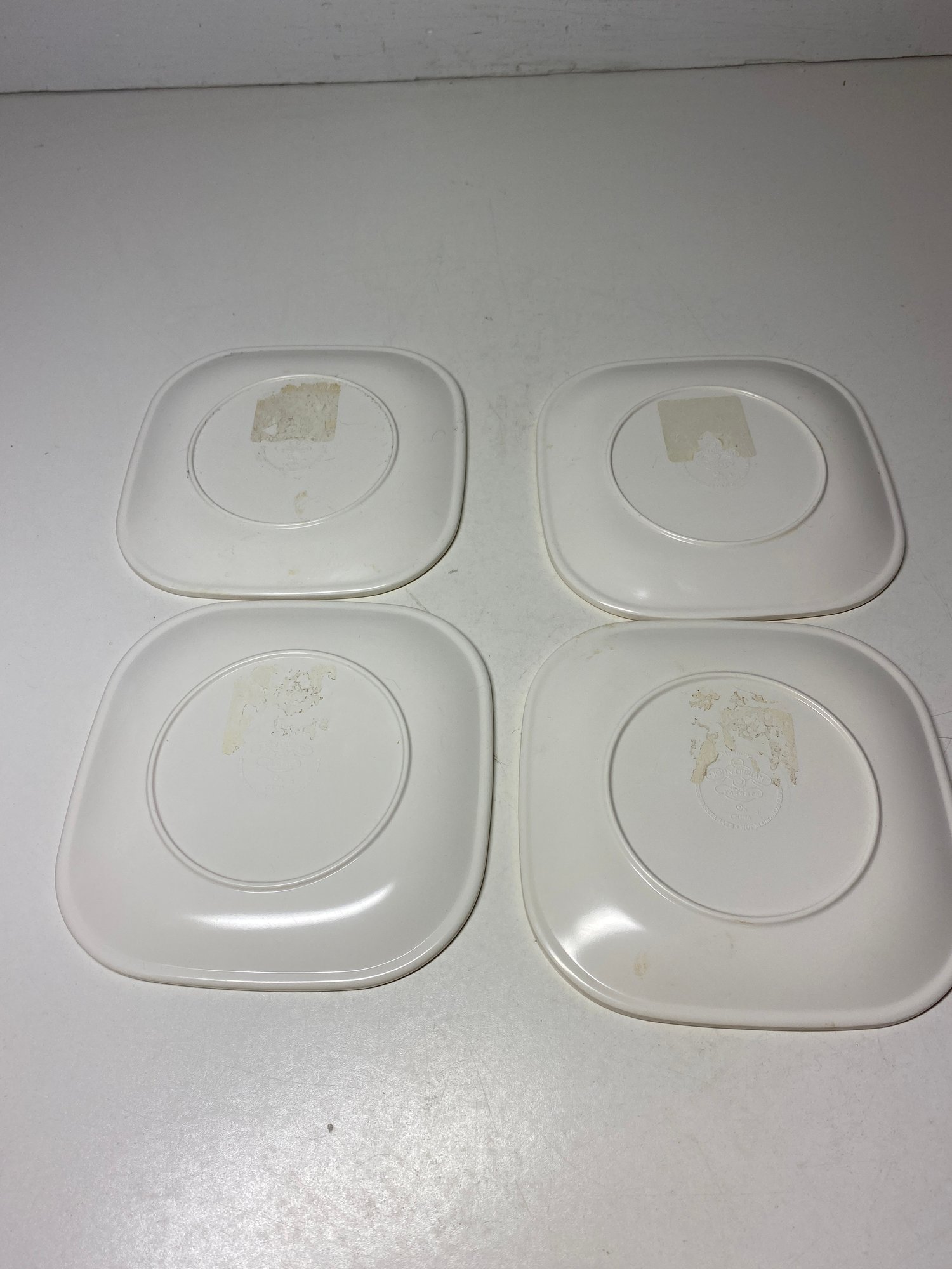 These plates have some minor discoloration and tape residue on the backs but otherwise they look like new! They each measure 6” squared and are marked “ melamine John Derain for target” on the back.