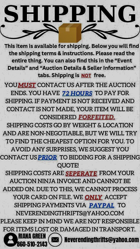 ~Shipping costs go by weight and location and are non-negotiable but we will try to find the cheapest option for you. To avoid any surprises we suggest you contact us prior to bidding to calculate your shipping cost. Shipping costs are SEPARATE from your Never Ending Thrifts LLC invoice and cannot be added on to the invoice.